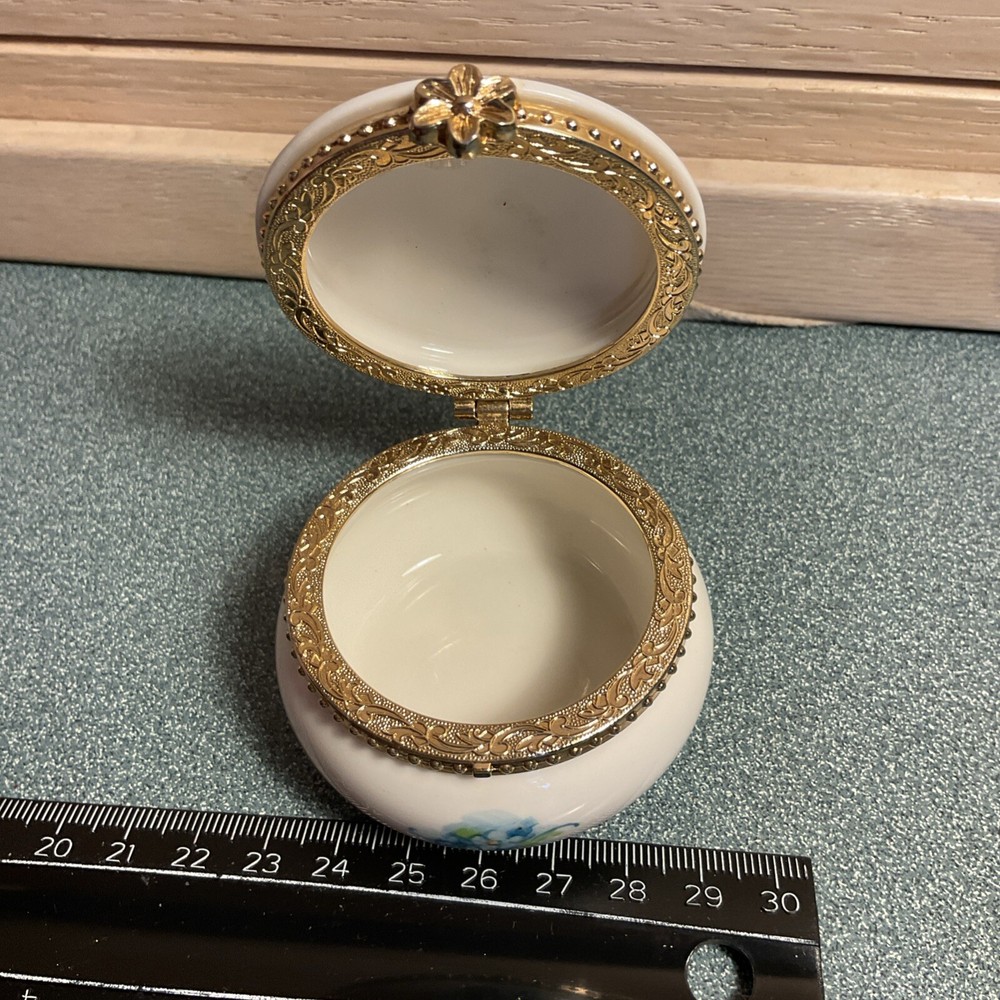 This vintage trinket box is a beautiful addition to any collection. The porcelain box features a round shape and a delicate floral pattern that is hand painted on the glossy surface. The box is small, measuring 2 inches in length, height, and width, and weighs 6 ounces. It has a press fastening closure and is suitable for all occasions. The trinket box is in excellent condition and is perfect for storing your precious items. It has a Victorian style and is a great collectible item. Clean the box with warm water and care instructions are included. The box is a multicolor and is perfect for any room in your home.