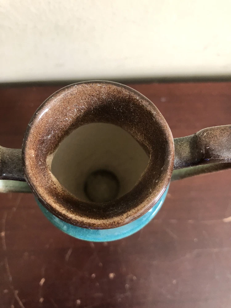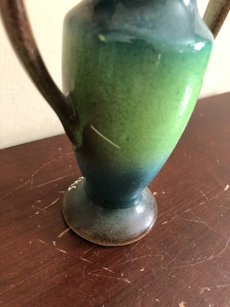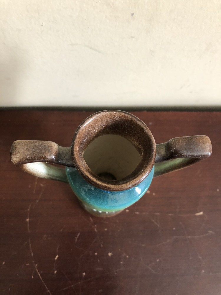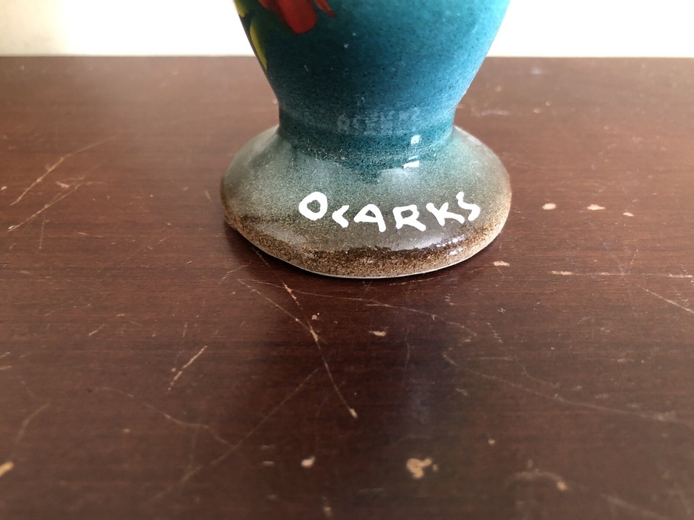 This vintage pottery vase is a unique piece with a multicolor hand-painted flower glaze design. Standing at 5 inches tall, it features dual handles and a glossy finish. The vase is signed by the artist, Ocarks, adding to its charm and authenticity. Made of ceramic using pottery techniques, this Arts & Crafts/Mission Style vase brings a touch of handmade artistry to any space.