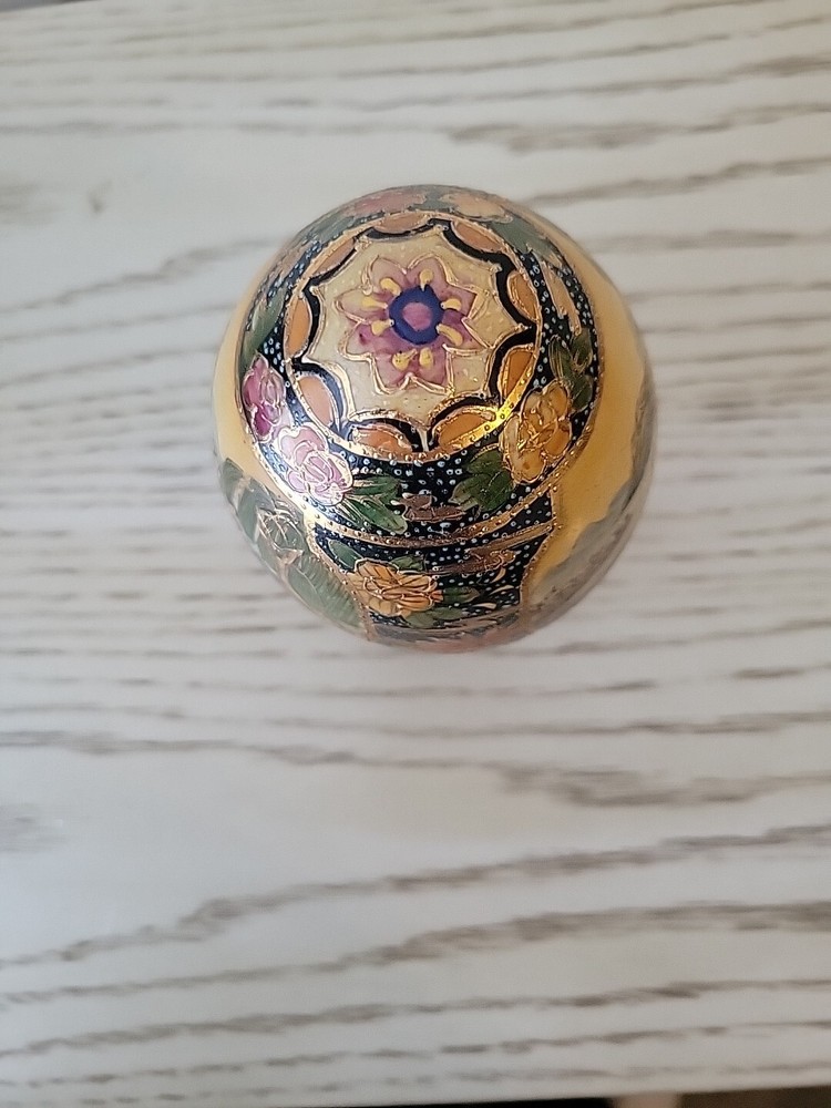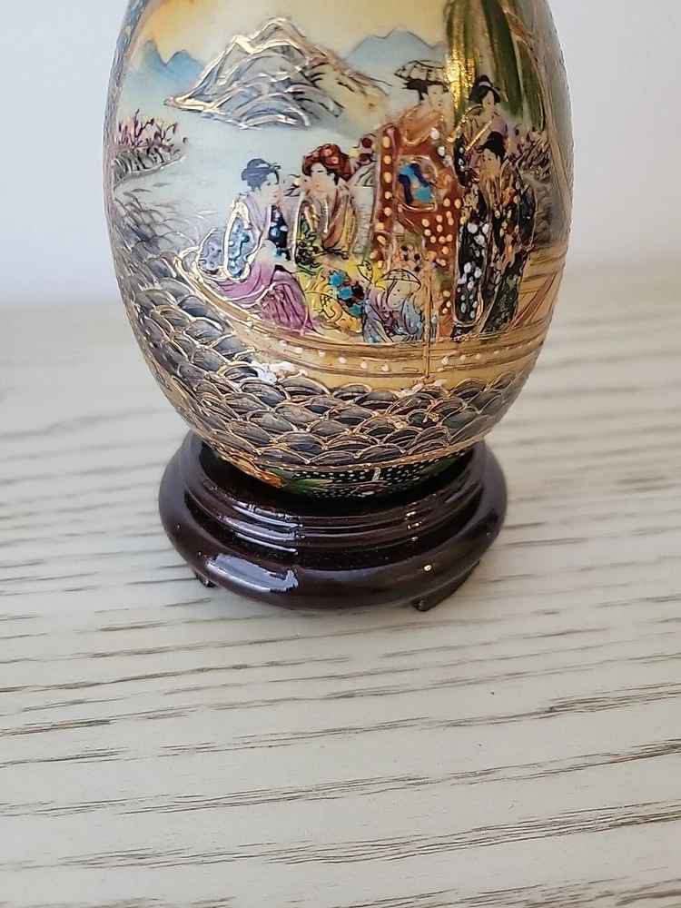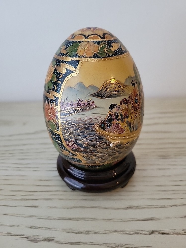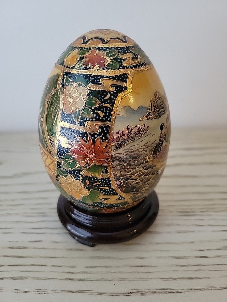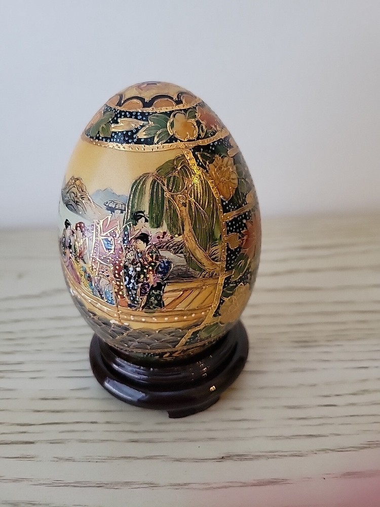 This vintage Chinese Satsuma porcelain egg is a stunning piece of artwork. Hand painted with intricate details, it features beautiful geishas and is adorned with gilt paint. Measuring at 4.5 inches, it is a perfect addition to any collector's display. The egg is in excellent condition, with no chips or cracks, and is sure to impress anyone who sees it. See all pictures for condition.