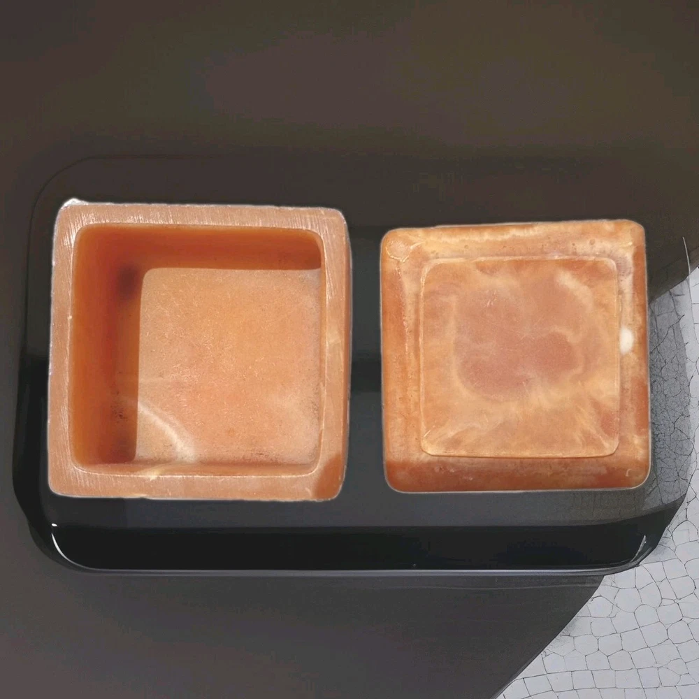 This vintage mini soapstone trinket box features a nautical theme with a lighthouse design, handcarved from metamorphic rock. The small square box has a matte finish in a shade of orange, with intricate carvings with a 3D effect, suitable for jewelry, trinkets, and keepsakes. With a 1970s style and nautical pattern, this unique piece is perfect for any room and would make a charming addition to any collection of decorative keepsake boxes. Please refer to pictures for condition details.