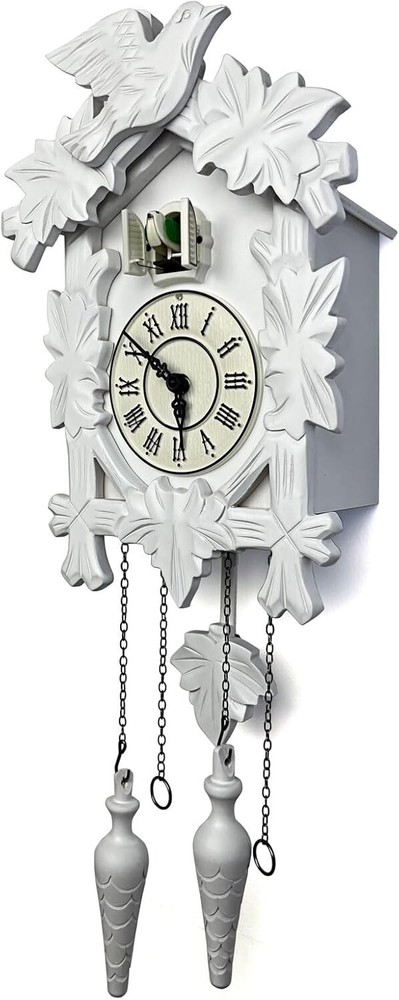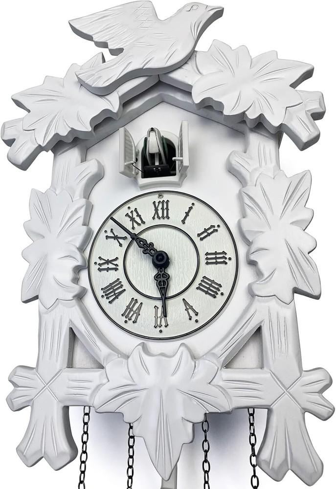 Cuckoo Clock Vintage Large Wooden Wall Clock Handcrafted Inch White Made of linden wood with hand-carved decorations. The bird comes out and sings 'co co' every hour. Detailed instructions on how to set the chime and time are available on the product description page. Two LR20/D batteries Operated (not included) Automatic Night Shut Off Sensor -- night silencer. Adjustable Volume - (High, Low or Shut off) Net size: 13"H x 9-1/2"w x 5-1/4" D Handcrafted Vintage Wood Cuckoo Wall Clock: A charming decoration for your home. All are fitted with manual volume control and shut off switch. One thing that is unique about same quart cuckoos is that it has a photo-cell which is light sensor so you also have an automatic night shut-off When you turn your lights off at night, it automatically turns off the cuckoo call. During the call if cuckoo the double doors open and the cuckoo bird comes out, With same models the cuckoo bird actually flaps his wings as he cuckoos to the sound of running water in the background. The call itself is the acutal recording of a cuckoo bird in the wilds.