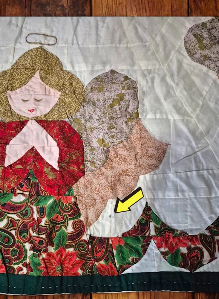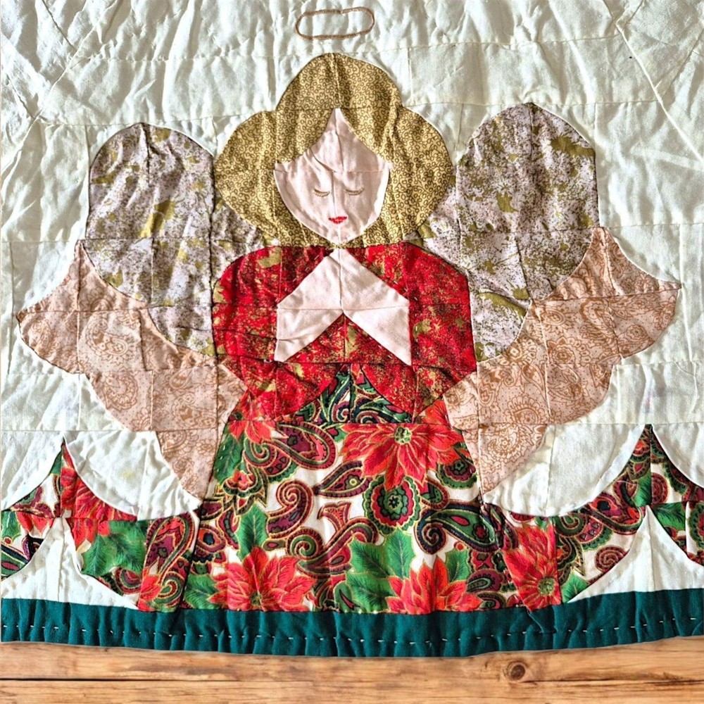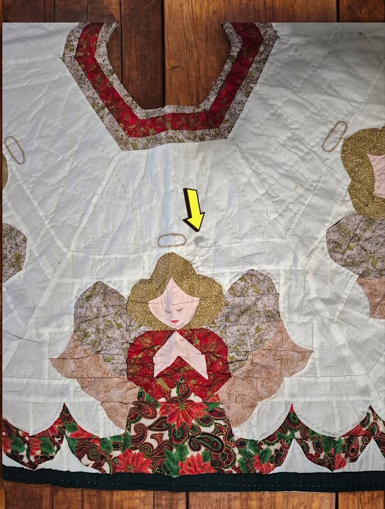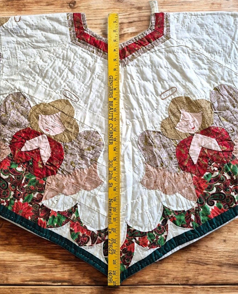 Large 54" hand-made vintage 1950's-1970's Christmas Tree Skirt. Features a patchwork quilt angel design in a hexagon shape. Very nice vintage pre-owned condition. Please note ... it does have a few stains on front and back. I have them marked with a yellow arrow in photos.