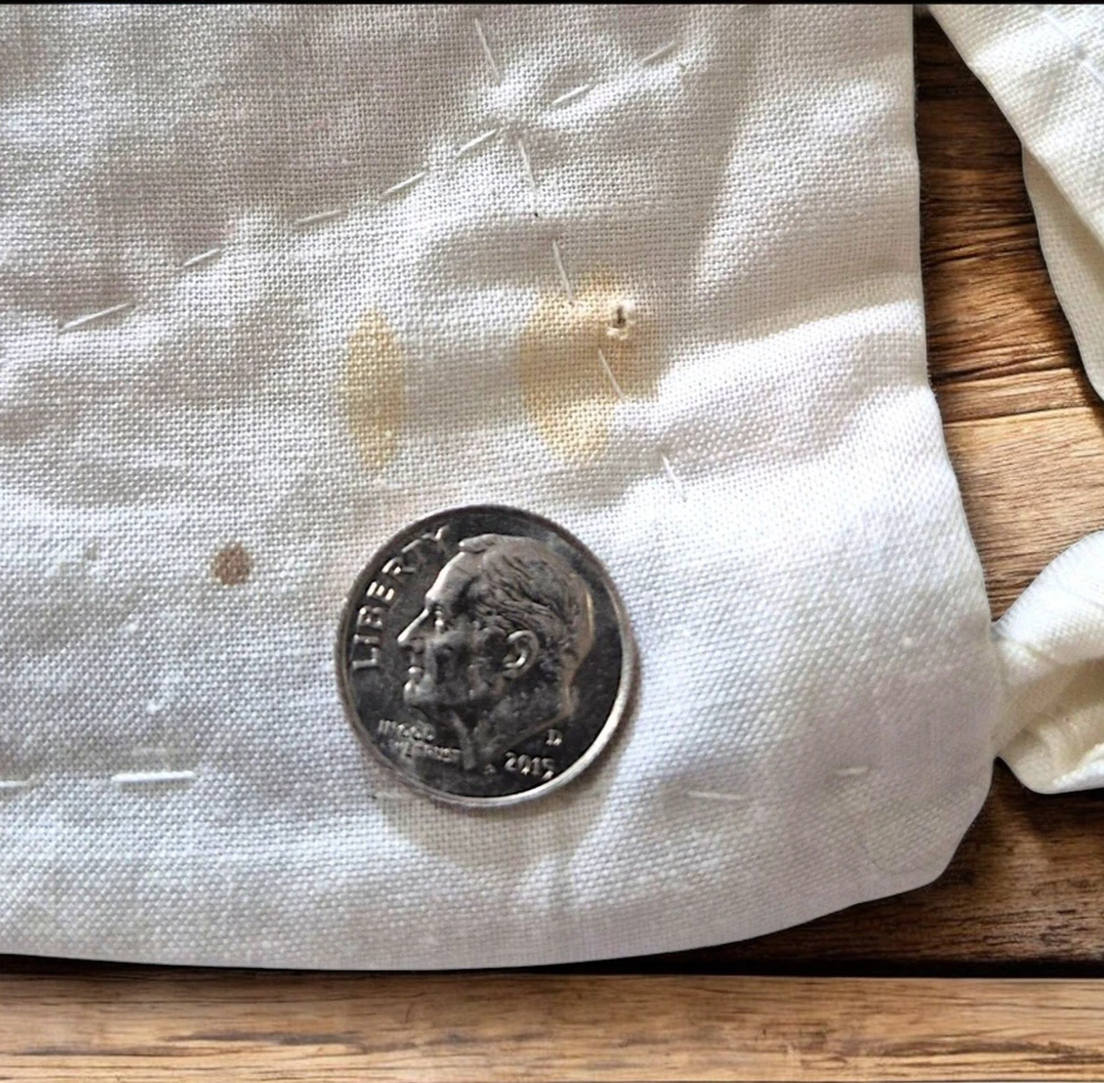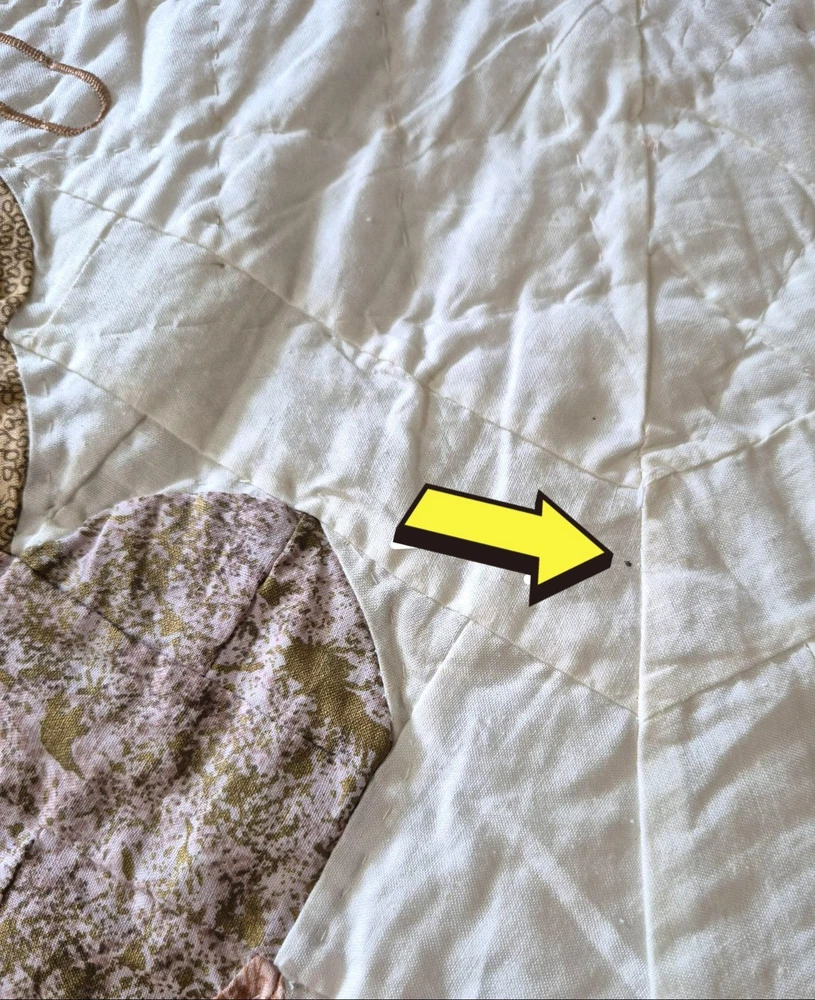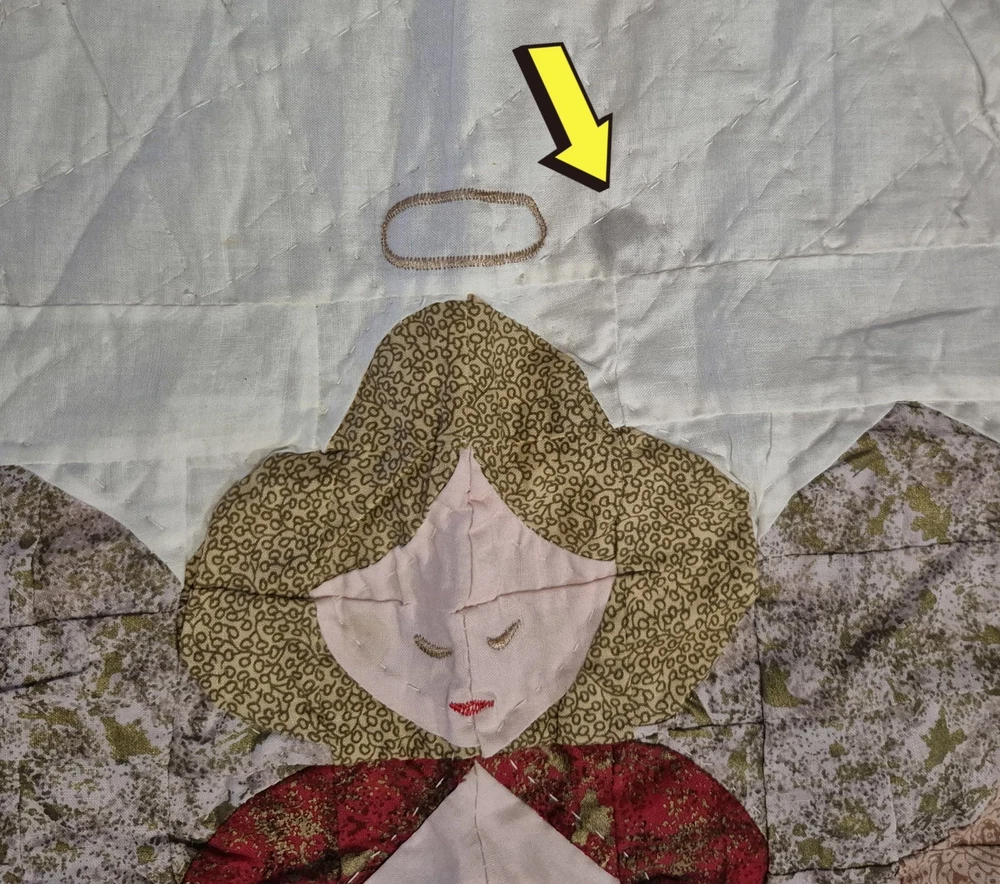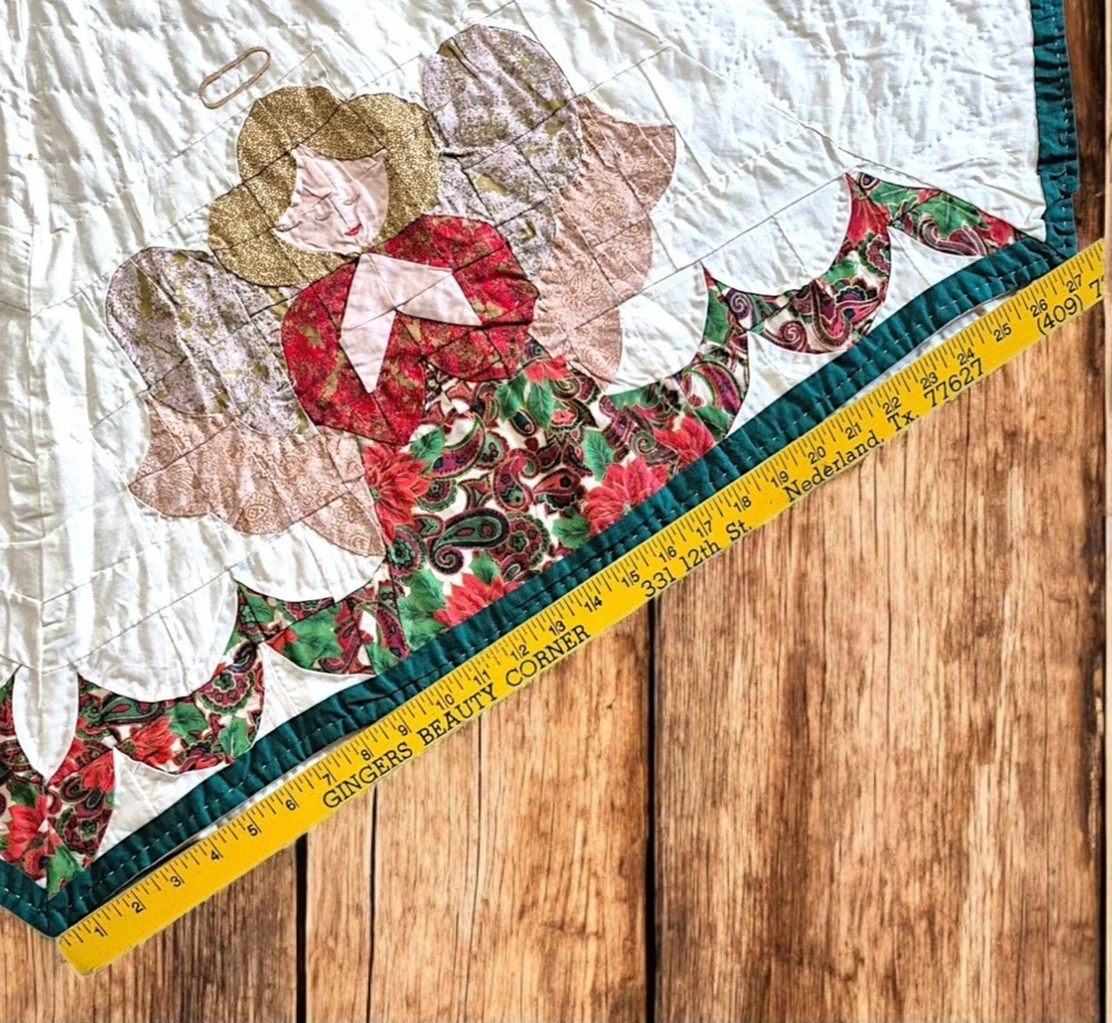 Large 54" hand-made vintage 1950's-1970's Christmas Tree Skirt. Features a patchwork quilt angel design in a hexagon shape. Very nice vintage pre-owned condition. Please note ... it does have a few stains on front and back. I have them marked with a yellow arrow in photos.