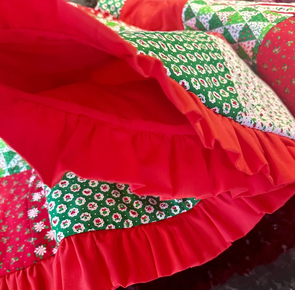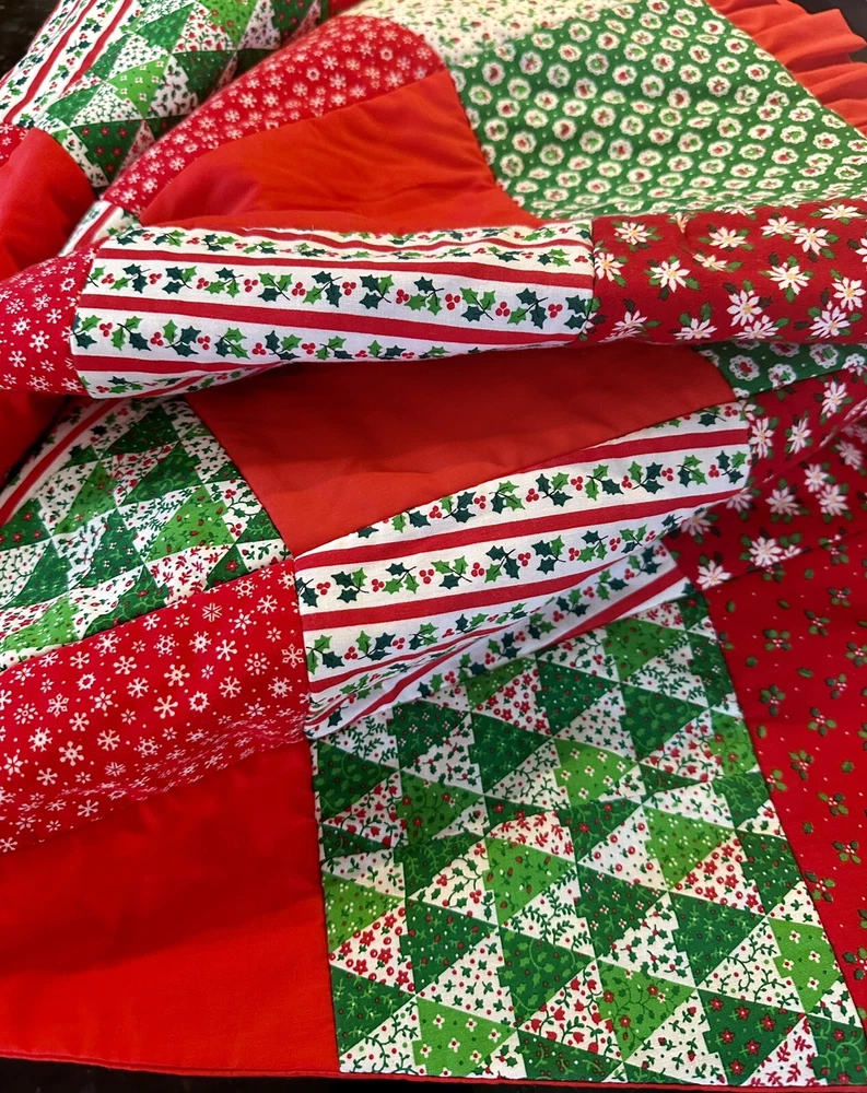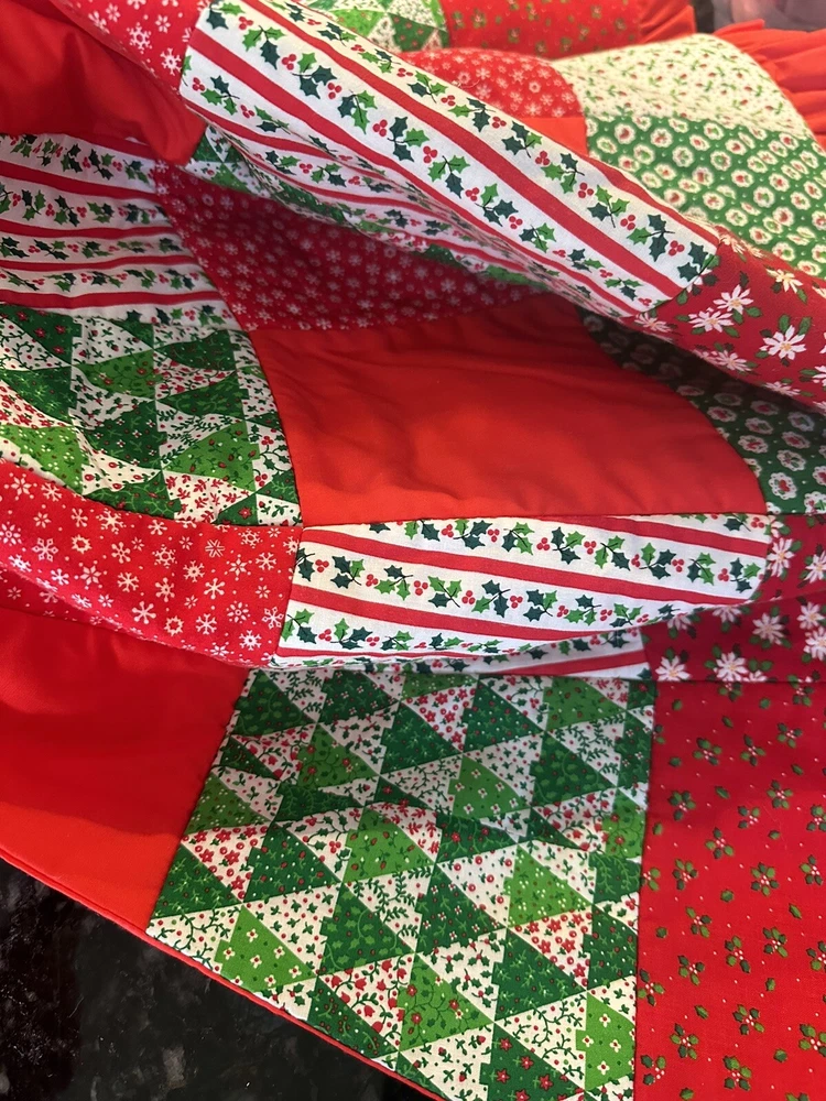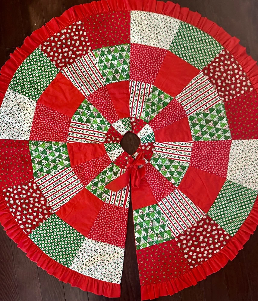 Beautiful quilted patchwork hand made tree skirt with traditional red green shades and holiday prints. Quilted with a batting between cotton. Appears completely unused and in pristine condition.