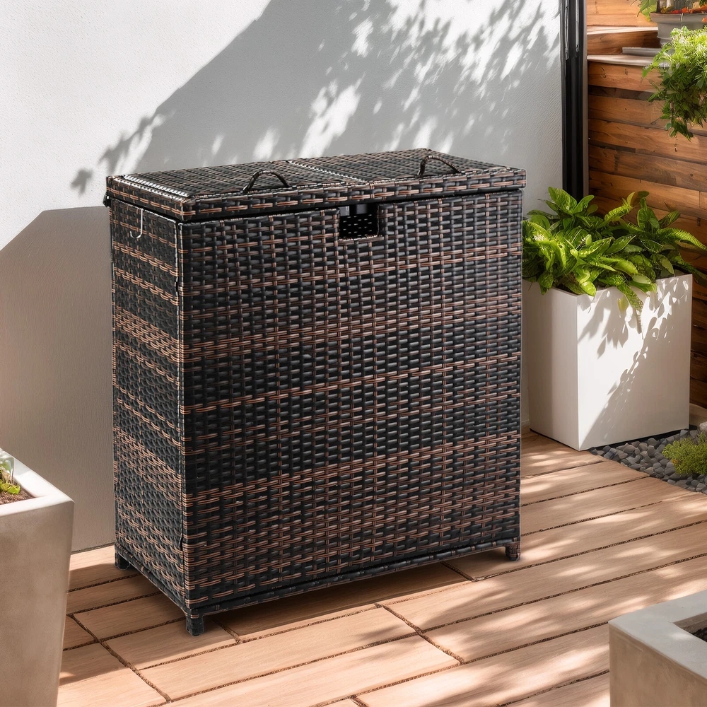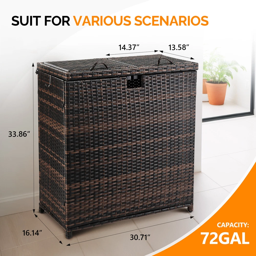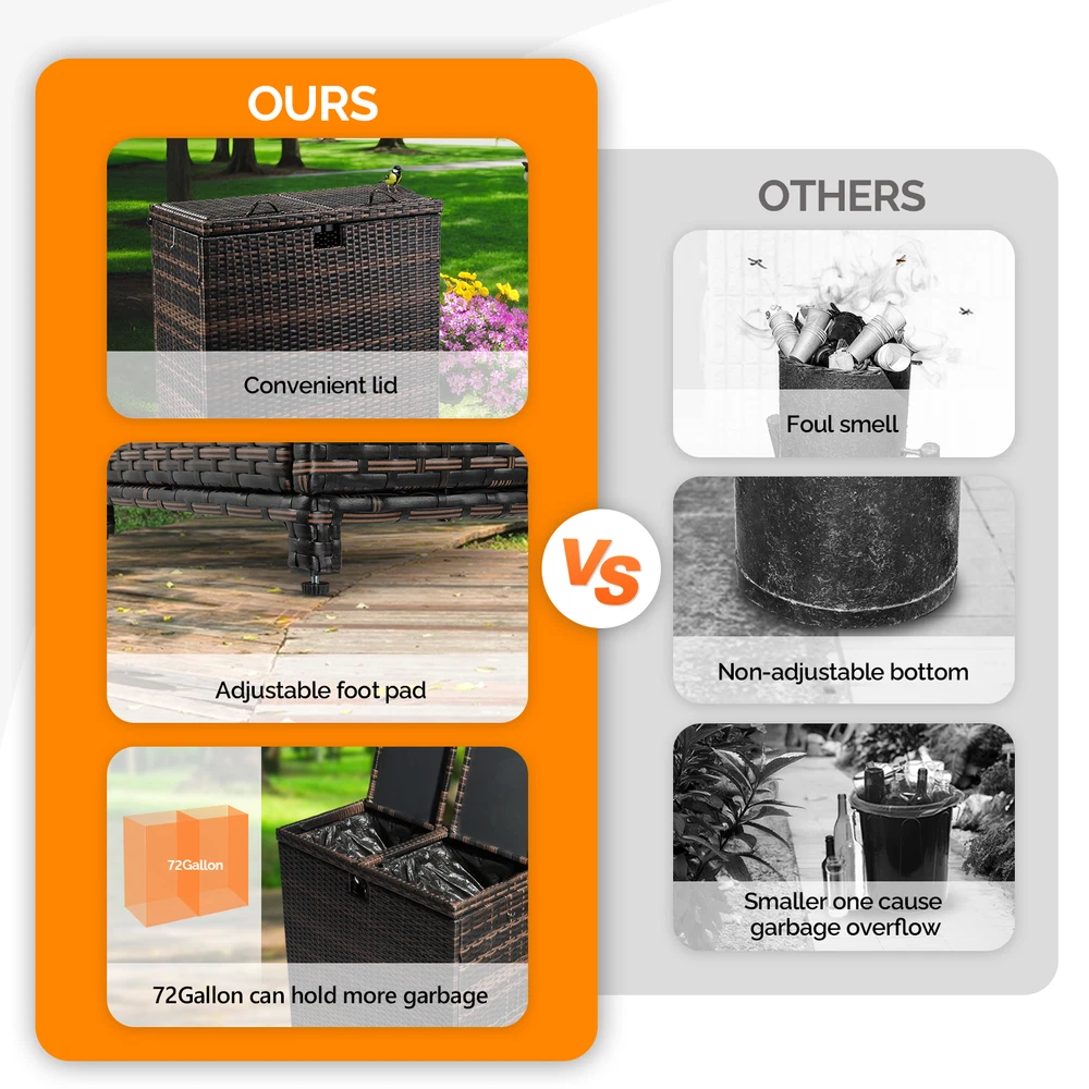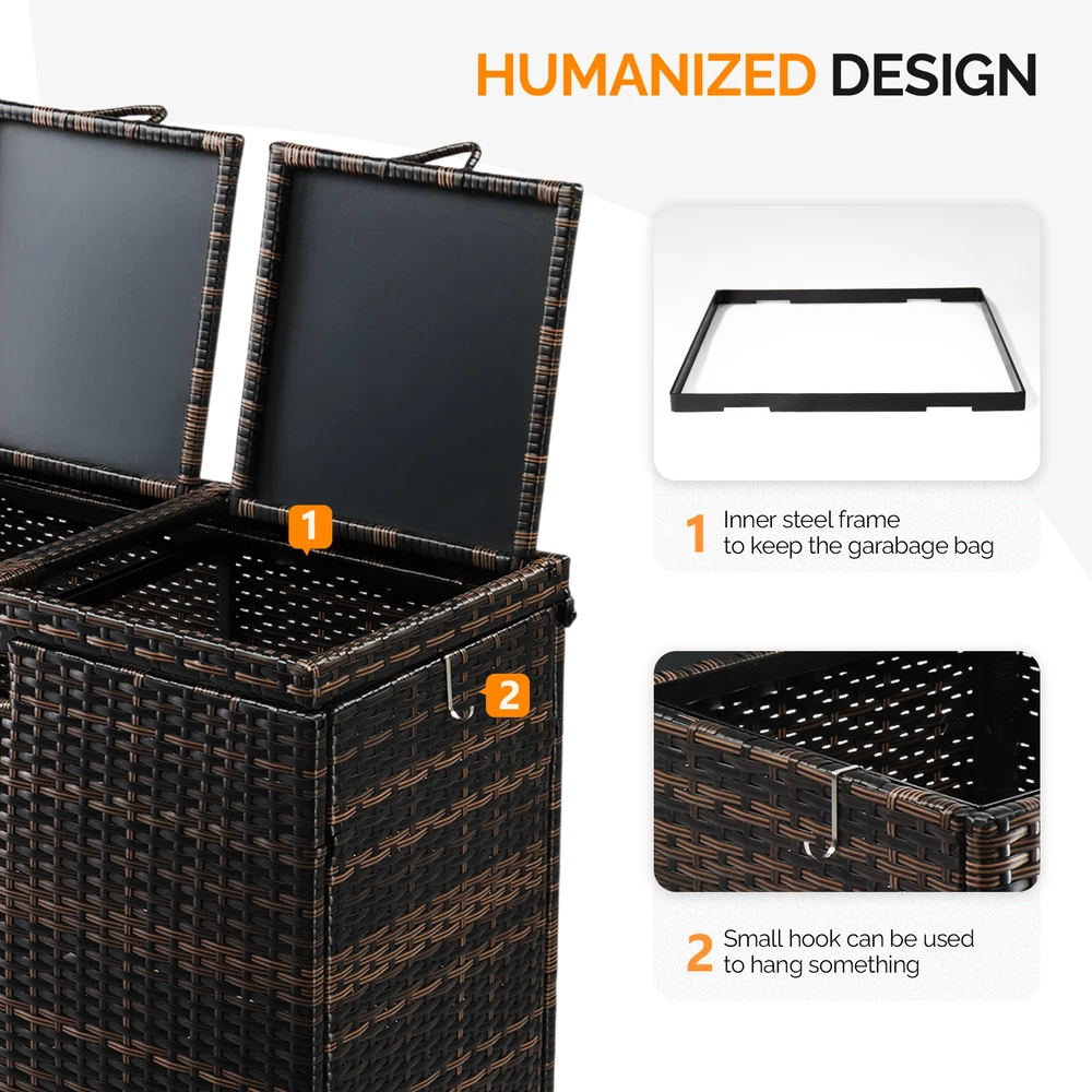 Introductions: Keep your outdoor and indoor spaces clean and stylish with our 72-gallon large wicker trash bins. Designed for durability and functionality, this trash can features a dual-lid design to separate and organize waste, making it perfect for managing trash at parties or daily use. Its UV-resistant PE rattan and sturdy steel frame ensure long-lasting performance in all weather conditions. With thoughtful details like adjustable feet, easy-to-replace trash bags, and a modern wicker texture, this trash bin seamlessly combines practicality and elegance for any porch, patio, backyard, or commercial space. Features: 1. Massive 72-Gallon Capacity with Dual Lids: Keep your trash organized with dual compartments, perfect for separating recyclables from waste or managing large amounts of trash effortlessly. Ideal for gatherings, parties, or everyday use. 2. Durable Construction for All-Weather Use: Made from UV-resistant PE rattan and a sturdy steel frame, this trash bin resists fading, rust, and wear, ensuring long-lasting use both indoors and outdoors. 3. Convenient Design: A cutout under the lid makes trash bag replacement quick and simple. Each lid is equipped with lift handles for easy access, while adjustable feet ensure stability on uneven surfaces. 4. Elegant and Modern Design: Featuring a textured wicker surface and sleek, polished look, this trash bin seamlessly blends functionality with aesthetic appeal, making it a perfect addition to any outdoor or indoor space. 5. Versatile Indoor and Outdoor Use: Whether it's for your patio, porch, backyard, or even your kitchen, this dual-lid trash bin is a practical solution for keeping your spaces clean and organized while enhancing the décor. Specifications: 1. Dimensions: (30.7 x 16.1 x 33.9) in / (78 x 41 x 86) cm 2. Interior Bin Dimensions: (28.7 x 14.2 x 29.9) in / (73 x 36 x 76) cm 3. Iron Ring Dimensions: (14 x 14 x 0.8) in / (35.5 x 35.5 x 2) cm 4. Lid Dimensions: (13.6 x 14.4 x 0.8) in / (34.5 x 36.5 x 2) cm 5. Hole Dimensions: (3.1 x 2.8) in / (8 x 7) cm 6. Material: PE Rattan, Steel 7. Net Weight: 26.9 lbs / 12.2 kg Package Includes: 1 x Wicker Trash Bin Please Note: Communication is the best way to solve the problem.Your satisfaction is our top priority. We appreciate your positive feedback! We have always been committed to providing the best service and reliable products to every customer. However, accidents may occur at times, and we understand your concerns and setbacks. Please contact us to resolve the issue before leaving negative feedback. We will reply to you as soon as possible. If there is no response within 24 hours, please check the email in your email. Our goal is to provide first-class customer service, so we usually do our best to solve any problems! (Note: Weekend Information Will Be Replied on the Next Working Day)