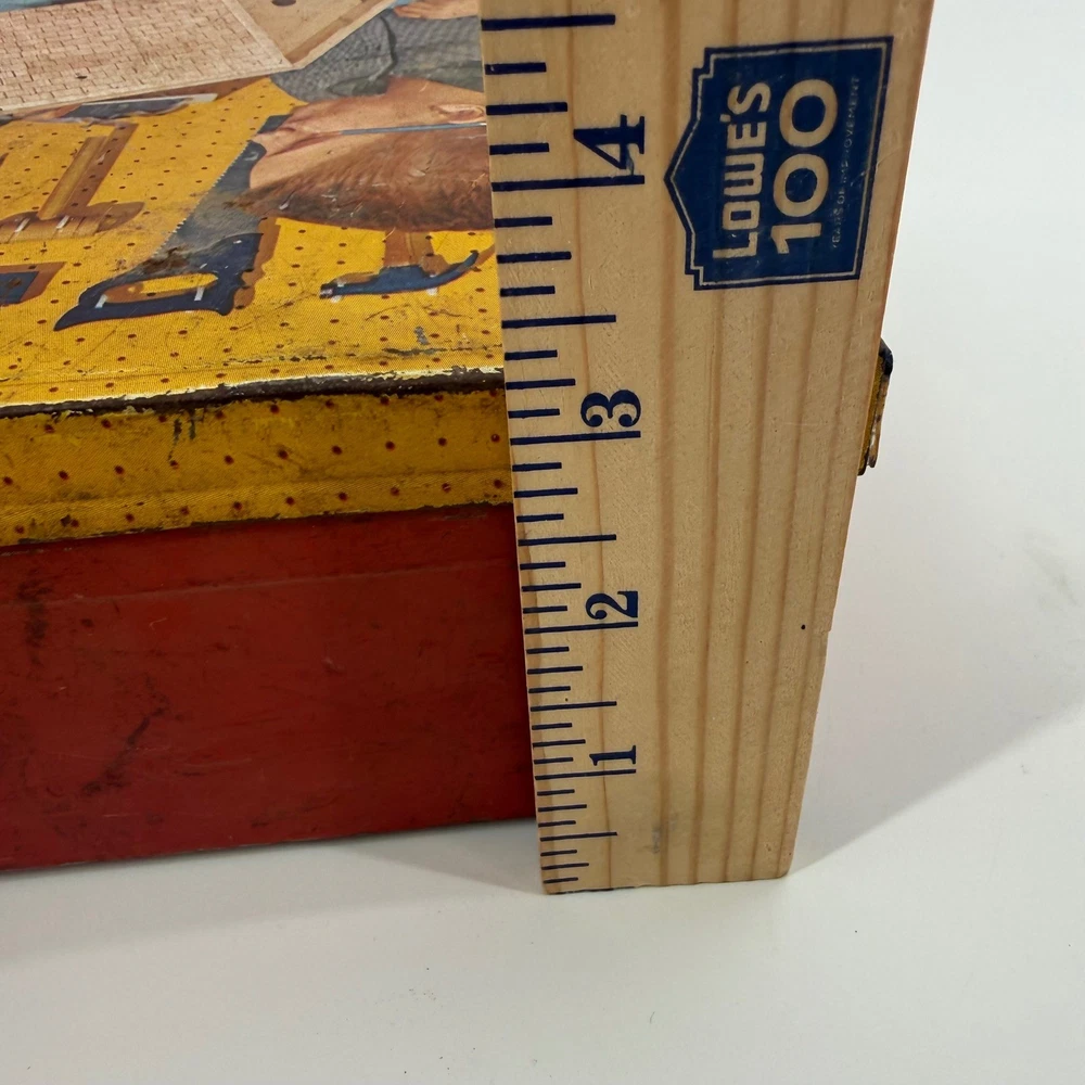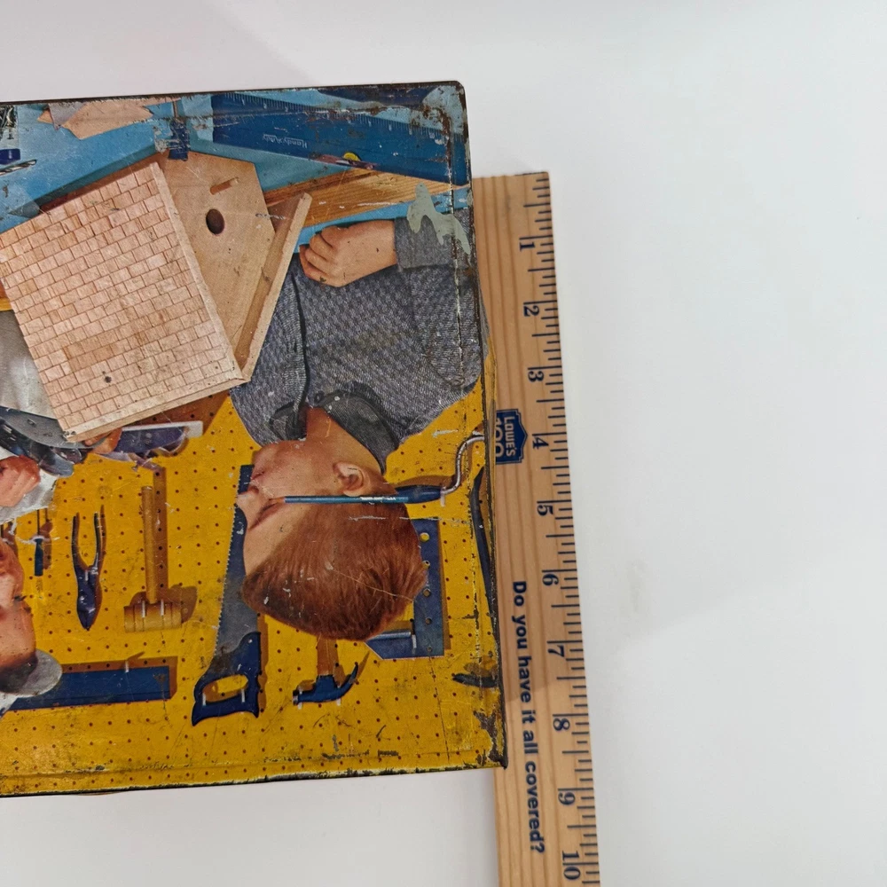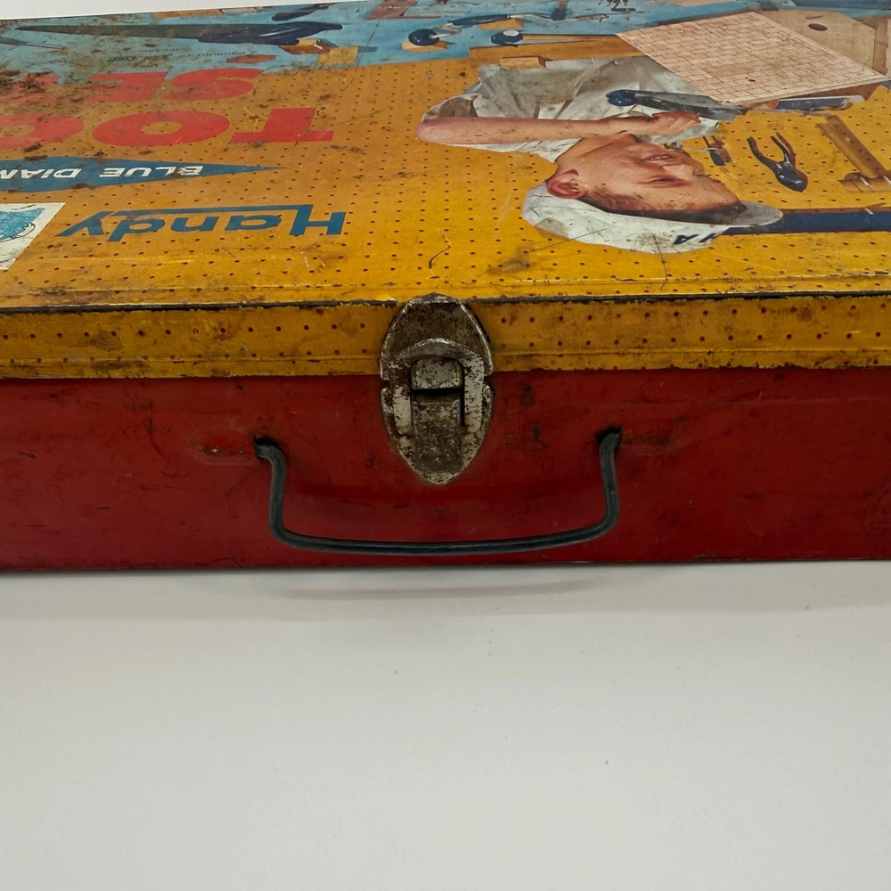 Real tools included as pictured. Neat little piece. Vintage Handy Andy Blue Diamond tin litho tool set for children. This classic toy features a vibrant tin case with colorful illustrations of boys working on a birdhouse and other projects. The set includes a hammer, a block plane, a saw, pliers, and a small mallet. This collectible toy offers a nostalgic glimpse into childhood play. Measurements: • Length: 16 in • Width: 8.5 in • Height: 3.5 in Character Family: Handy Manny Age Level: 4-7 Keywords: tin toy, metal lunchbox, retro toy, childrens tools, play set, collectible toy, vintage advertising, toy toolbox, construction toy, nostalgia, educational toy
