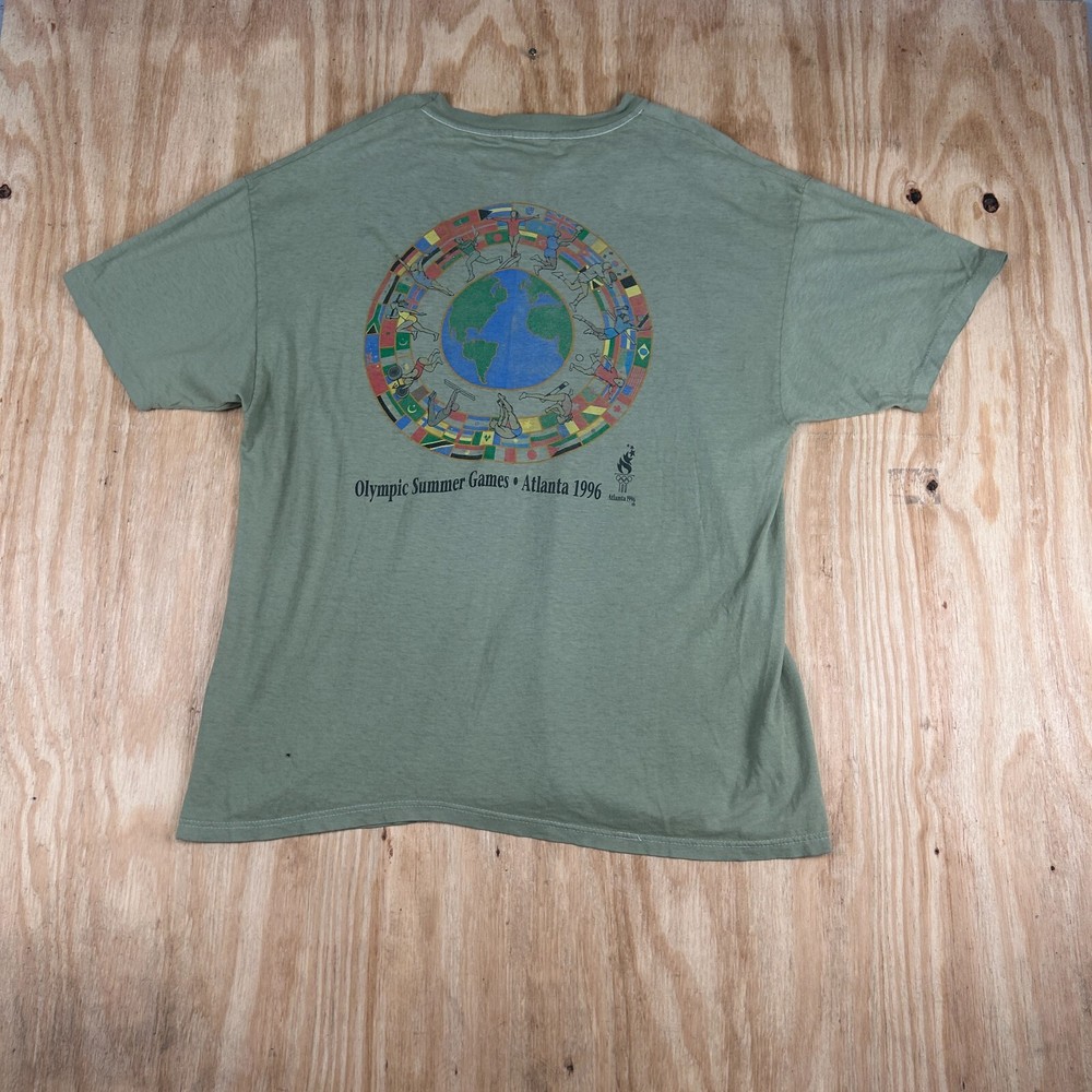 This is a vintage Hanes Olympic Summer Games Atlanta T-Shirt for men in size XL. The shirt features a graphic print with the Hanes logo and is made of breathable, easy-care cotton knit fabric. It has a crew neck and short sleeves, making it suitable for all seasons. The shirt is machine washable and was made in the United States.