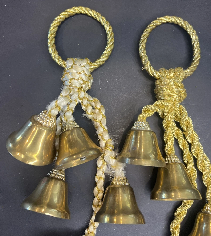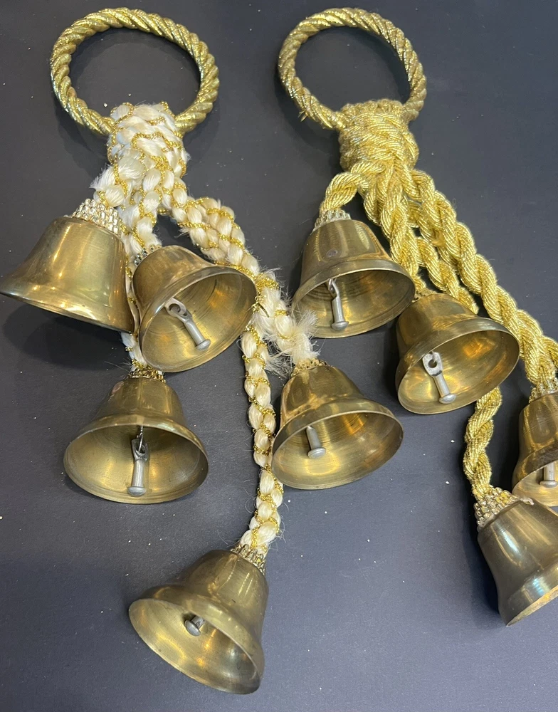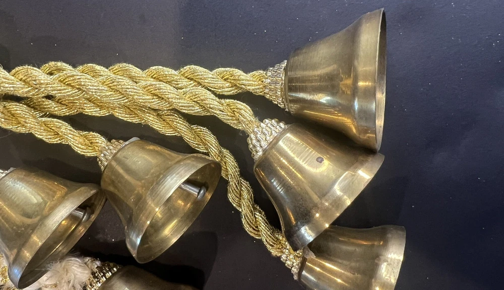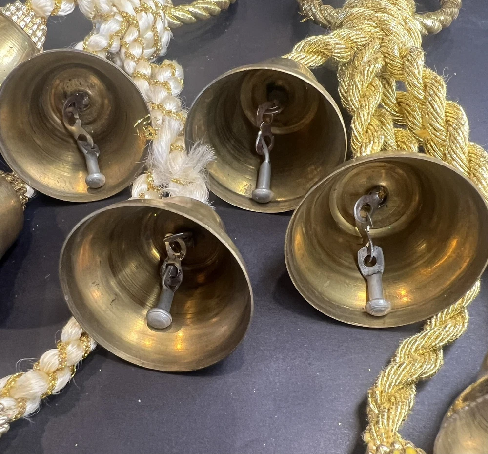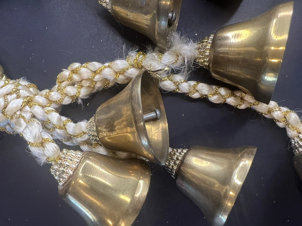 This vintage lot includes two hanging brass bells perfect for the holiday season, particularly Christmas. The bells are a classic gold color, adding a festive touch to any decor. Made of brass, these bells exude a timeless charm and can be a wonderful addition to your holiday decorations. Enhance your Christmas festivities with these vintage brass bells that capture the spirit of the season.