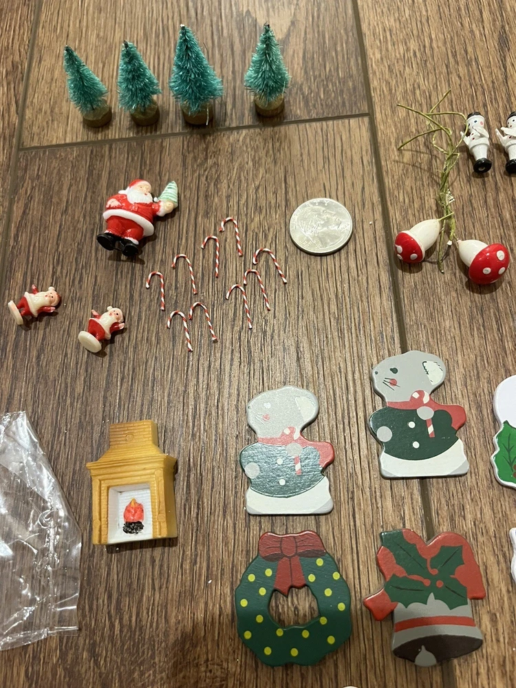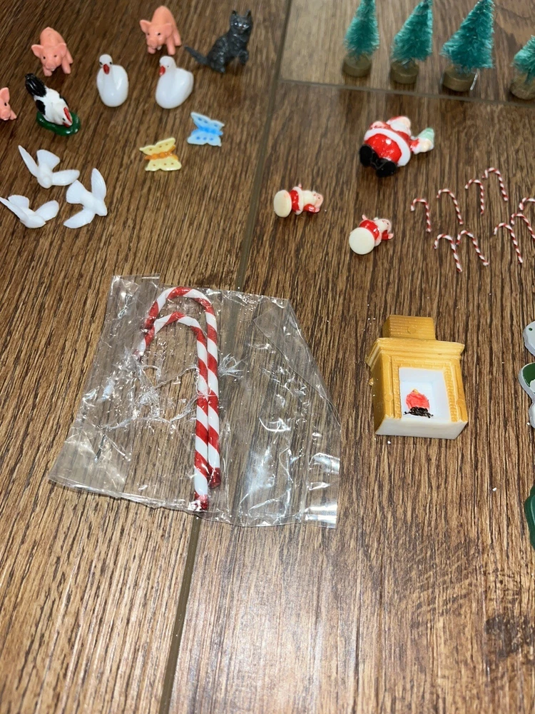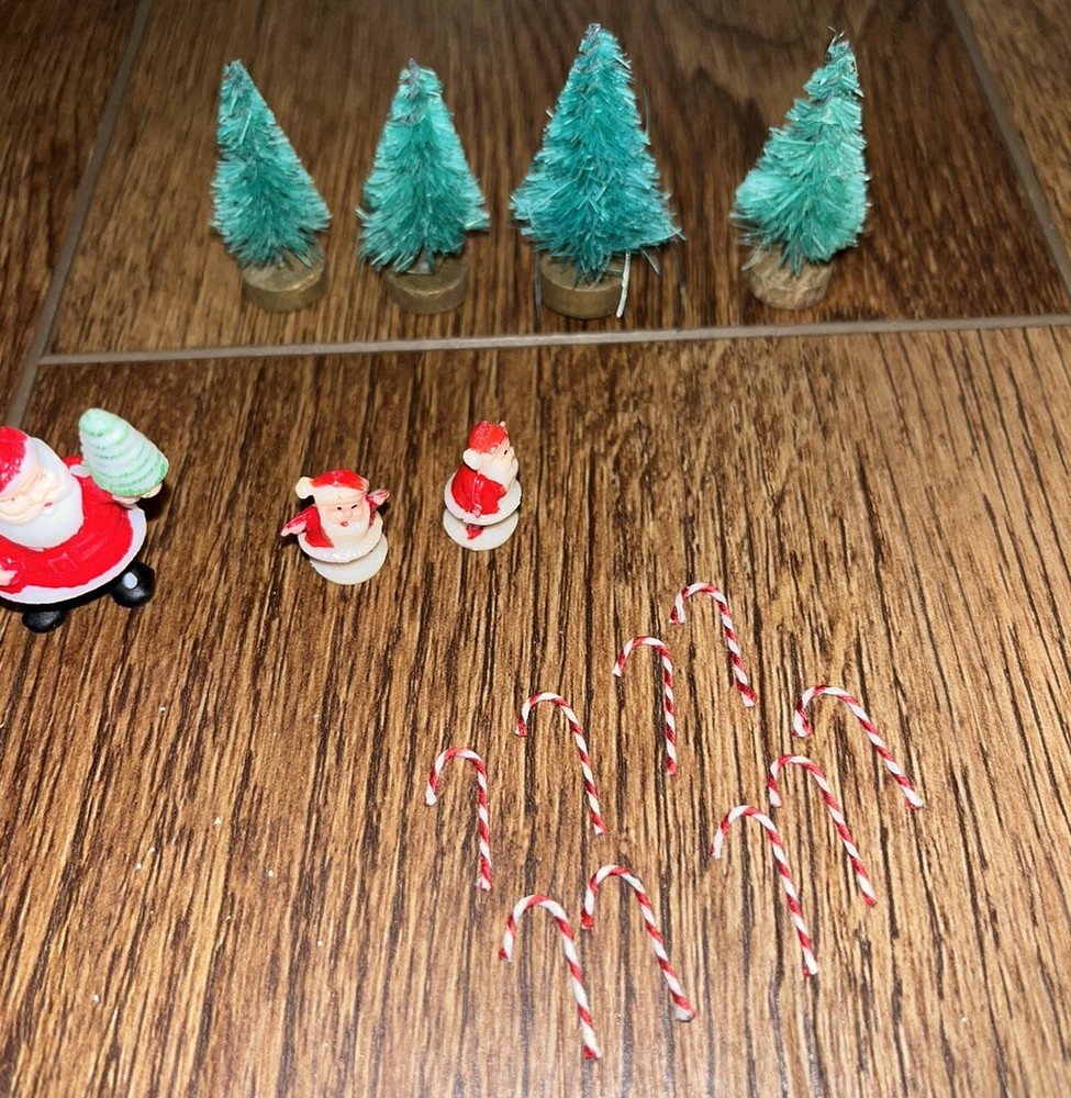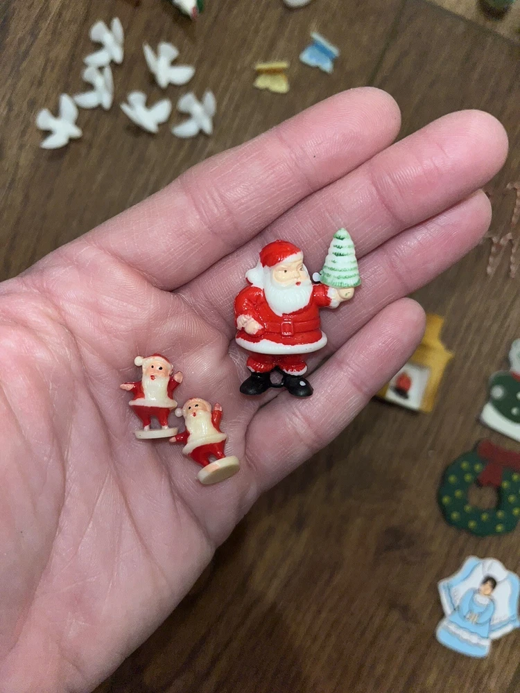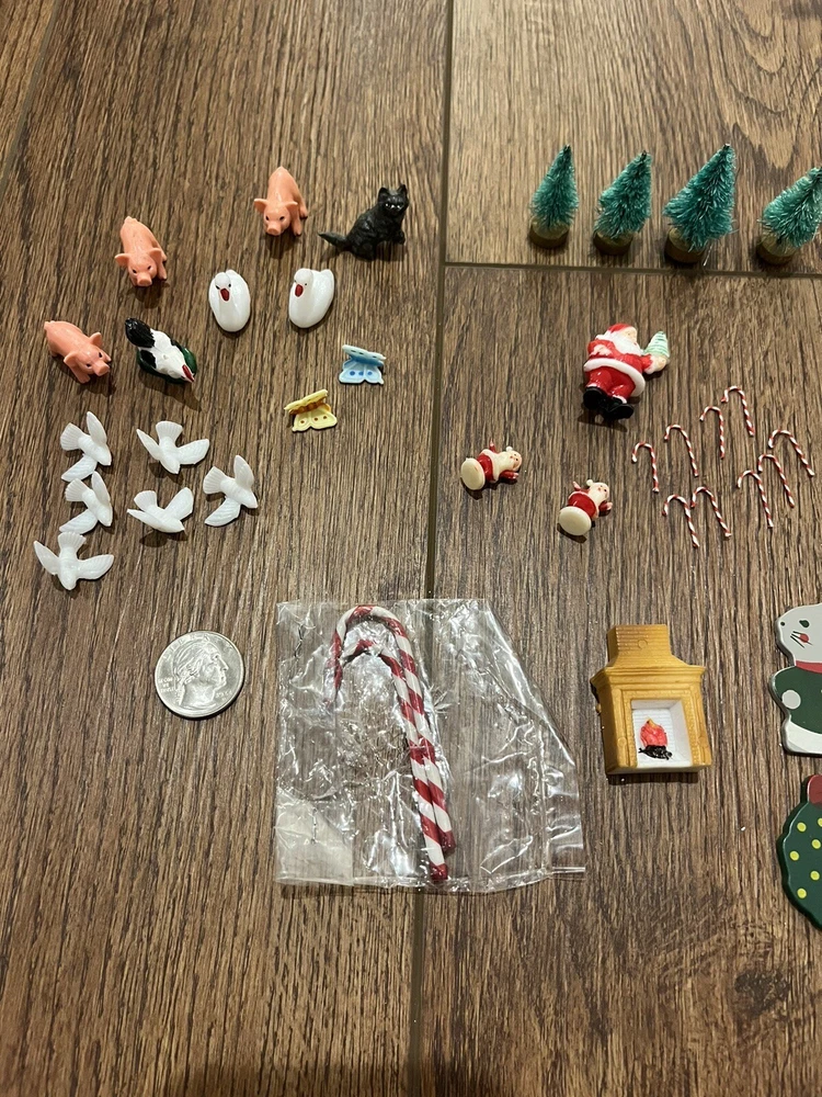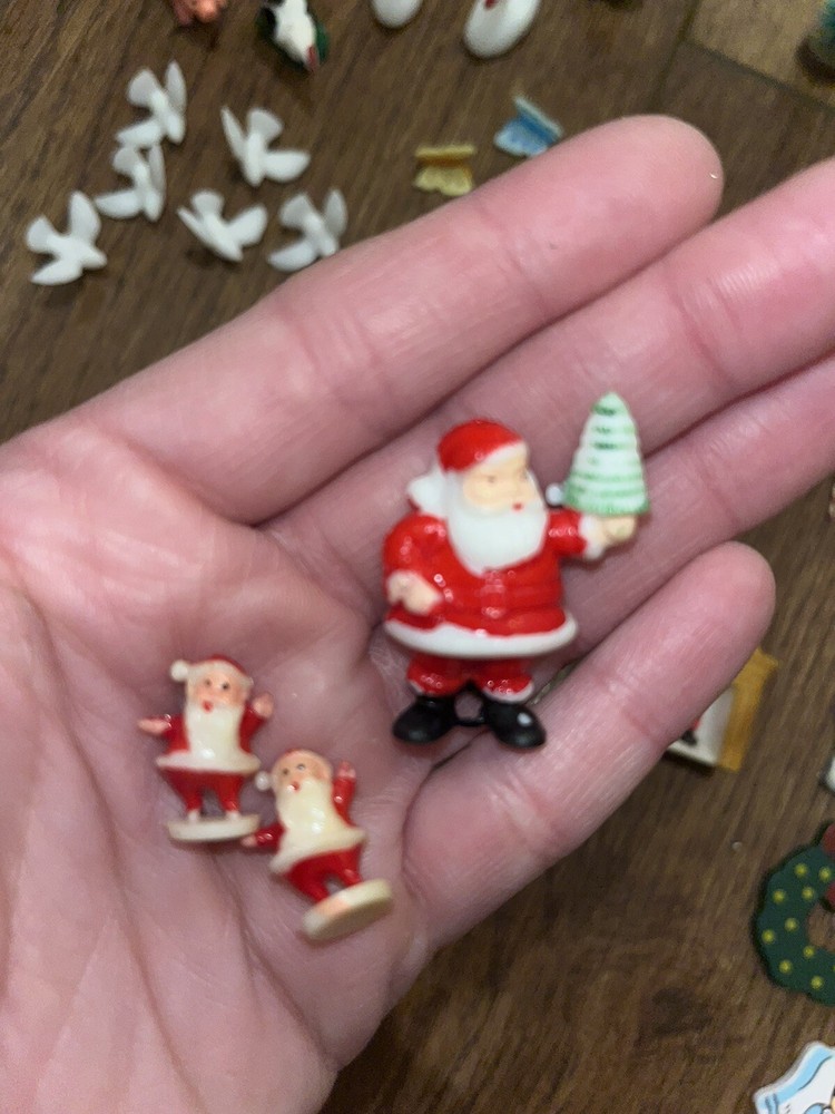 This is a great lot of tiny items. Perfect for a doll house, or decoration. Santa, swans, doves, Christmas trees, pigs, candy canes, etc. Good pre-owned condition. Add some festive flair to your holiday celebration with this charming collection of vintage hard plastic Christmas miniatures. Perfect for use as cake or craft decorations, these cute figures feature a variety of adorable animals, including swans and Santa Claus himself. With their charming anime-style design and playful attention to detail, these miniatures are sure to bring a smile to the face of anyone who sees them. Crafted from high-quality plastic materials, these Christmas miniatures are both durable and lightweight, making them easy to display and transport. Whether you're looking to add some fun to your holiday baking or decorate your home in style, these figurines are an excellent choice. So why wait? Add them to your collection today and start celebrating the season in style!