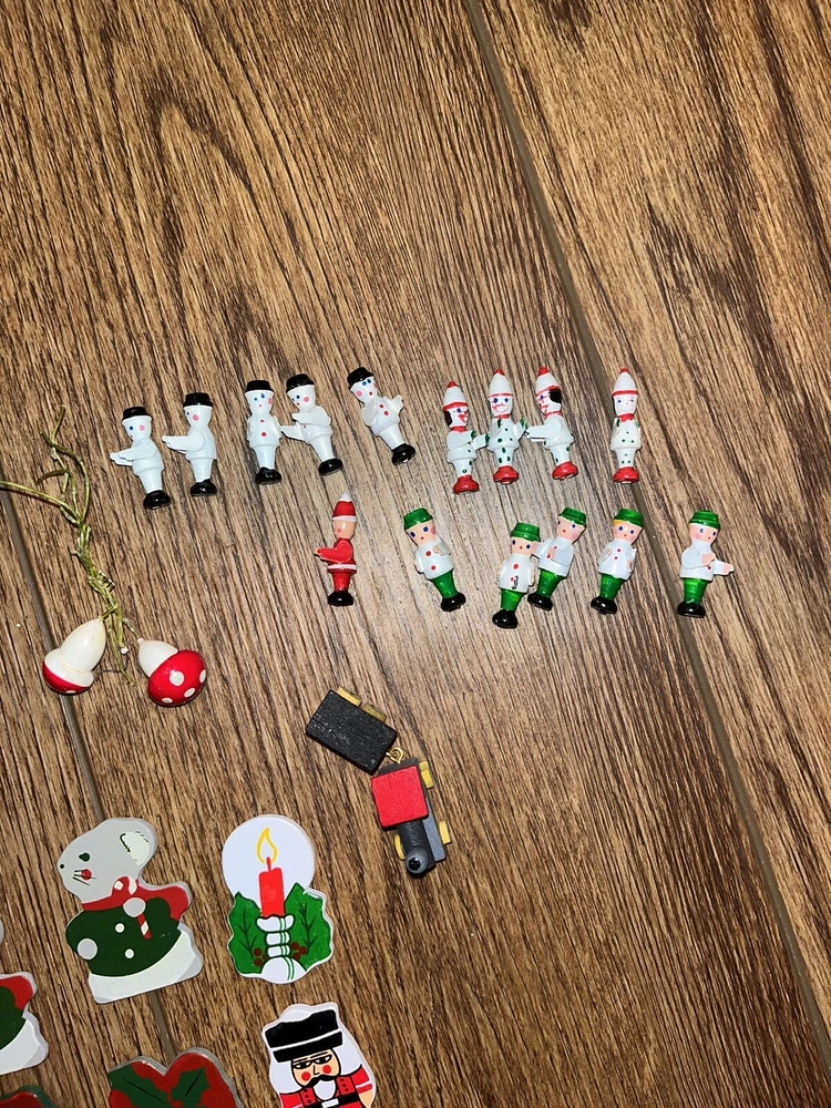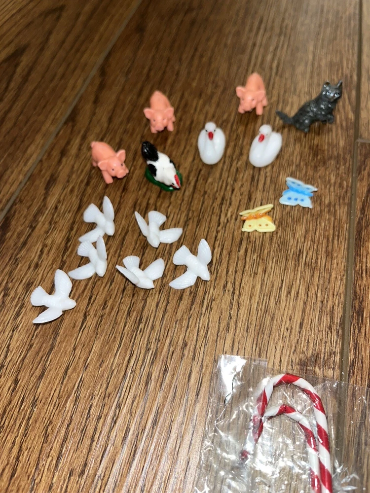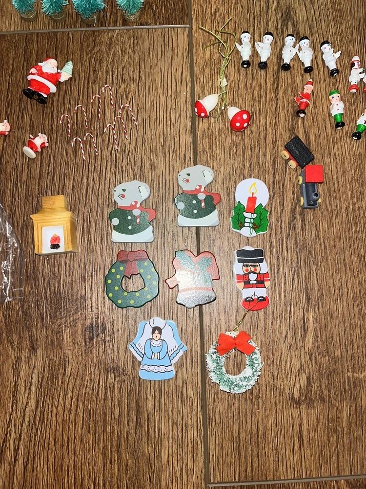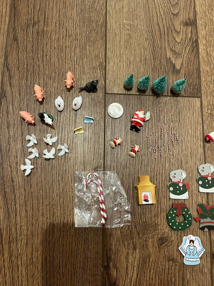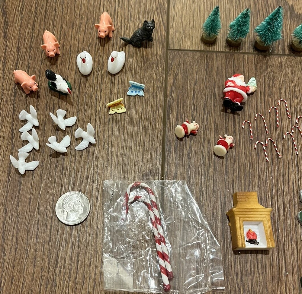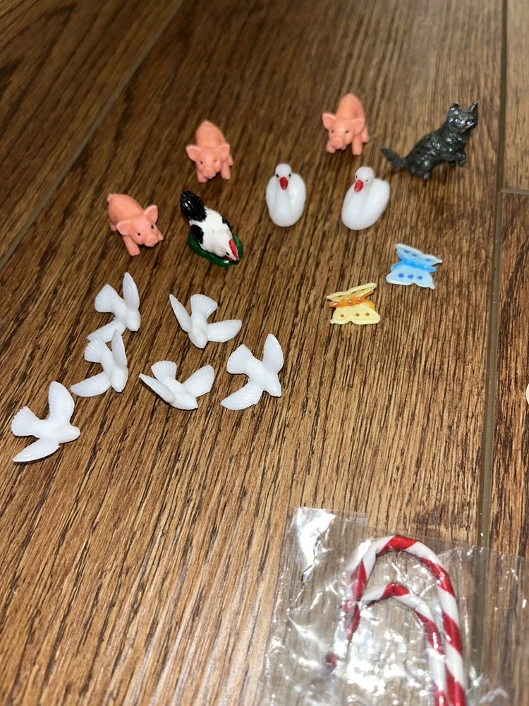 This is a great lot of tiny items. Perfect for a doll house, or decoration. Santa, swans, doves, Christmas trees, pigs, candy canes, etc. Good pre-owned condition. Add some festive flair to your holiday celebration with this charming collection of vintage hard plastic Christmas miniatures. Perfect for use as cake or craft decorations, these cute figures feature a variety of adorable animals, including swans and Santa Claus himself. With their charming anime-style design and playful attention to detail, these miniatures are sure to bring a smile to the face of anyone who sees them. Crafted from high-quality plastic materials, these Christmas miniatures are both durable and lightweight, making them easy to display and transport. Whether you're looking to add some fun to your holiday baking or decorate your home in style, these figurines are an excellent choice. So why wait? Add them to your collection today and start celebrating the season in style!