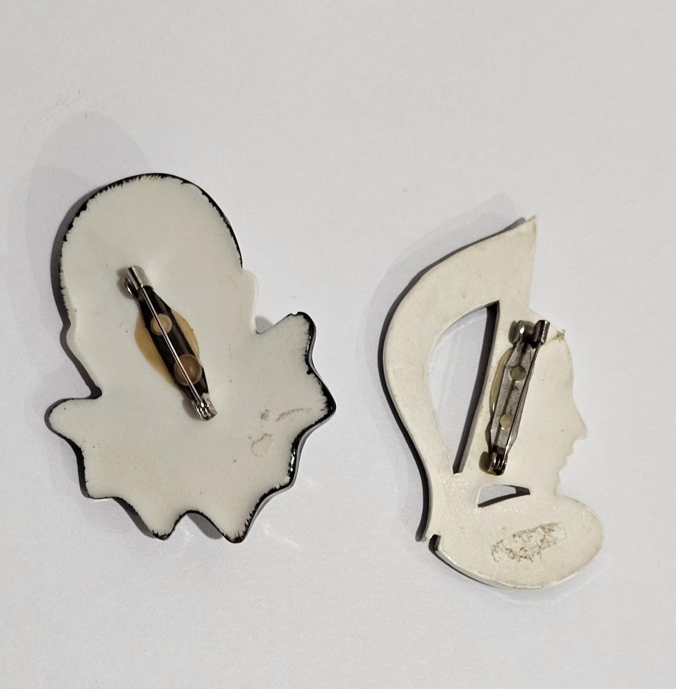 The product is a set of two vintage brooches. One brooch features a harlequin or clown design, while the other showcases a music note with a face. Both brooches are offered at a price of $13 for the pair. These pieces of jewelry fall under the category of fashion brooches and are a unique addition to any jewelry collection. The harlequin/clown and music note designs add a whimsical and playful touch to any outfit, making them a fun and eye-catching accessory to wear.