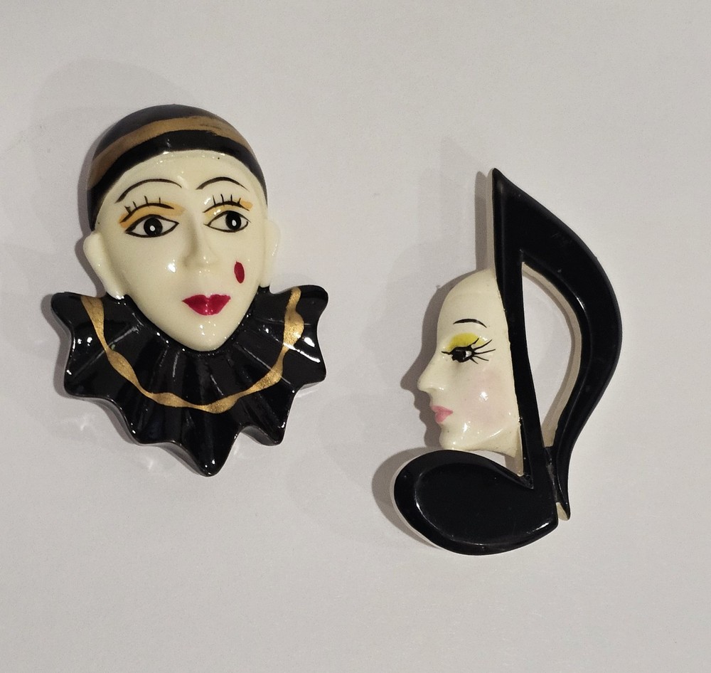 Vintage Harlequin Clown & Music Note Face Brooches Set For $13 Each