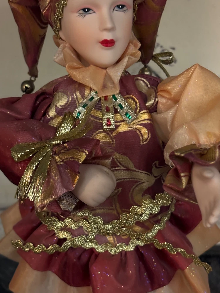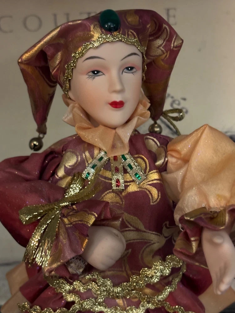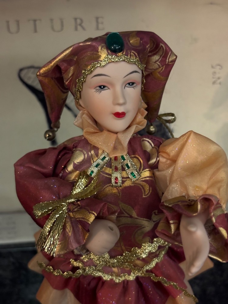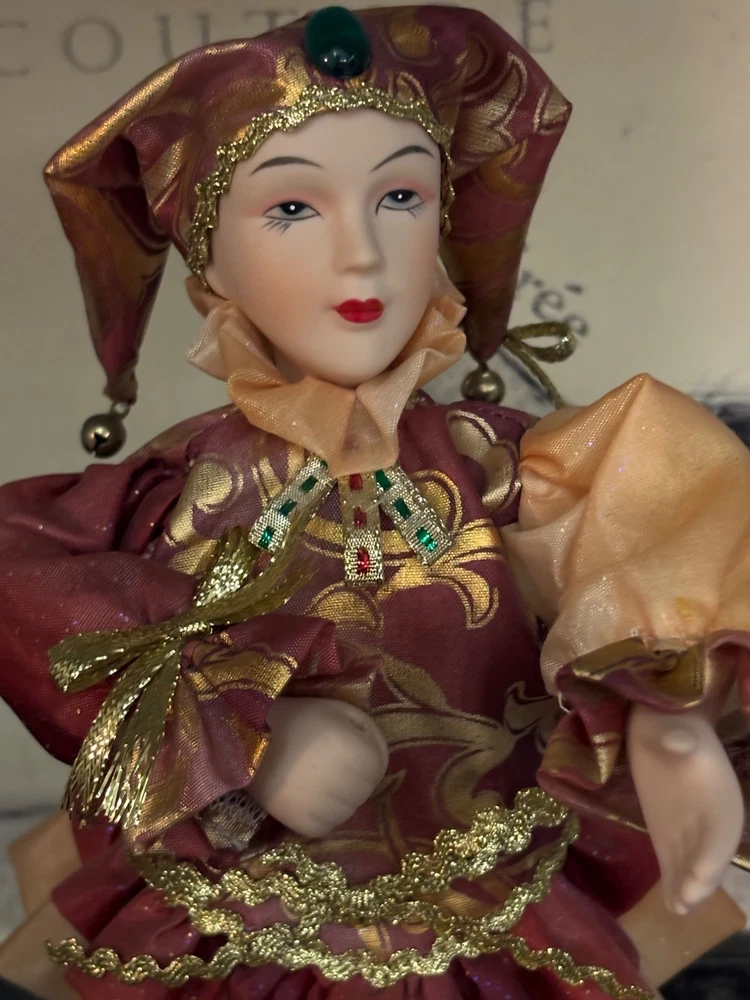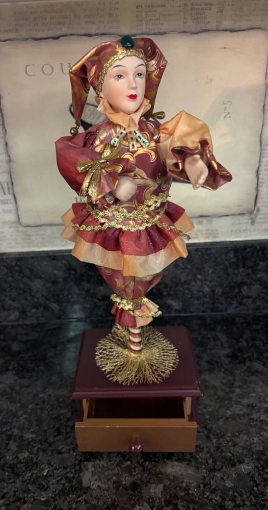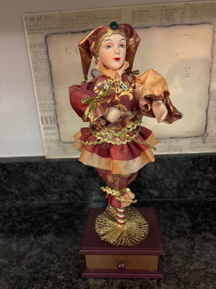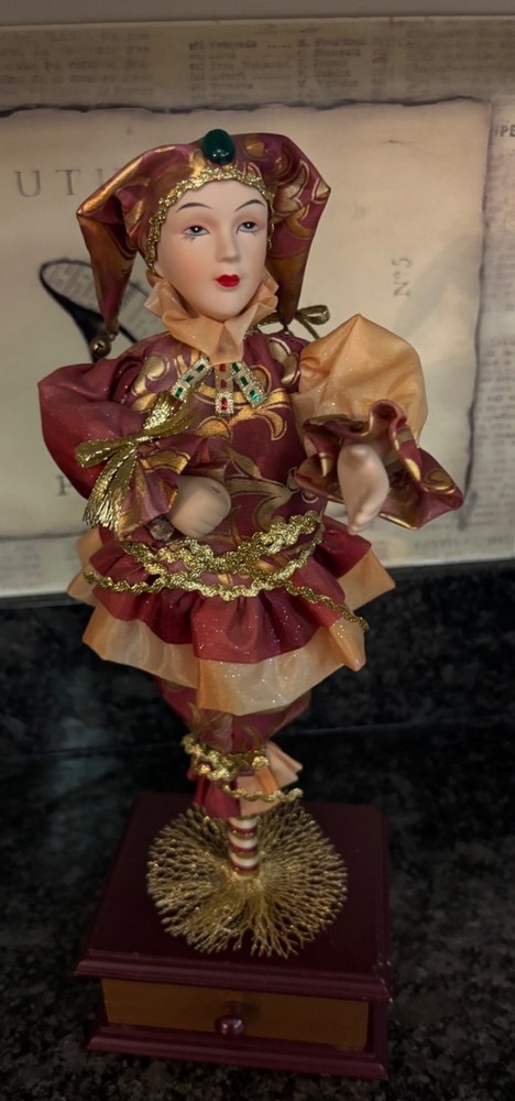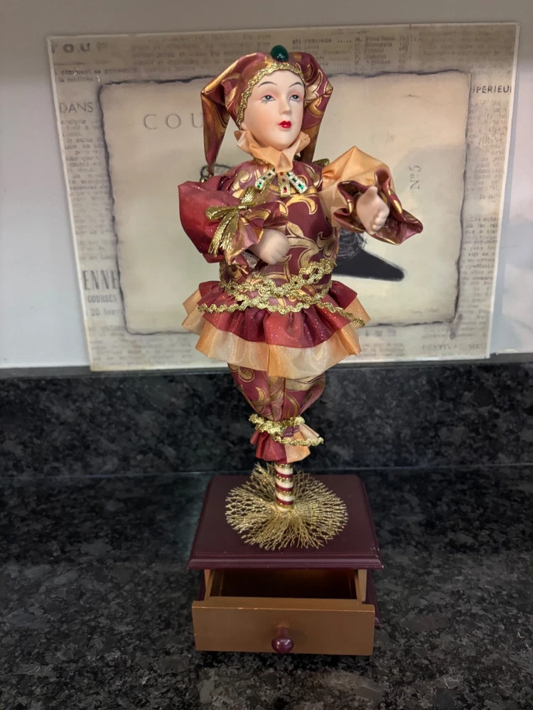 This porcelain harlequin doll is dressed to impress in burgundy and gold, ready to pirouette atop a music box that sings sweeter than your shower voice. • Porcelain doll with intricate hand-painted features • Burgundy & gold detailed outfit • Functional San Francisco music box base • Measures approximately 12 inches tall Has a drawer for Jewlery or stash Minor wear on music box base, no significant flaws on doll or outfit. Please see all photos as they are part of the description. Always open to reasonable offers! Jewelry is never cleaned as we want to preserve its timeless beauty and aging. Vintage items tell a story and we would like you to see that story. It also allows the new owners to clean in a way that is right for them.