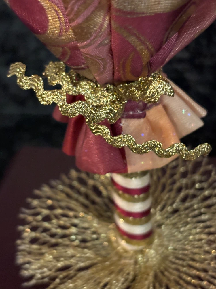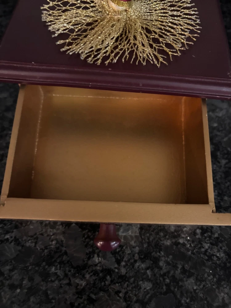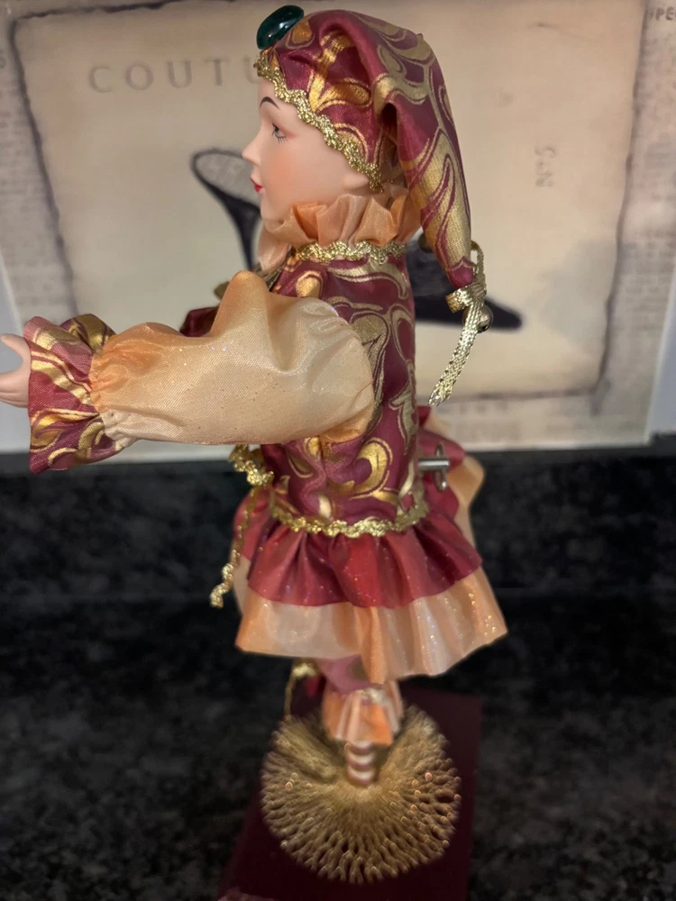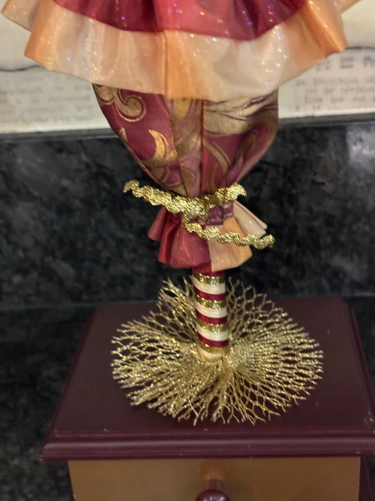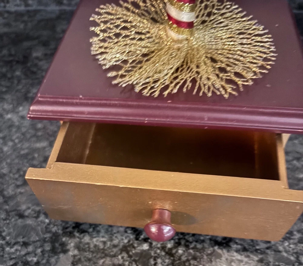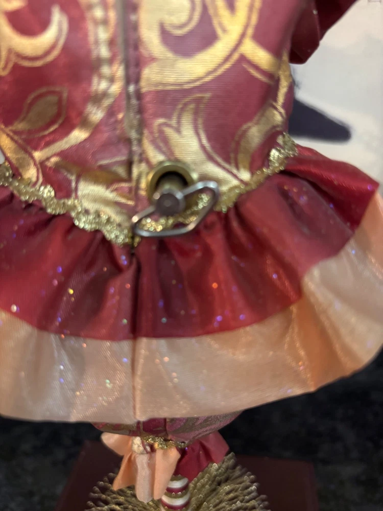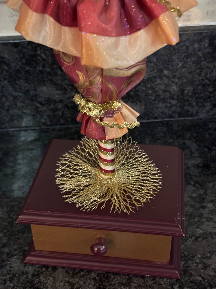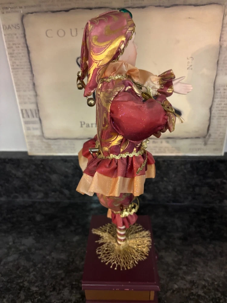This porcelain harlequin doll is dressed to impress in burgundy and gold, ready to pirouette atop a music box that sings sweeter than your shower voice. • Porcelain doll with intricate hand-painted features • Burgundy & gold detailed outfit • Functional San Francisco music box base • Measures approximately 12 inches tall Has a drawer for Jewlery or stash Minor wear on music box base, no significant flaws on doll or outfit. Please see all photos as they are part of the description. Always open to reasonable offers! Jewelry is never cleaned as we want to preserve its timeless beauty and aging. Vintage items tell a story and we would like you to see that story. It also allows the new owners to clean in a way that is right for them.