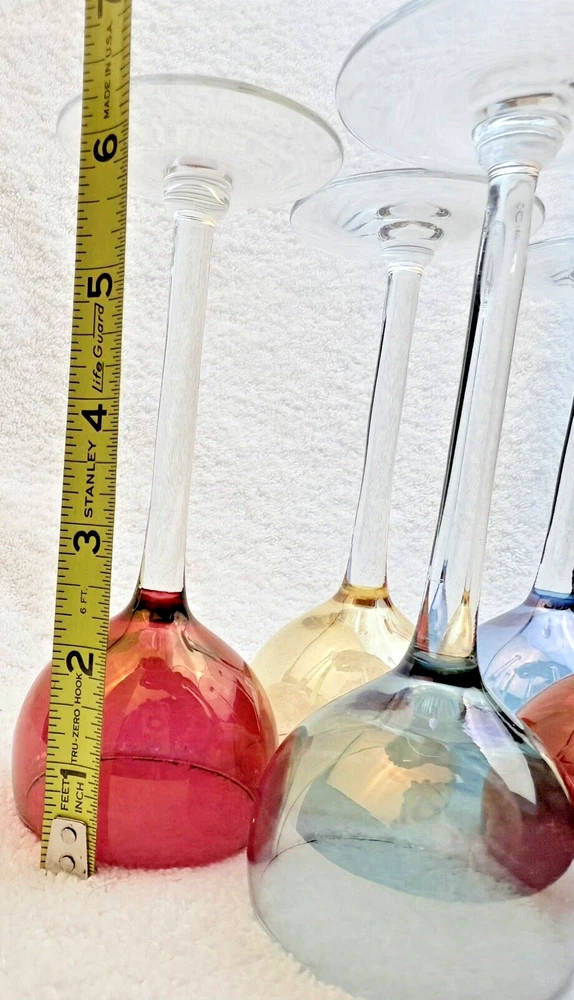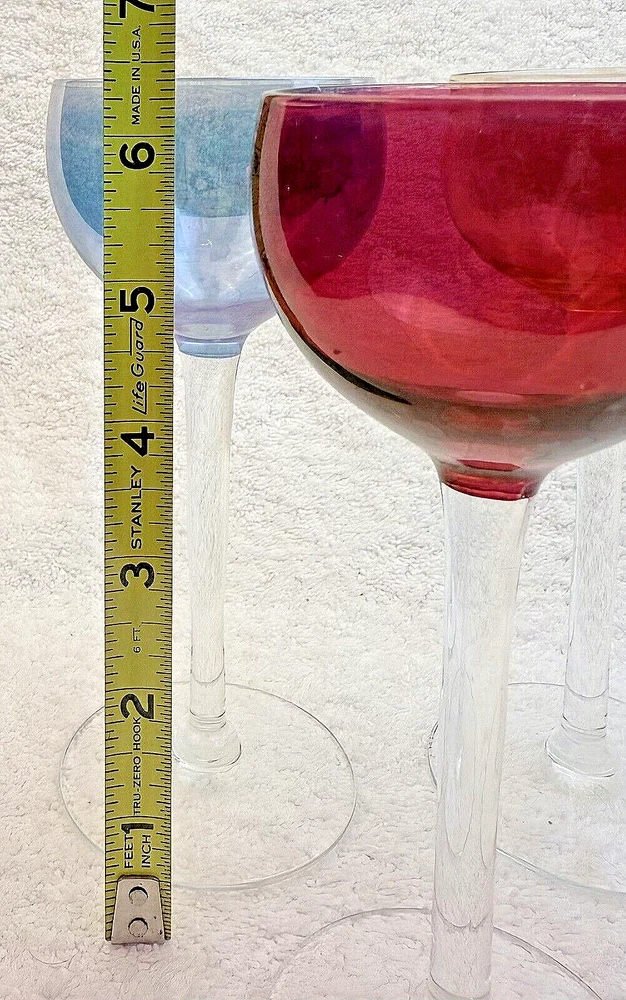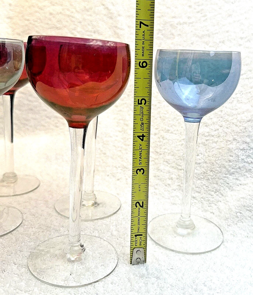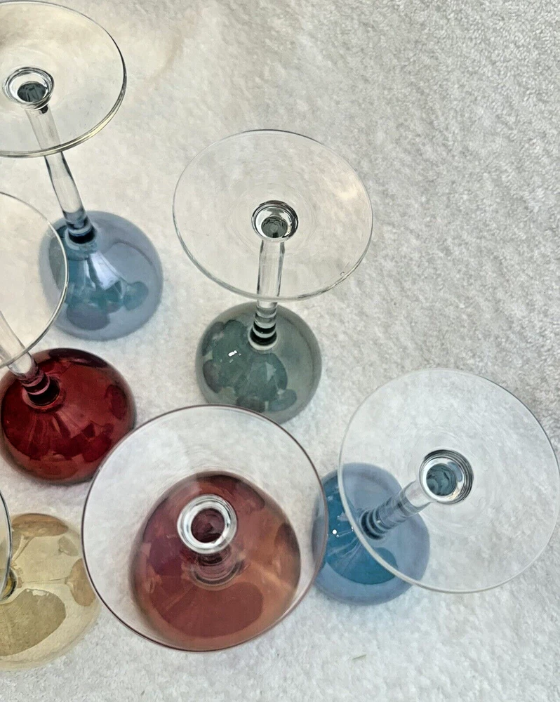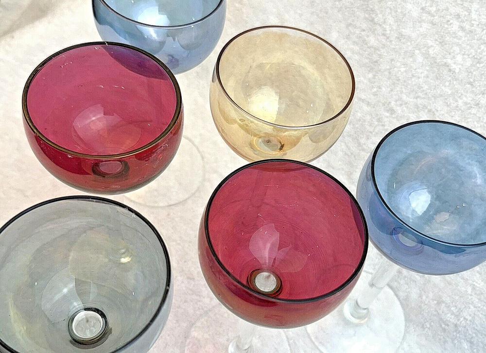 Material: Glass Country/Region of Manufacture: Unknown Shape: Round Production Technique: Hand Blown Glass Production Style: Elegant Glass Color: Multicolor Item Diameter: 2.5" Pattern: Gem Colors Colour: Multicoloured Type: Wine Glass Finish: Glossy Seller Notes: “Good, no chips cracks or breaks. Some color loss, see pics.” Care Instructions: Hand Wash Only Style: Art Deco Brand: Unmarked Number of Items in Set: Six-Piece Item Height: 6.5"
