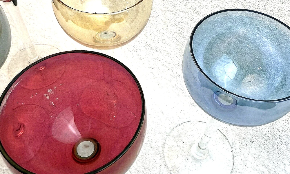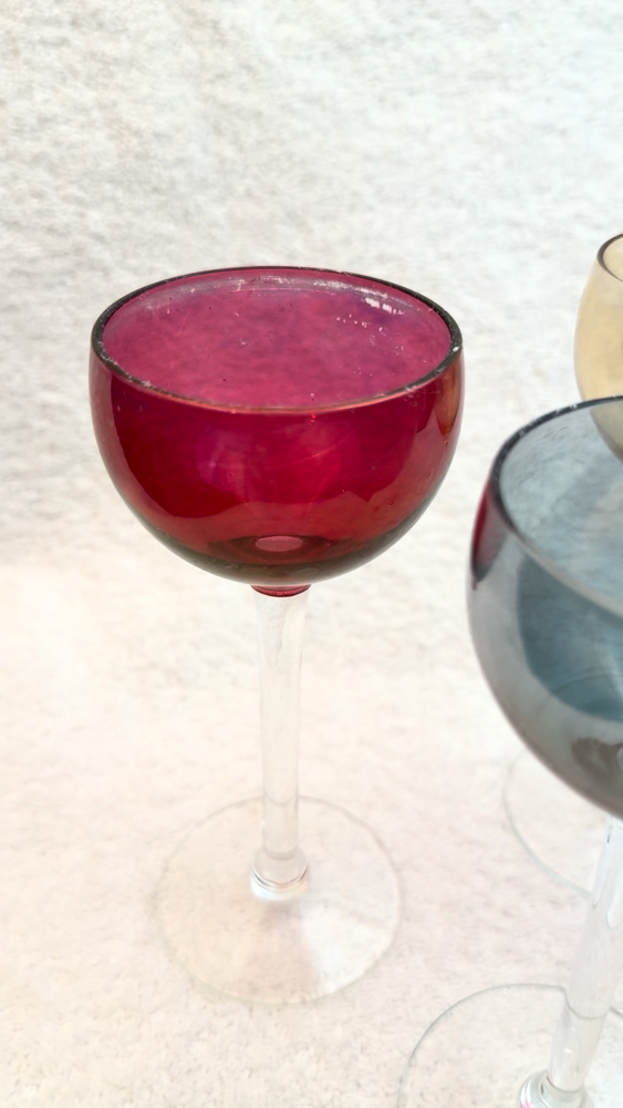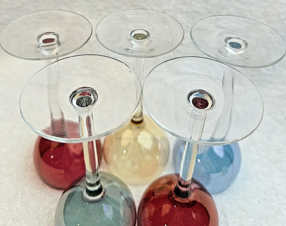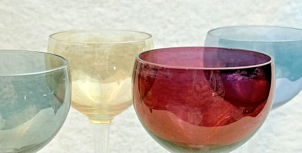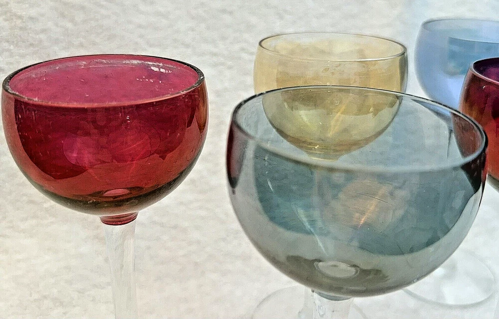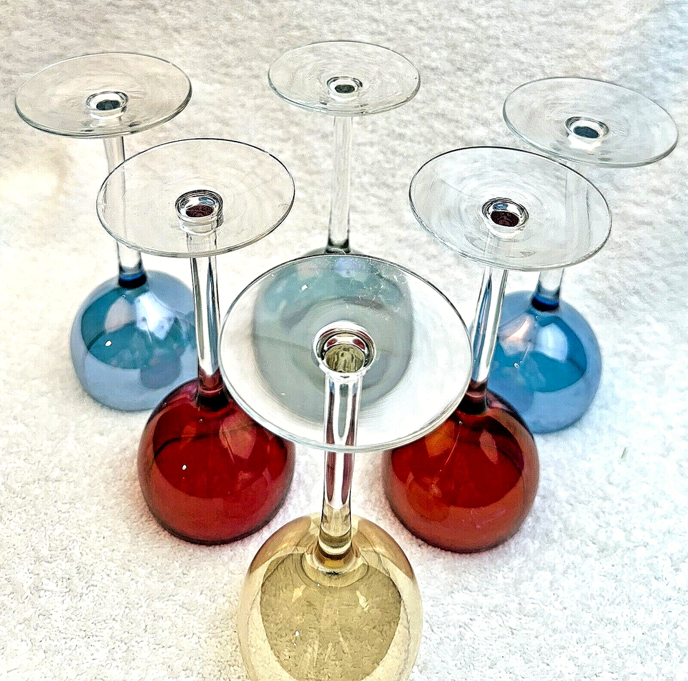 Material: Glass Country/Region of Manufacture: Unknown Shape: Round Production Technique: Hand Blown Glass Production Style: Elegant Glass Color: Multicolor Item Diameter: 2.5" Pattern: Gem Colors Colour: Multicoloured Type: Wine Glass Finish: Glossy Seller Notes: “Good, no chips cracks or breaks. Some color loss, see pics.” Care Instructions: Hand Wash Only Style: Art Deco Brand: Unmarked Number of Items in Set: Six-Piece Item Height: 6.5"