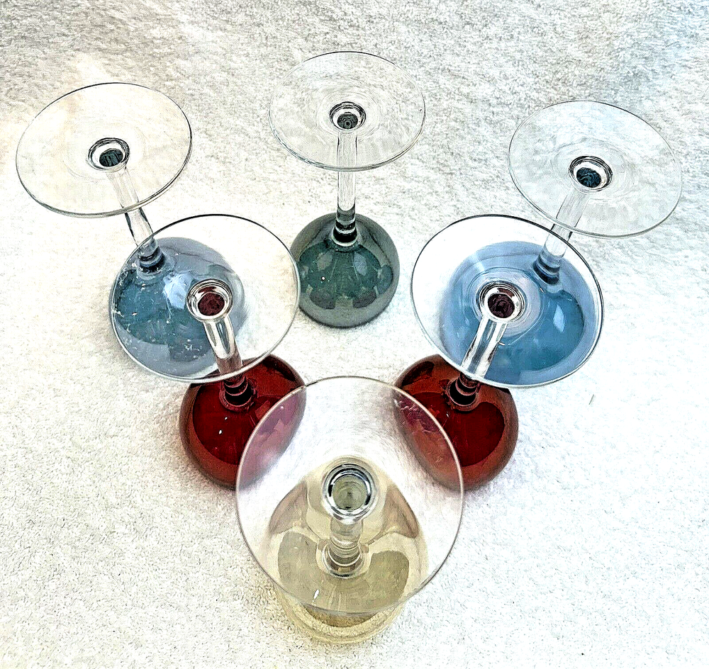 6 Piece Harlequin Wine Glass Set. Beautiful Colored Globes: 2 Ruby, 2 Aqua, 1 Moss and 1 Straw (pale yellow) Slim elegant stems and surefooted base. The glasses make a unique display and play well with light. Some loss to color of a few glasses, see pics. All boxing and unboxing is video recorded for quality assurance. Whenever possible, we support the environment by prioritizing recycling and re-utilizing clean packing materials. Like what you see? Visit our eBay preferred vendor store Hampton to Hampton. Come on in and browse our vast collection of Estate Curated items. Most times items are categorically collectables, however, even daily use items or modern items are included in the estates. Here's the link: https://www.ebay.com/str/hamptontohampton
