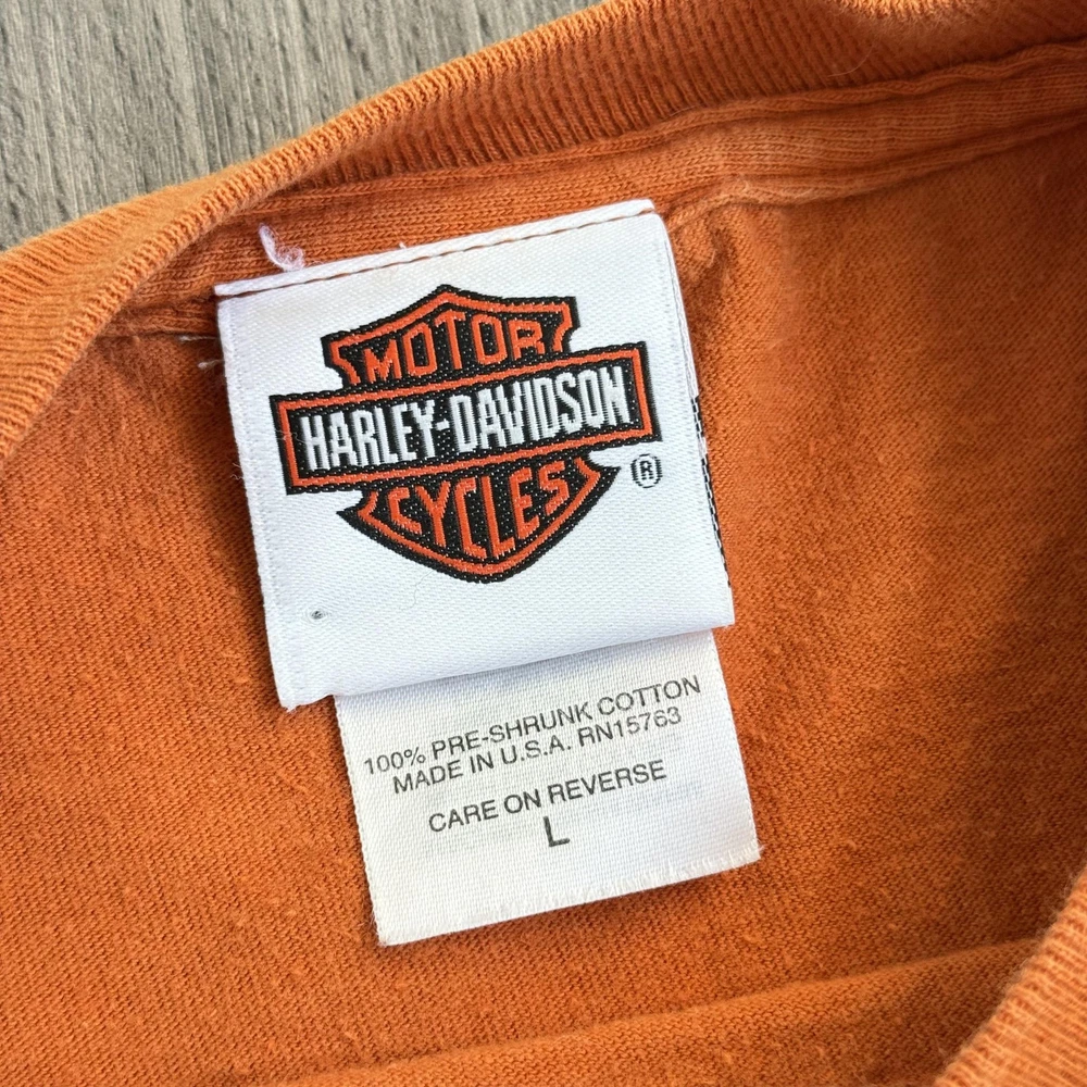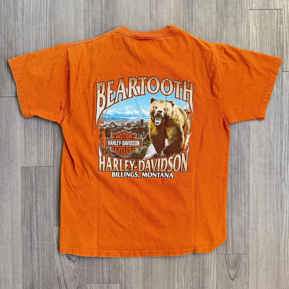 Vintage Harley-Davidson Beartooth Shirt Mens Large Orange Bear Made USA Tee Pre-owned Harley-Davidson Beartooth graphic T-shirt with general wash wear, fabric softening, and overall fade from regular use. Right side torso near the underarm seam has a torn area with multiple small holes and frayed fabric visible on both front and back panels. Remaining fabric, collar, sleeves, hem, and printed graphics are structurally sound and the shirt remains wearable for casual Harley-Davidson, repaired, or intentionally distressed style outfits. Brand: Harley-Davidson. Style: Mens short sleeve dealership graphic T-shirt. Color: Orange body with tonal front logo and multicolor back bear graphic. Size on tag: Mens Large (L). Material: 100% pre-shrunk cotton jersey knit fabric. Details: Classic crew neckline with ribbed collar and straight hem for a regular T-shirt fit. Details: Front features Harley-Davidson script logo with bar and shield emblem and scroll artwork across the chest. Details: Back features large Beartooth Harley-Davidson Billings, Montana scenery graphic with roaring bear, mountains, skyline, and bar and shield logo. Details: Inner neck tag displays Harley-Davidson Motor Cycles shield logo with secondary tag noting 100% pre-shrunk cotton, Made in U.S.A., RN15763, and size L. Special notes: Made in U.S.A. Harley-Davidson dealership tee from Beartooth Harley-Davidson in Billings, Montana, suitable for riders, collectors, and fans of bear or Montana-themed motorcycle art; please review all photos for close-ups of artwork, tag, and fabric details before purchase. 2023