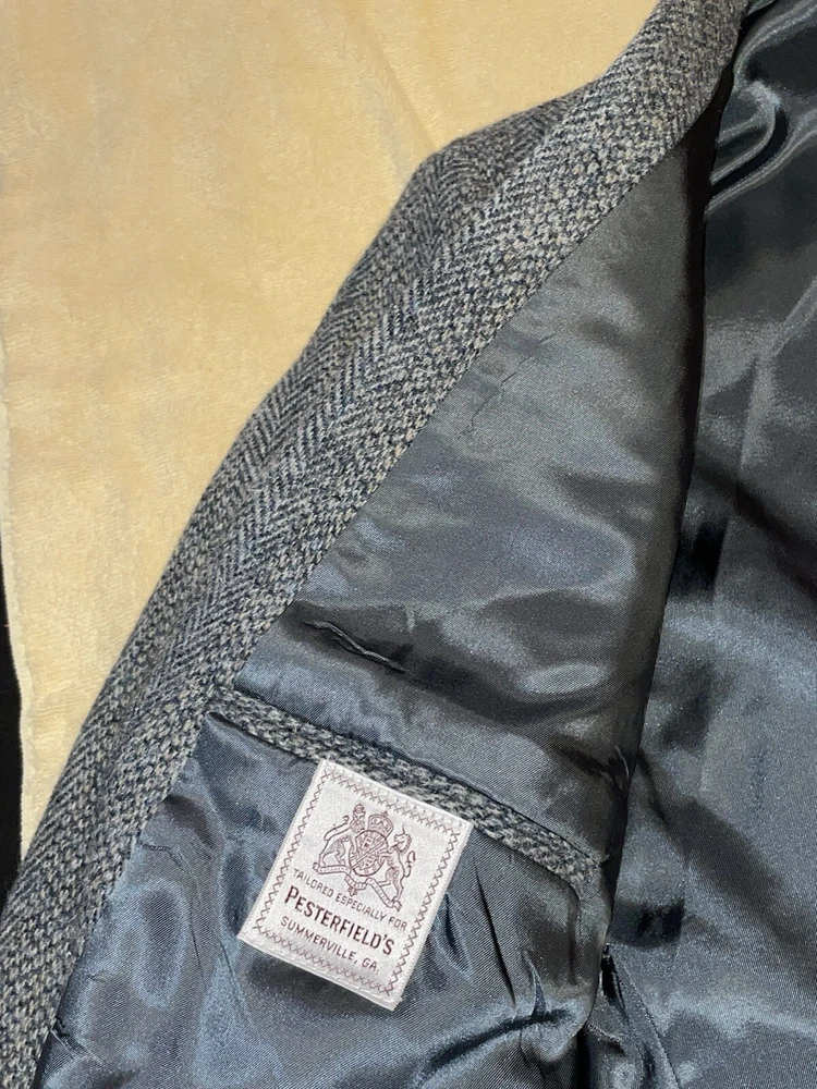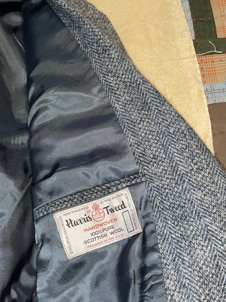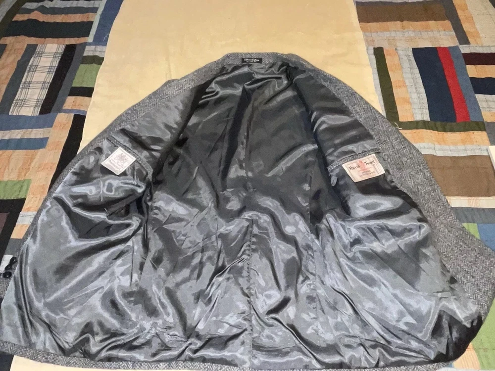 Size: No Size Tag Jacket/Coat Length: Regular Chest Size: 40 Fabric Type: Tweed Garment Care: Dry Clean Only Country/Region of Manufacture: United States Vintage: Yes Pattern: Herringbone Fit: Regular Occasion: Business, Casual, Party/Cocktail, Wedding Color: Gray Theme: Classic, Designer, Sports Department: Men Size Type: Regular Style: Two Button Type: Sport Coat Material: 100% Pure Scotish Wool Brand: Harris Tweed Jacket Cut: Single-Breasted Jacket Front Button Style: Two-Button Season: Fall, Spring, Winter