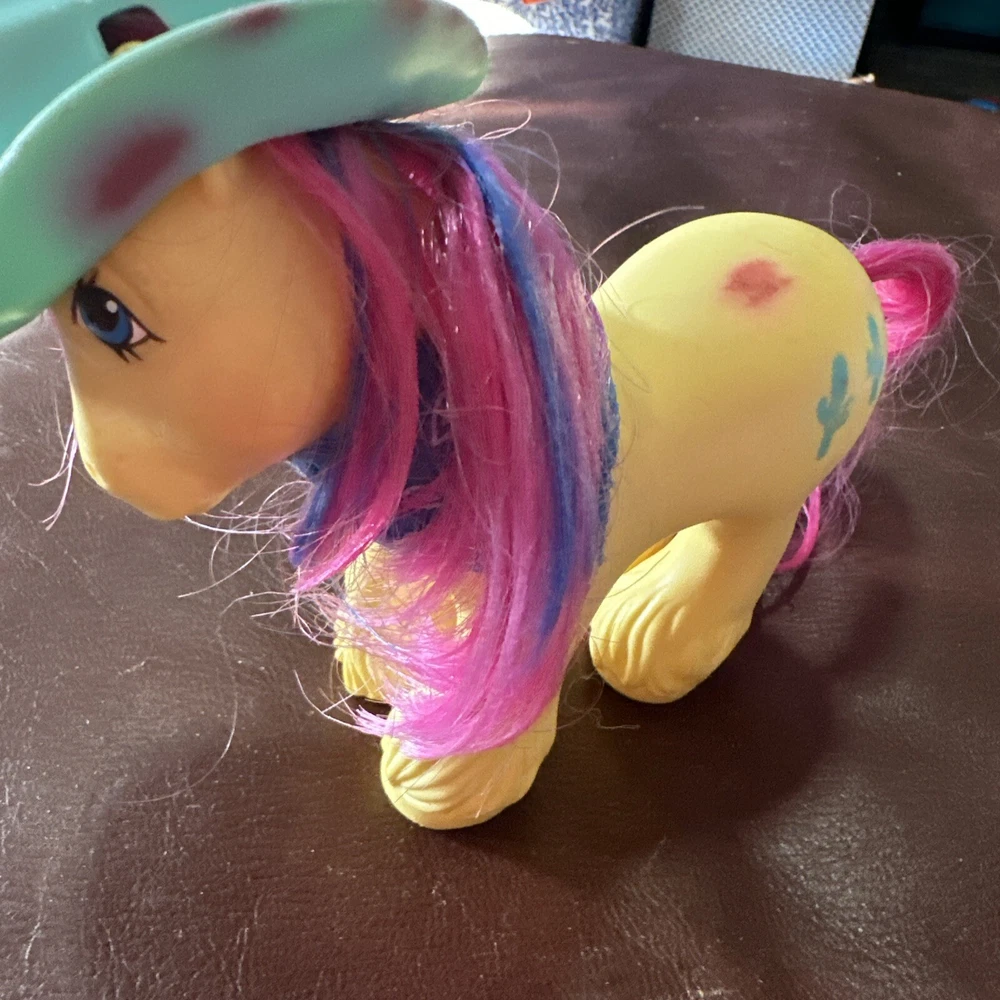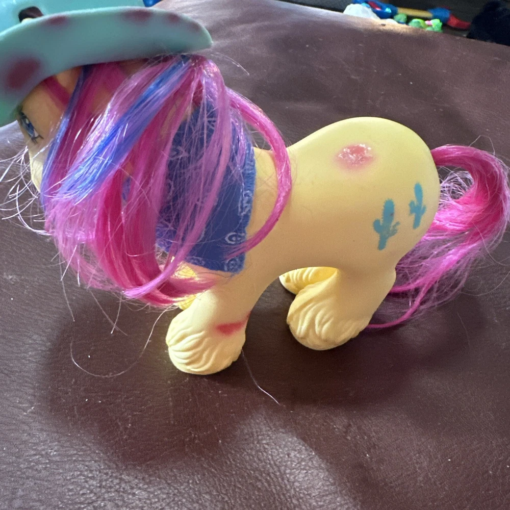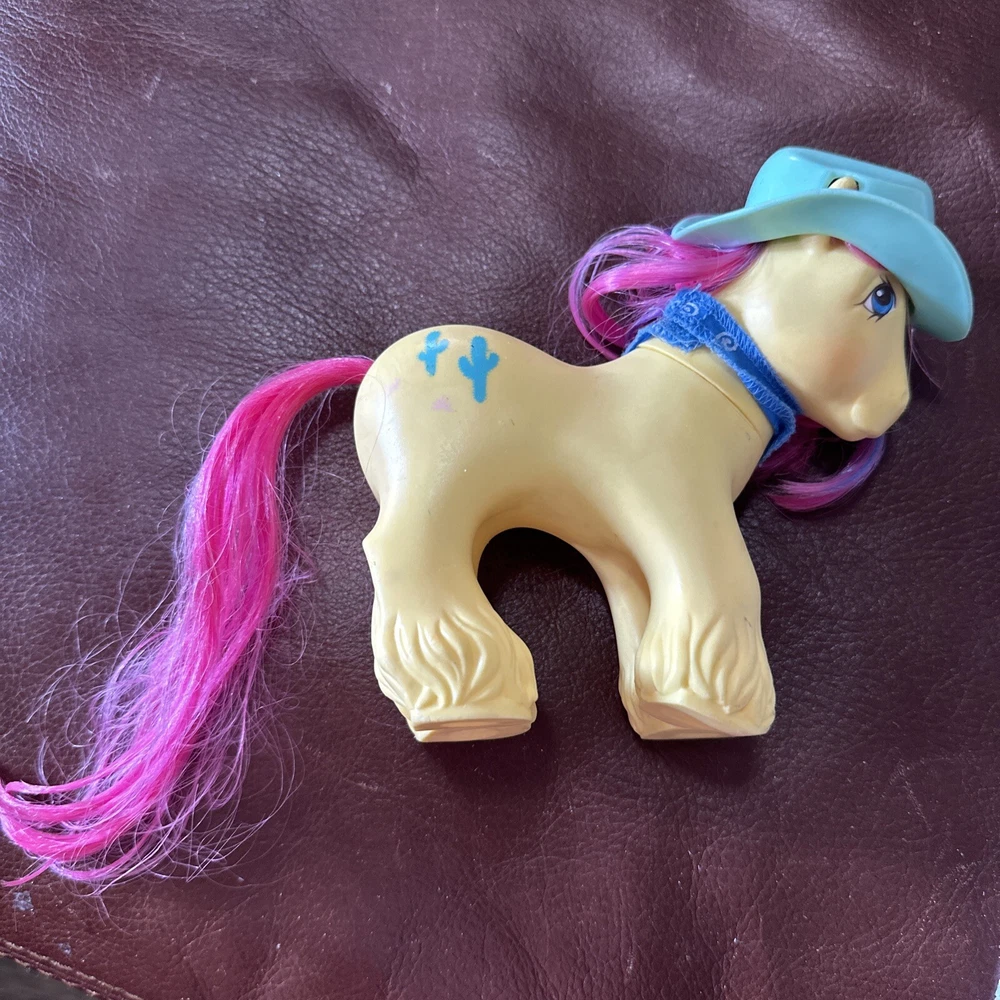 Introducing a vintage My Little Pony action figure from Hasbro, featuring the character Tex the Cactus Cowboy. This rare find, manufactured in 1987, comes with a bandana and a hat made of durable plastic. The figure is part of the My Little Pony franchise and series, and is perfect for collectors or fans of animation. The character Tex is depicted with a western-themed outfit, complete with a hat and bandana. This vintage action figure is a great addition to any collection, and is sure to bring back memories of the beloved TV show. Don't miss out on this rare find! Please see photos for imperfections.
