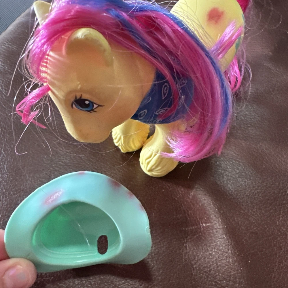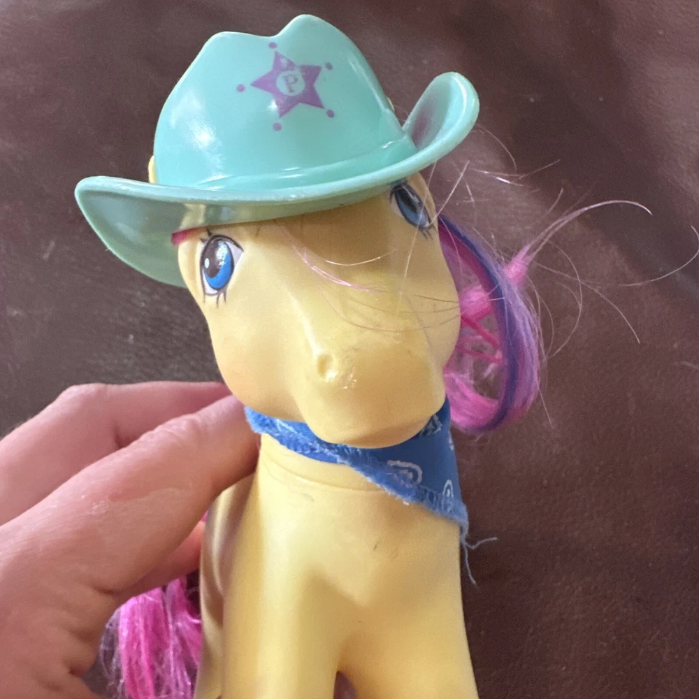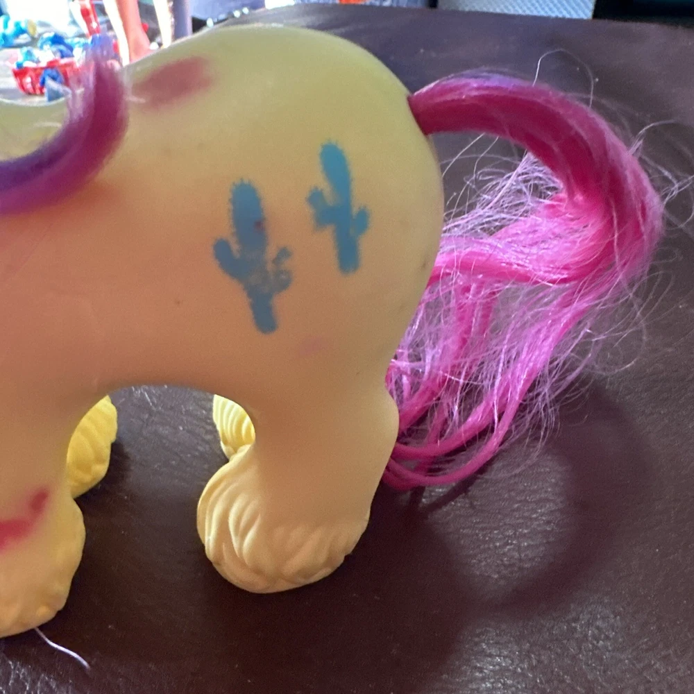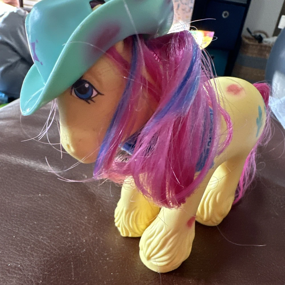 Introducing a vintage My Little Pony action figure from Hasbro, featuring the character Tex the Cactus Cowboy. This rare find, manufactured in 1987, comes with a bandana and a hat made of durable plastic. The figure is part of the My Little Pony franchise and series, and is perfect for collectors or fans of animation. The character Tex is depicted with a western-themed outfit, complete with a hat and bandana. This vintage action figure is a great addition to any collection, and is sure to bring back memories of the beloved TV show. Don't miss out on this rare find! Please see photos for imperfections.
