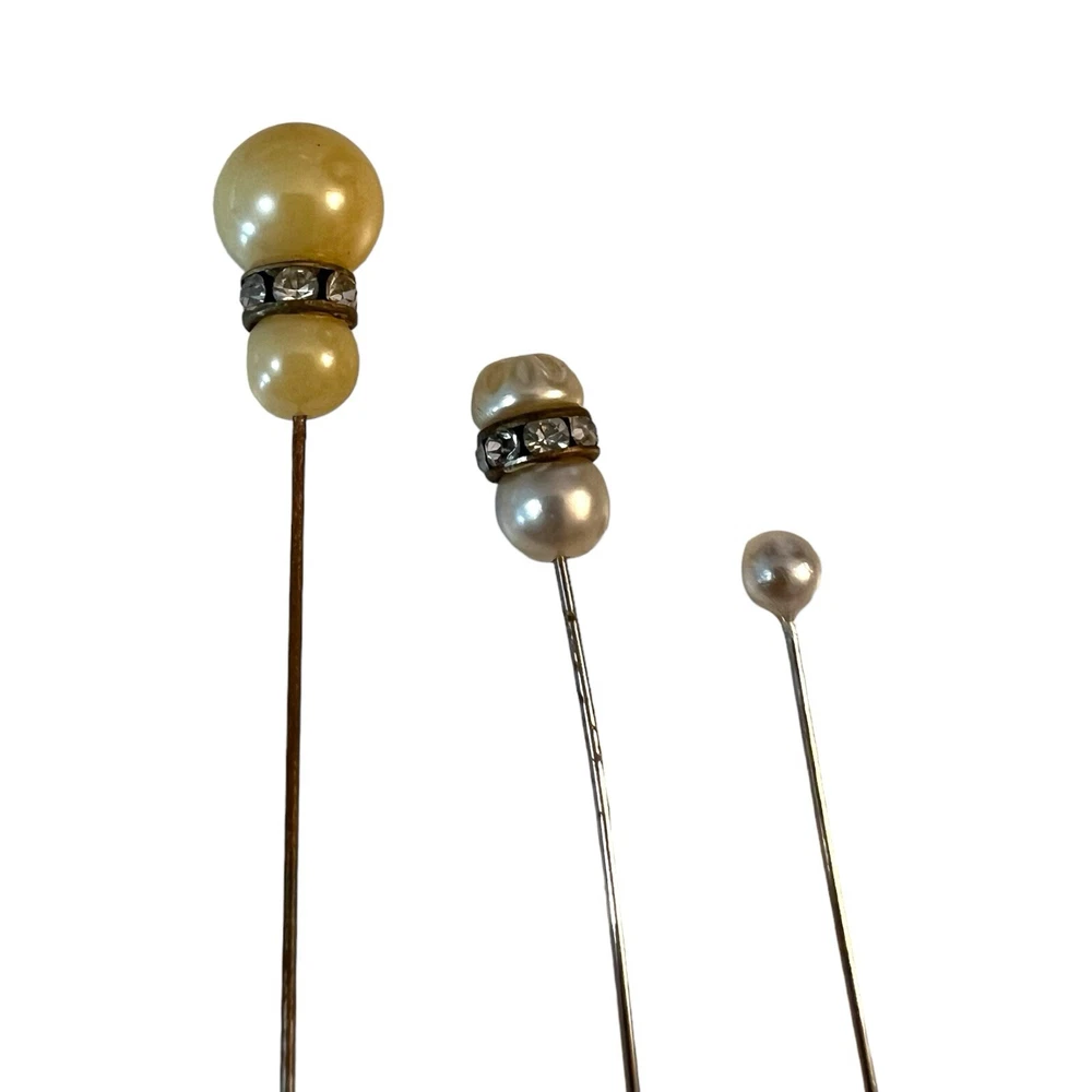 Lot of 3 vintage hat pins with pin cushion. Good preowned condition for pins, pin cushion has obvious wear with some holes - see photos for more details.