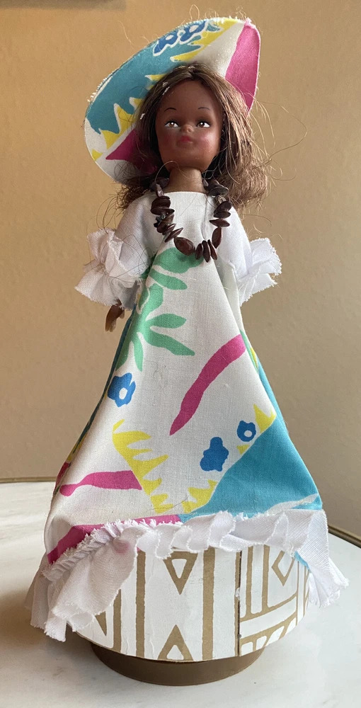 Vintage Hawaiian Doll Revolving Music Box Vinyl Hawaiian Girl Hawaii 1997 Lanakila Crafts Owner added date of 1997. Hat missing top fringe. Review images as part of description