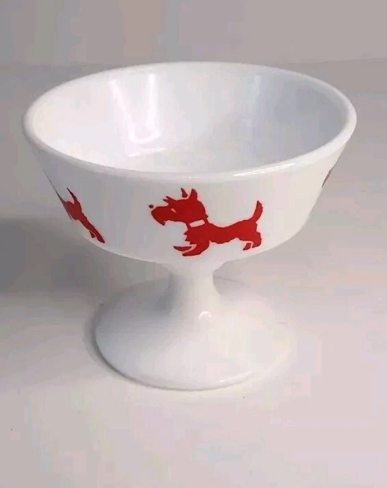 This vintage milk glass cup from Hazel-Atlas features a charming red scottie dog pattern on a milk glass background. This is the perfect size for serving sherbet or any other scoop of your favorite sweet treat. This piece is in excellent condition, showing very minor wear around the base rim as shown in the picture & reflected in the price. It isn't something that is easily seen but can feel when running your finger across it. There is NO heavy damage & it displays beautifully. It is recommended to hand wash this cup only. It is an original piece from the mid-20th century. This piece is perfect for dog lovers, collectors of vintage glassware, or someone simply looking to add some fun to their kitchen decor. This cup will ship with immense care & fast! If you have any questions or would like more pictures of a certain angle I may have missed, just reach out & I will reply promptly. Thank you!