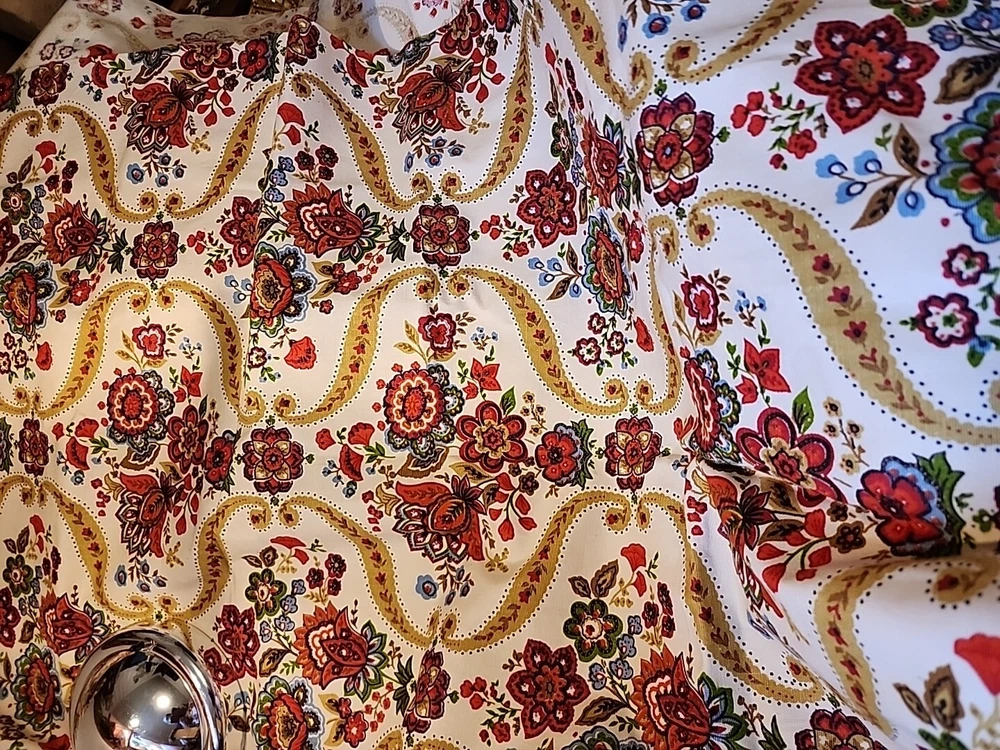 ITEM-SEW101 This vintage cotton material features a lovely floral print in beige, rust, and gold and blue. The heavy fabric weight is perfect for sewing projects, whether it be home decor or fashion. The material measures 45 inches by 50 inches and is unbranded, adding to its unique charm. Its new pre-owned vintage never used status should not detract from its potential use in your next creative endeavor. Great for pillows curtians table cloth..many uses.