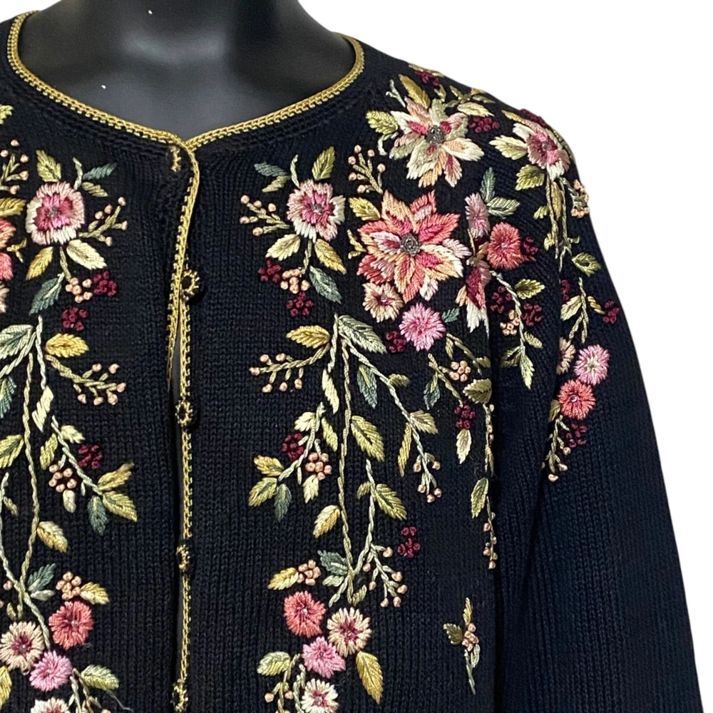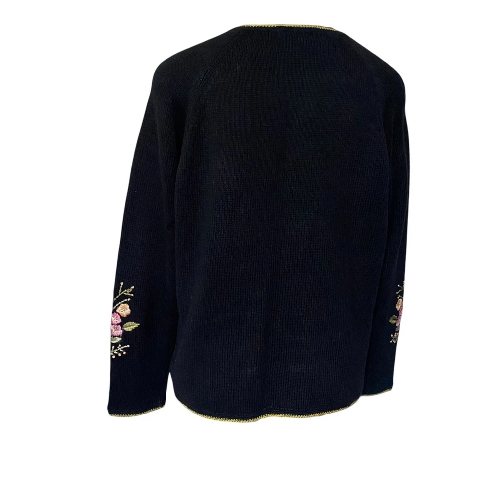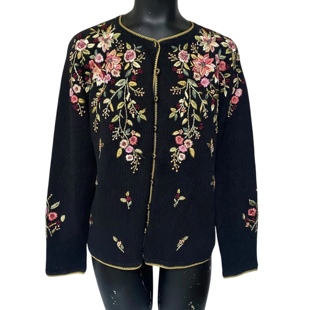 Pattern: Floral Material: Cotton Blend, Cotton-Blend Neckline: Round Neck Color: Black Type: Sweater Style: Cardigan Sleeve Length: Long Sleeve Size: Medium Accents: Embroidered Department: Women Brand: Heirloom Collectibles Size Type: Regular Fabric Type: Knit Fit: Relaxed Knit Style: Tight-Knit
