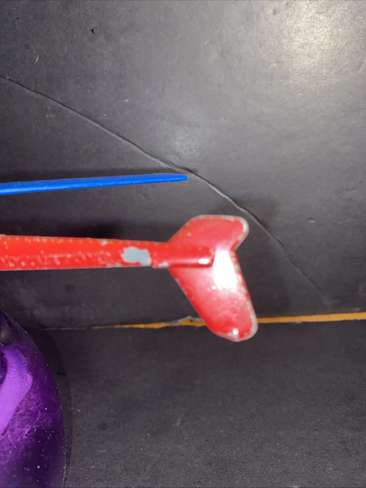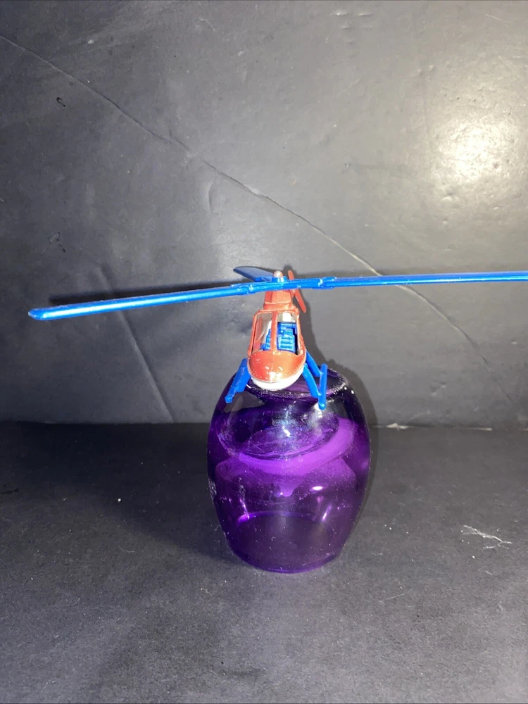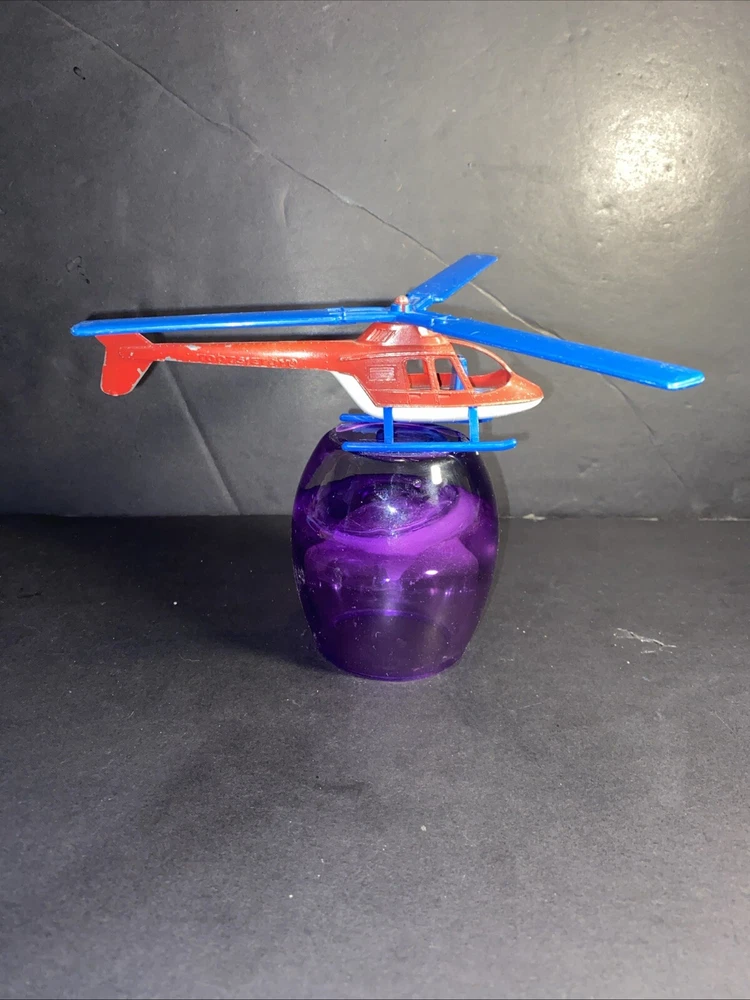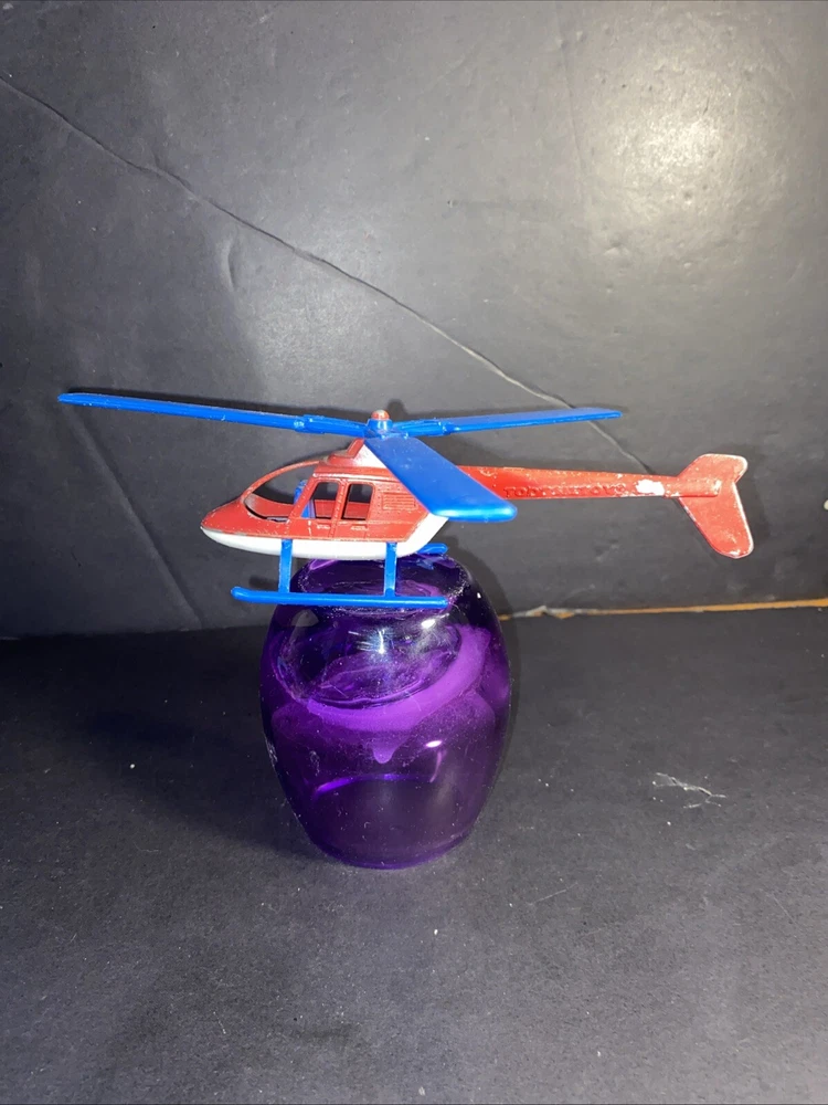 The vintage TootsieToy helicopter features a red, white, and blue metal body with plastic blades. It is a diecast model of a helicopter from the Tootsie Toy brand, made in the United States. This collectible toy is designed with a helicopter theme and is suitable for both boys and girls to play with. Flaws include minor paint loss on one side of the back