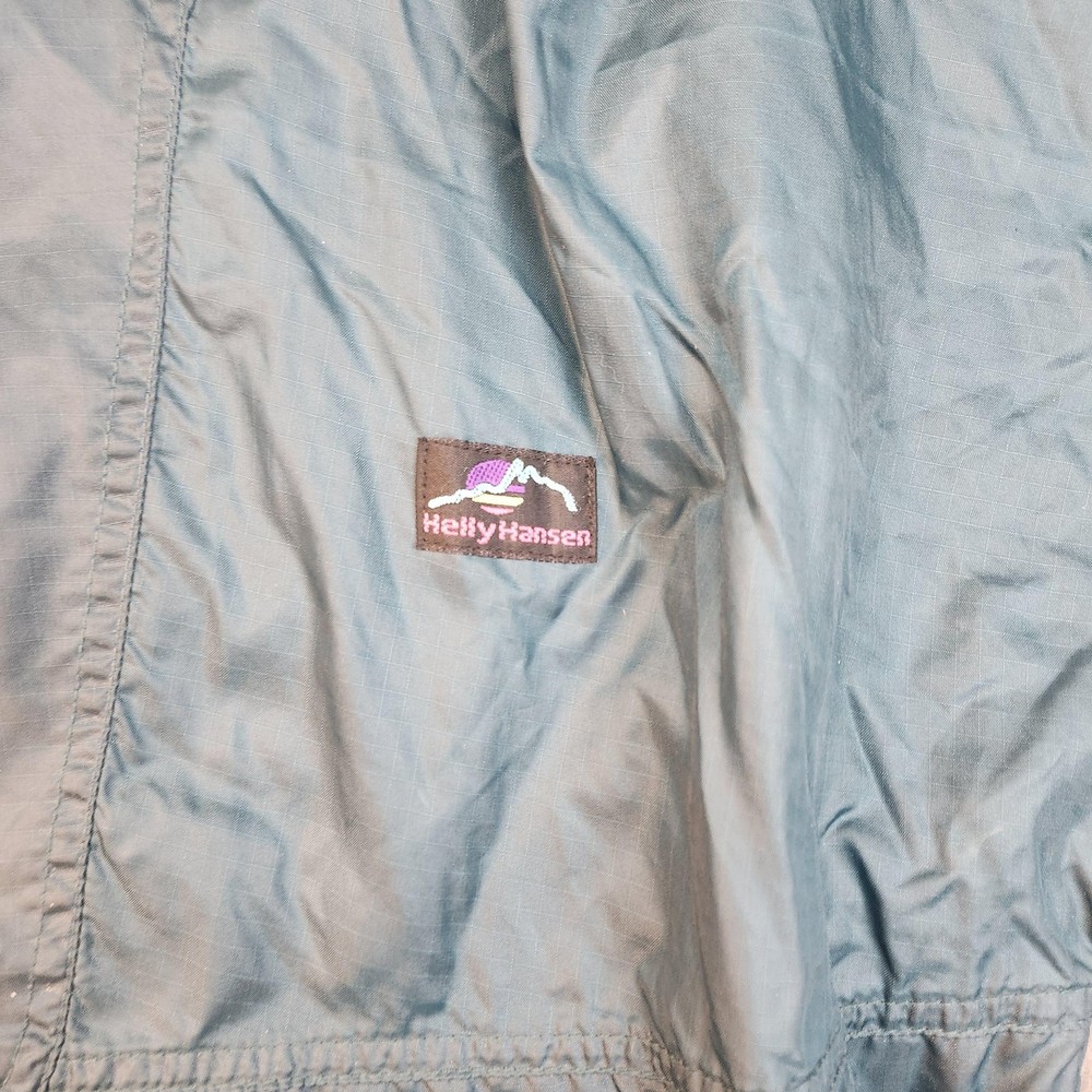 Brand: Helly Hansen (tag reads "HellyHansen" with HH logo) Item: Hooded windbreaker jacket with full zip front Gender/Size: Mens Medium (M) Color: Teal/green exterior with purple lining Materials (from tag): Outer shell: 100% Nylon; Back: 100% Polyurethane Country of origin: Made in Hong Kong Features: Attached hood with drawcord; two front zip hand pockets; ripstop nylon shell; elasticized hem; lightweight packable-style design Branding/Logos: Helly Hansen chest patch logo; HH brand tag at neck Era: 1990s vintage styling and tag details Notes: Vintage items can vary from modern sizing; please review photos for fit and details.