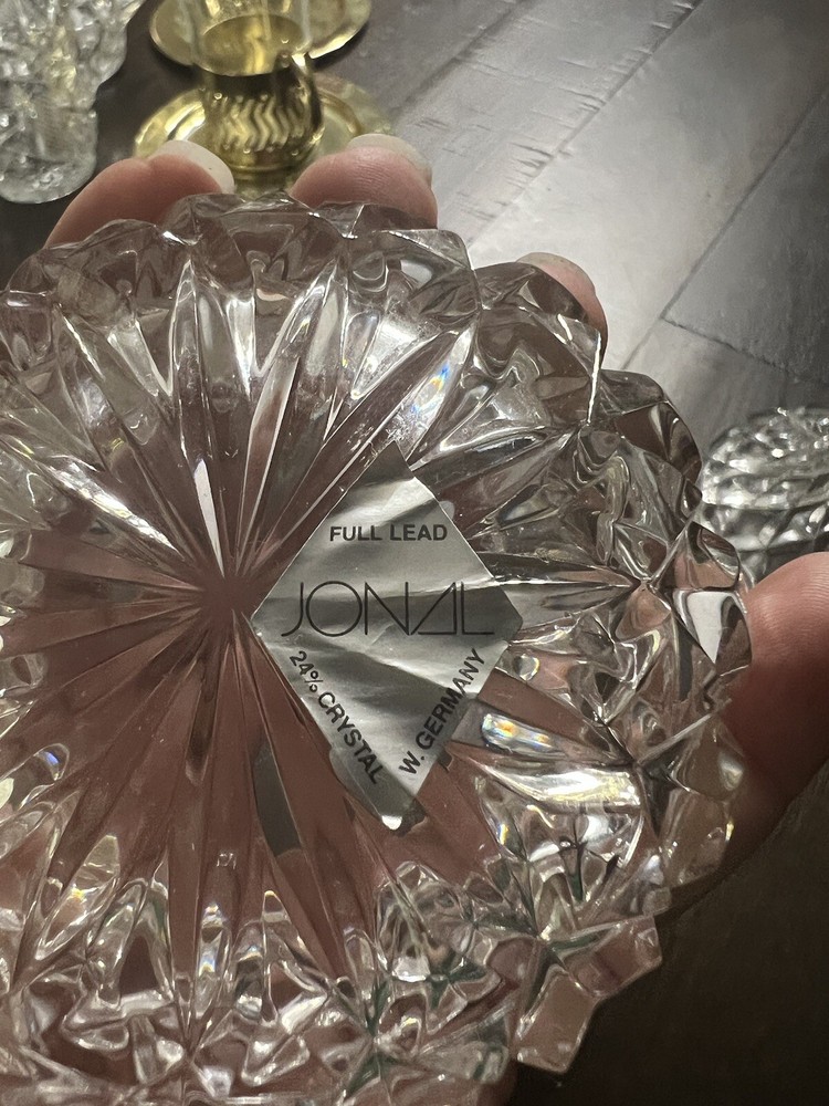 UPC:Does not applyColor:Cleargtin13:Does not applyHandmade:NoType:Crystal Trinket Candy DishType of Glass:CrystalVintage:NoCountry/Region of Manufacture:GermanyOriginal/Reproduction:Vintage OriginalMaterial:CrystalAntique:NoBrand:JONAL CRYSTAL LTD.