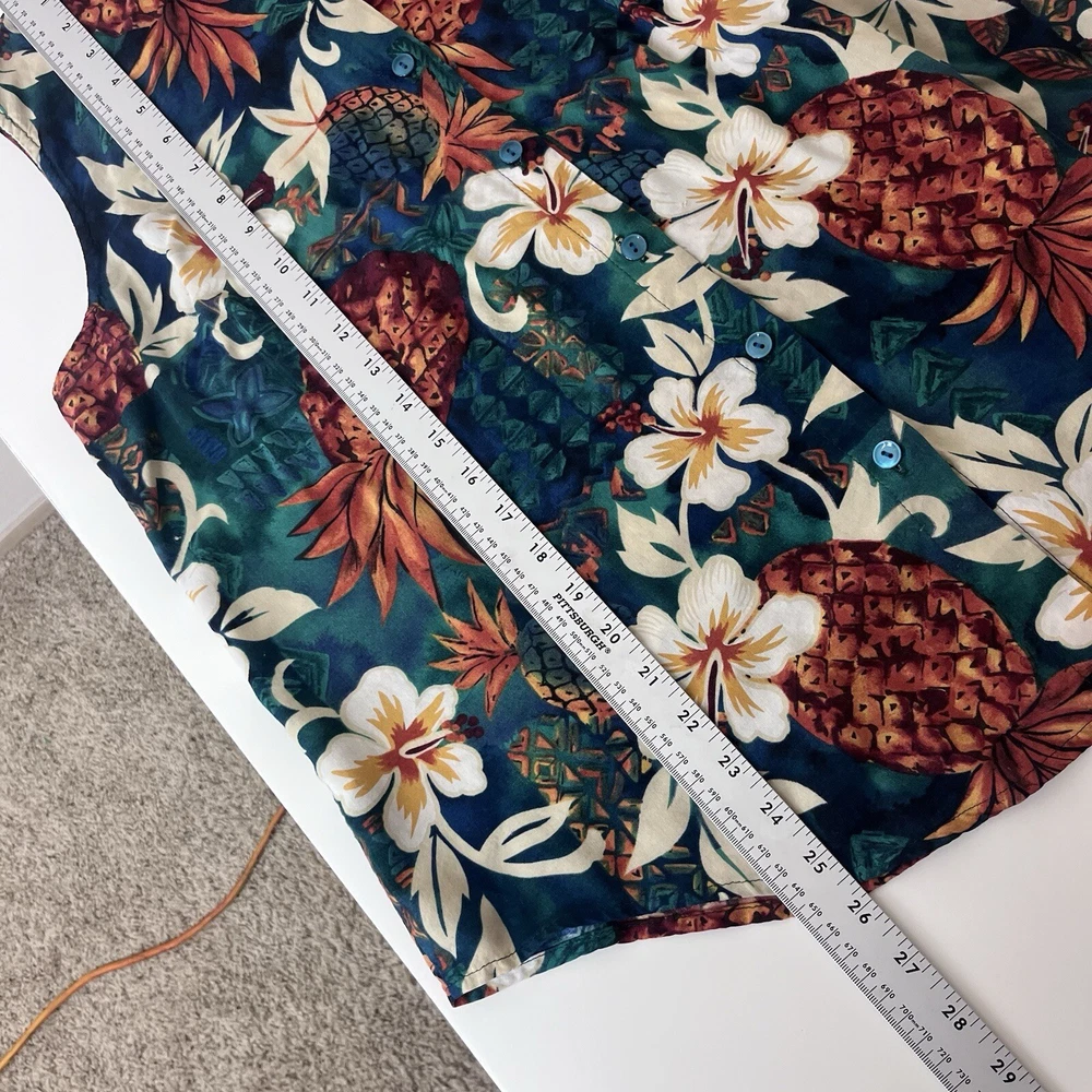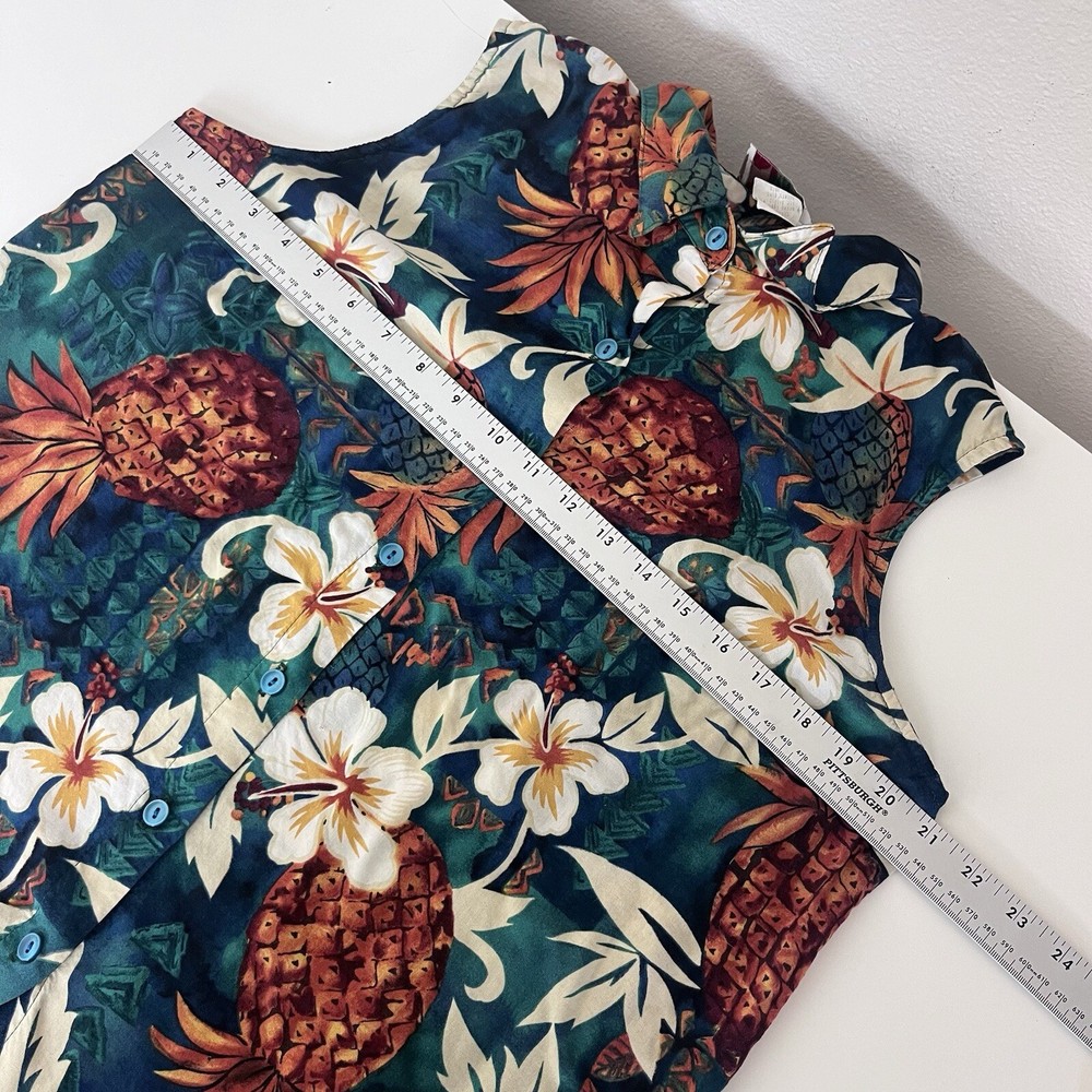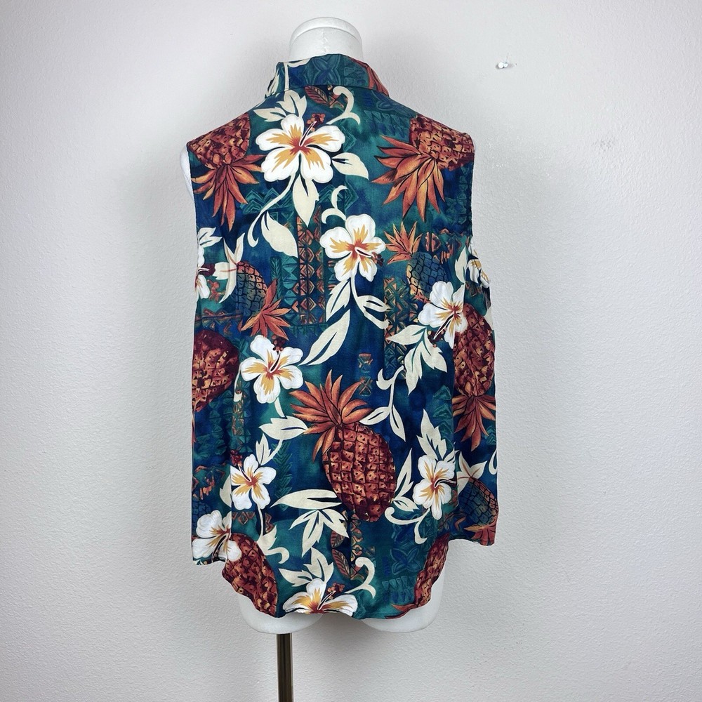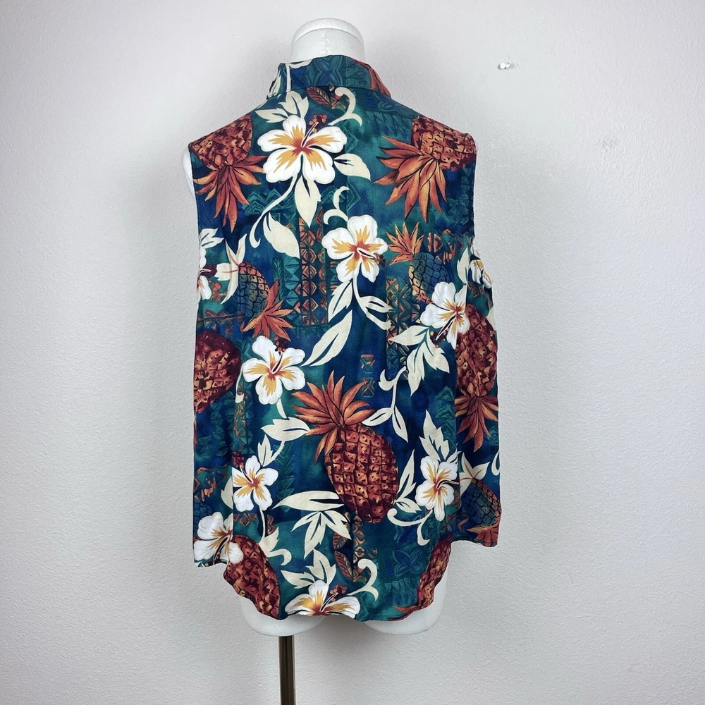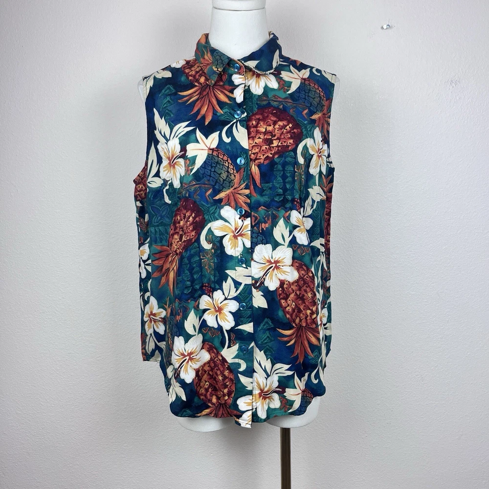 Size Type: Regular Fabric Type: Rayon Vintage: Yes Color: Multicolor Personalize: No Fit: Regular Size: L Type: Button-Up Occasion: Casual, Travel Brand: Hilo Hattie Pattern: Floral Handmade: No Country of Origin: United States Department: Women Sleeve Length: Sleeveless Material: Rayon Accents: Button Closure: Button Season: Fall, Spring, Summer Style: Basic Theme: 90s, Beach, Bohemian, Classic, Flower, Hawaiian, Retro, USA Neckline: Collared