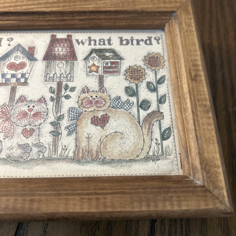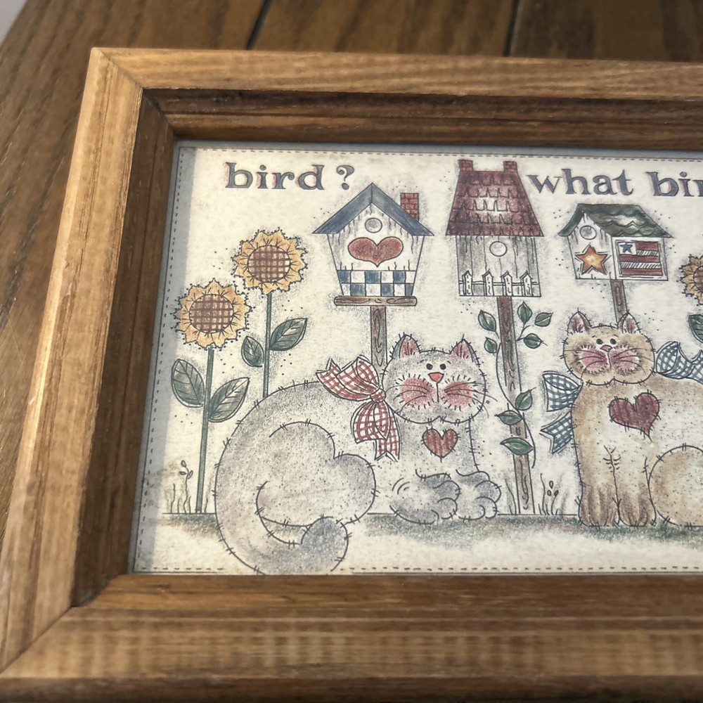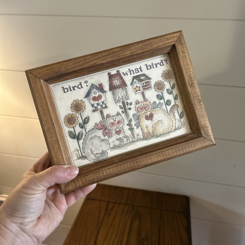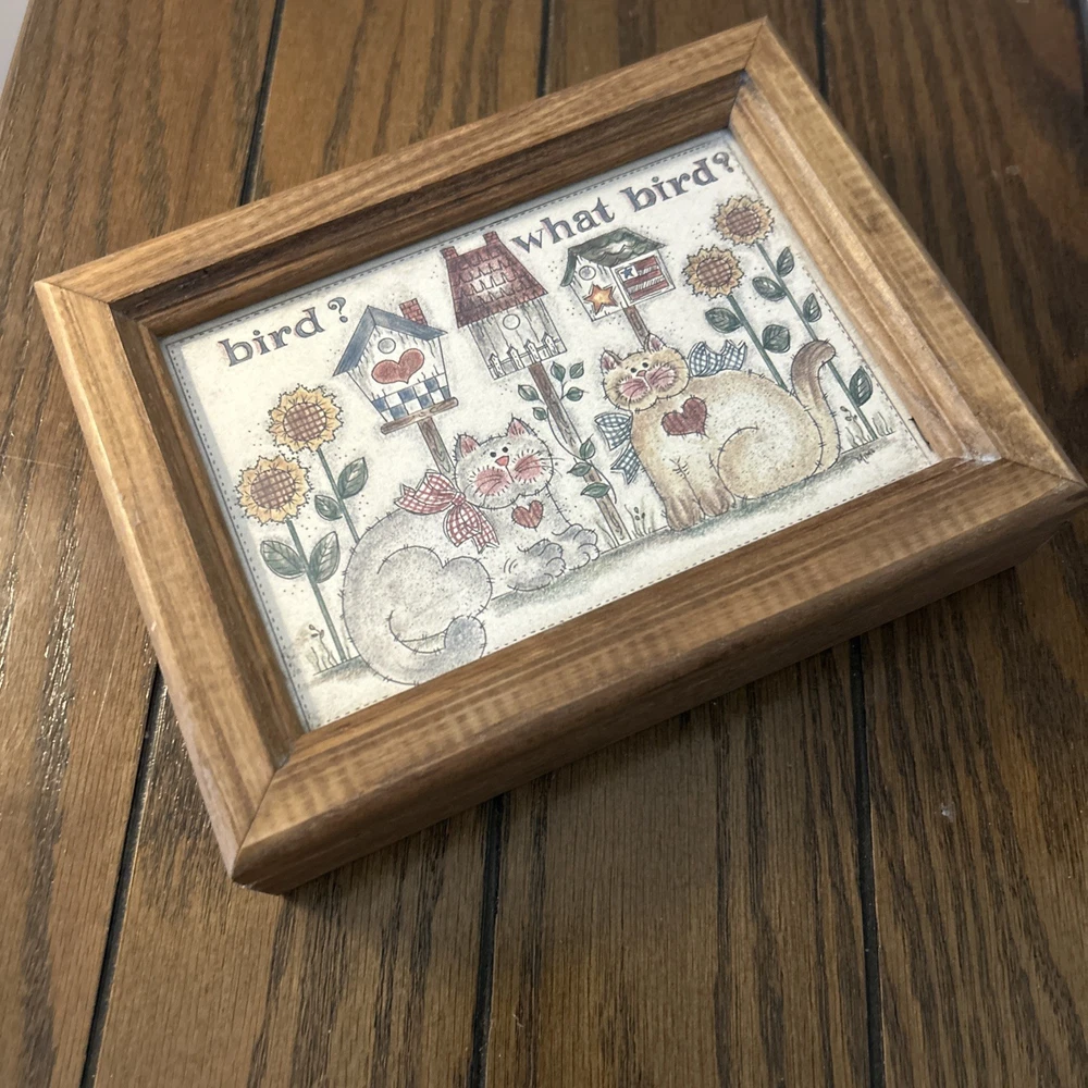This vintage trinket box with a hinged design features a charming bird theme with cats and kittens, perfect for farmhouse country style decor. Made of wood, the medium-sized rectangular box is multicolored with a unique "Bird? What Bird?" design. The trinket box is ideal for all occasions and is a collectible item from the 1980s, making it a unique and nostalgic addition to any home's decor.