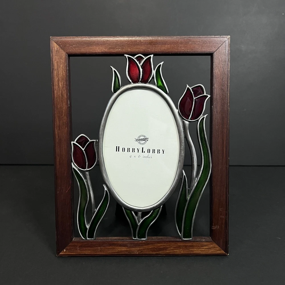 Vintage Hobby Lobby "Stained Glass" Metal Tulips Wood Photo Picture Frame