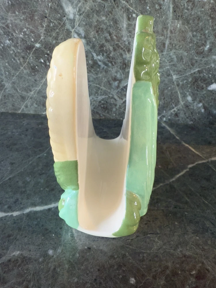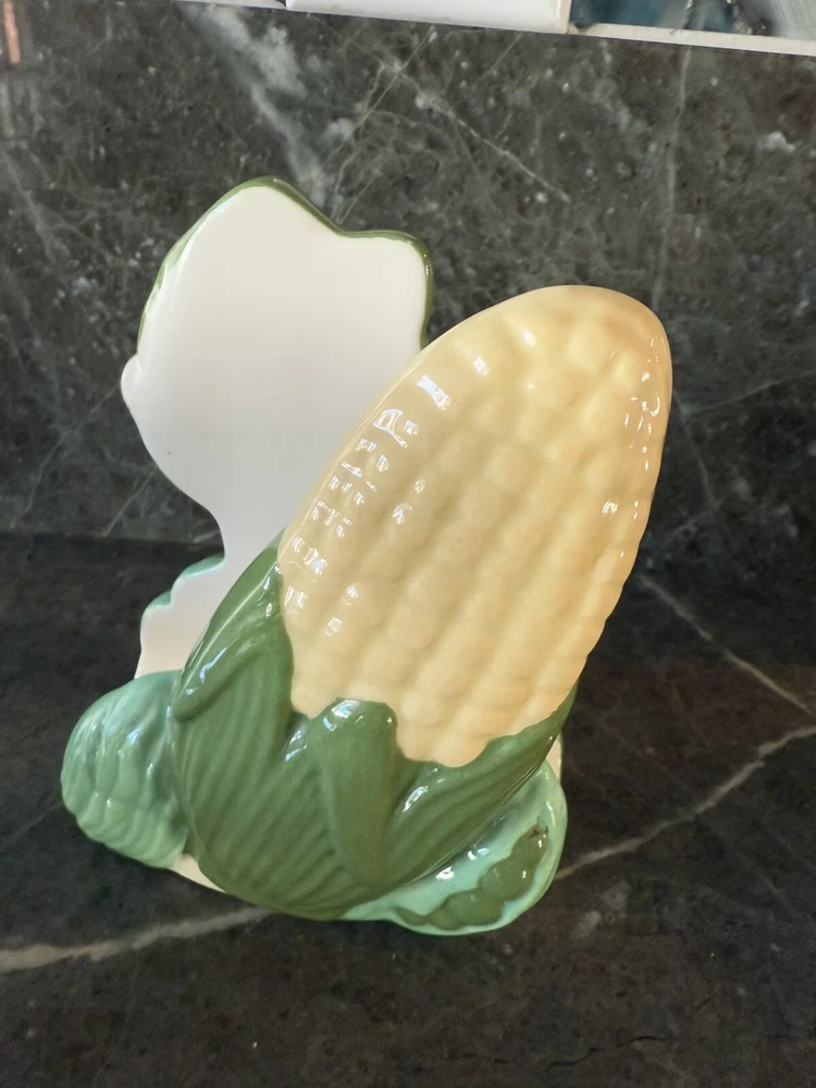 This vintage napkin holder is a charming addition to any kitchen or dining room decor. Handmade in a Toleware style, the holder features a design of corn on the cob and celery, adding a touch of whimsy to the table setting. In excellent used condition, this ceramic piece is perfect for holding napkins in place while adding a nostalgic and unique flair to the serving area.