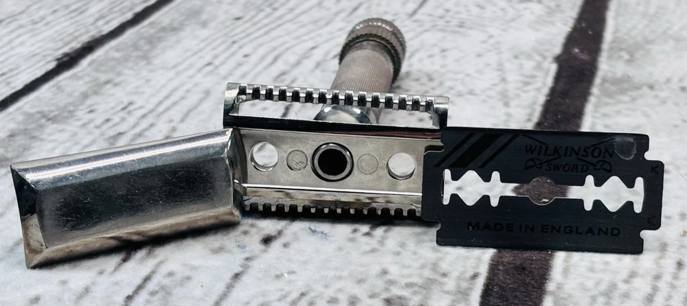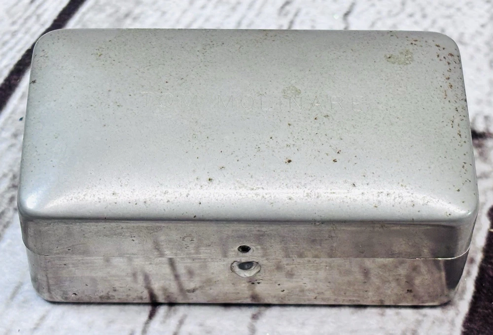 Vintage Hoffritz Germany Slant Bar Safety Razor w/ Metal Case & Blades Classic vintage Hoffritz slant bar double-edge safety razor made in Germany, housed in its original monogrammed metal travel case. Includes one installed Wilkinson Sword blade plus an additional Wilkinson Sword Chromium Edge blade pack. The razor disassembles easily and functions properly—threads turn smoothly, and the mechanism operates as intended. •Brand: Hoffritz Germany •Type: Slant Bar Double-Edge Safety Razor •Material: Chrome-plated metal •Included: Original metal case (engraved “Tom Molinare”), Wilkinson Sword blades •Condition: Razor shows normal surface wear and light tarnish consistent with age but remains in good overall condition. The case has visible exterior wear and oxidation; interior velvet lining shows fading. With some gentle polishing, both the razor and case could present beautifully. •Ships securely Please zoom in on all photos to review condition and details before purchasing. The razor is fully functional and displays well as both a collectible and usable piece of classic shaving history.
