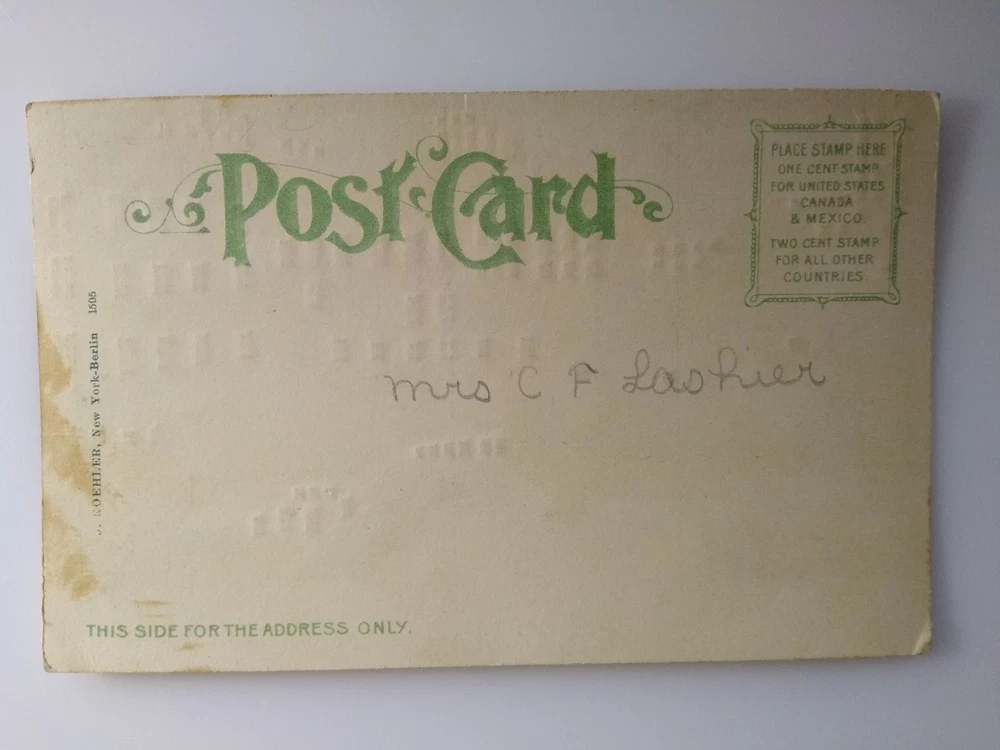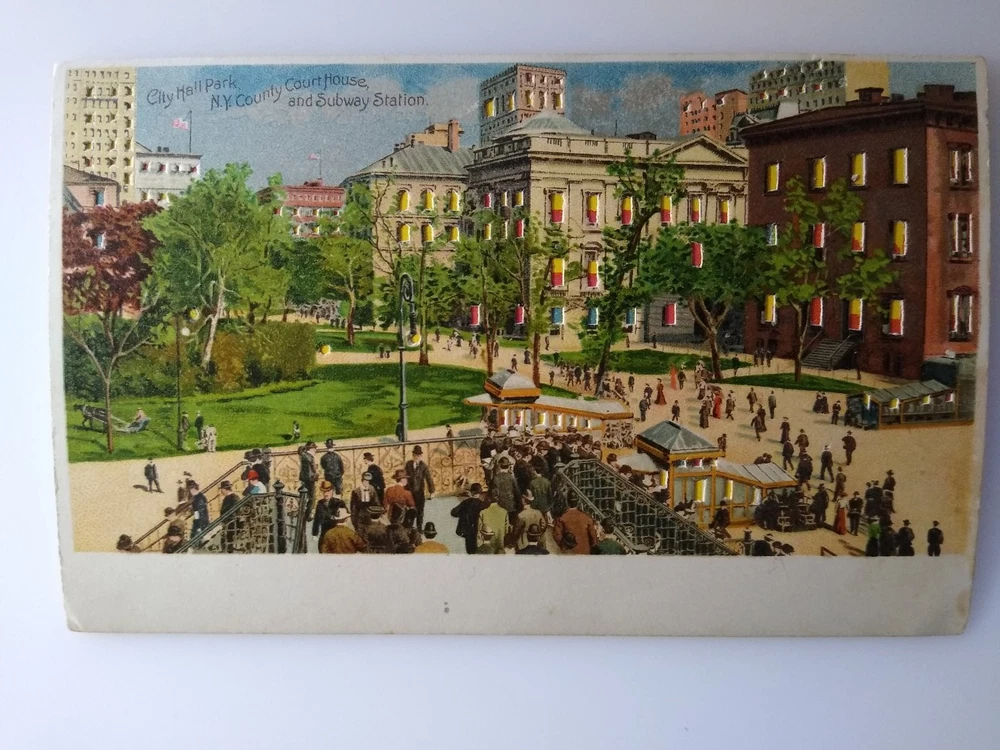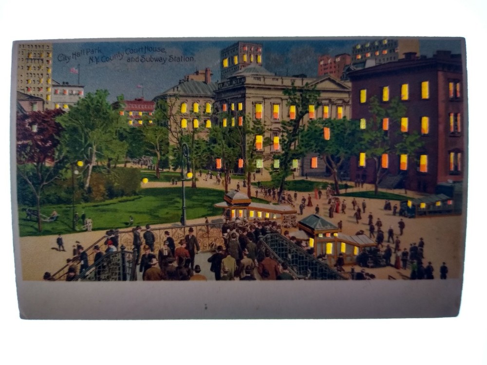 Vintage hold to light antique postcard. Has some curling. Please view both sides of photos for condition as most will show corner dings and age wear. This rare vintage hold-to-light postcard showcases a detailed view of City Hall Park, the New York County Courthouse, and a bustling subway station entrance in New York City. The postcard features a nighttime scene with illuminated windows and street lamps, brought to life by the innovative hold-to-light technology that allows light to shine through specific cut-out areas, creating a captivating glowing effect. The vibrant illustration captures the early 20th-century urban atmosphere with pedestrians and architectural landmarks. Printed on standard size paper measuring approximately 5.5 x 3.5 inches, this original postcard was published by J. Koehler, New York-Berlin, a well-known publisher of the era. The card's unique hold-to-light feature combined with its depiction of iconic NYC landmarks makes it a collectible piece for postcard enthusiasts and vintage urban history collectors alike. Its artistic and historical significance offers a glimpse into New York City's rich past and the creative postcard printing techniques of the early 1900s.