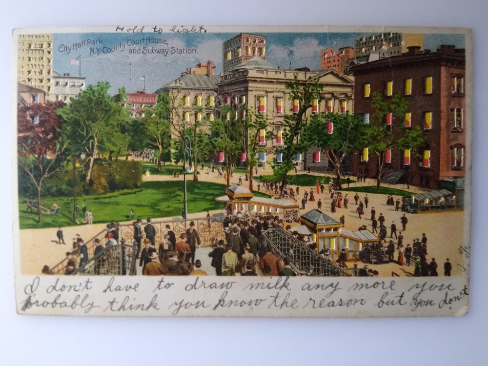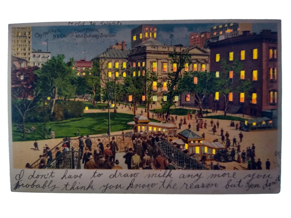 Vintage Hold-to-Light Postcard NYC City Hall Park & Subway Station HTL Antique