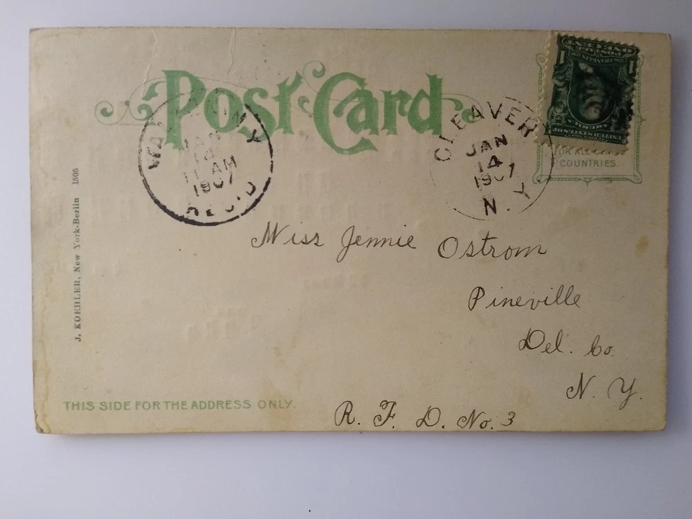 Vintage hold to light antique postcard. Writing on front. Please view both sides of photos for condition as most will show corner dings and age wear. This captivating vintage postcard features a detailed night scene of City Hall Park, the New York County Courthouse, and the Subway Station in New York City. It is a classic example of an early 20th-century Hold-to-Light postcard, where windows and lamps light up when held against light, creating a charming illuminated effect. The postcard showcases a bustling crowd and intricate architectural details, reflecting the urban vibrancy of New York in the early 1900s. Printed by J. Koehler, New York-Berlin, this postcard measures the standard 5.5 x 3.5 inches size and is made of paper. It carries a 1-cent Benjamin Franklin stamp postmarked January 14, 1907, confirming its era and authenticity. The handwritten message along the bottom edge adds a personal historical touch, enhancing its collectible value. This original Hold-to-Light postcard is an exceptional piece for collectors interested in early New York landmarks, vintage lighting effects, or antique postal history.