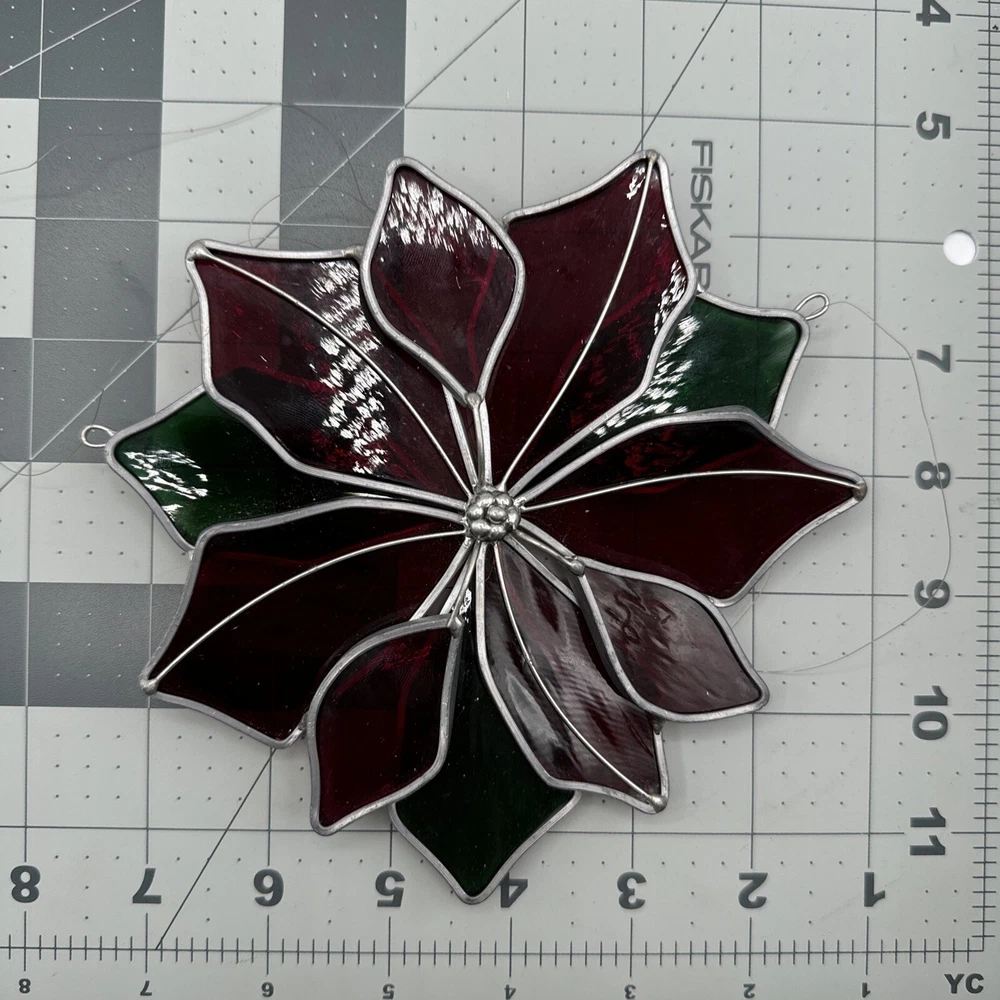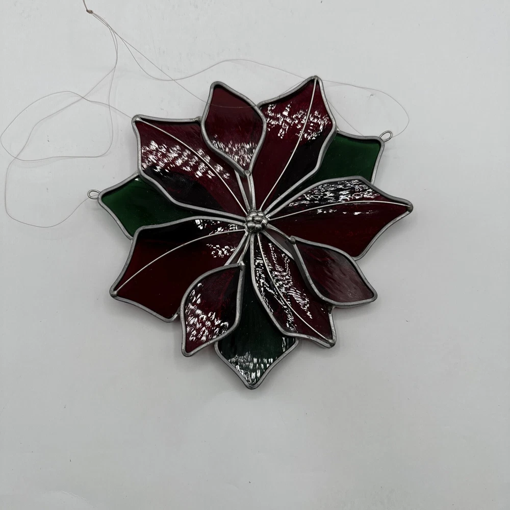 Vintage Holiday Christmas Stained Glass Poinsettia 3D Hanging Panel Pre-owned. Minimal wear. Some glass "loose" but not at risk of falling out. See measurements and pictures.