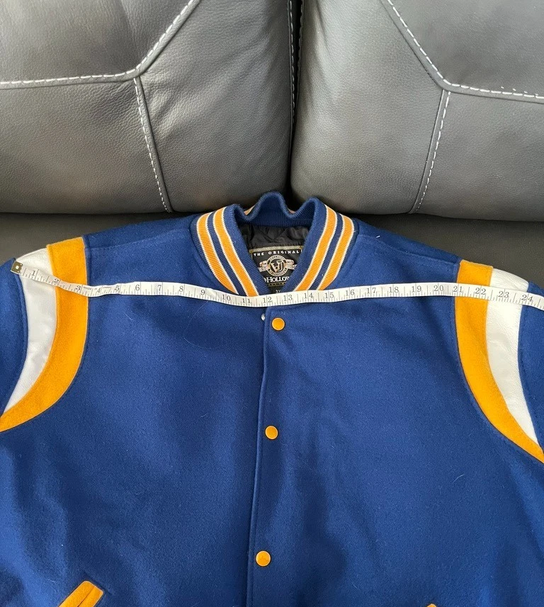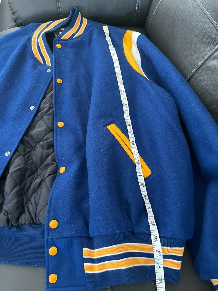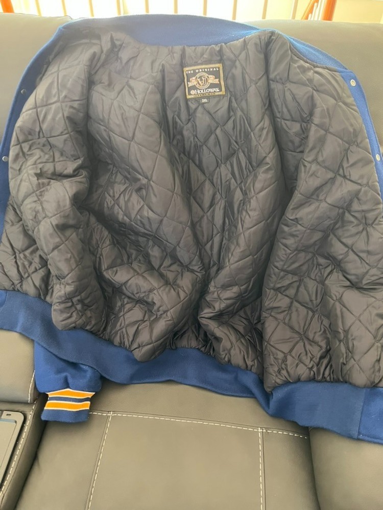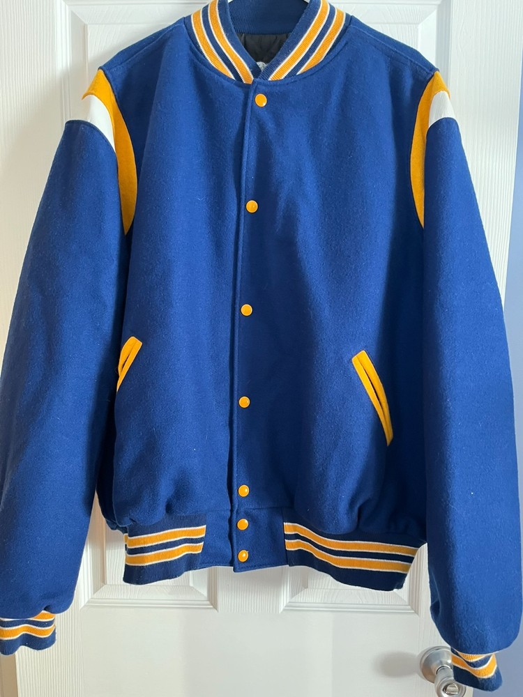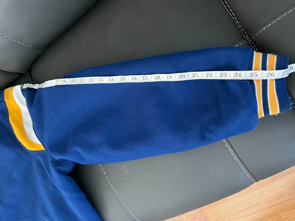 This VTG Holloway Men's Large Blue/Gold Varsity Jacket is a retro vintage piece perfect for those who love the 90s and Y2K style. Made from wool with a nylon lining, this jacket features a stand-up collar, snap closure, and is ideal for winter, fall, and spring seasons. It is designed for casual occasions and includes pockets for added convenience. The jacket's solid blue color and USA theme make it a great choice for those who appreciate a touch of nostalgia in their outerwear. Made in the United States by Holloway.