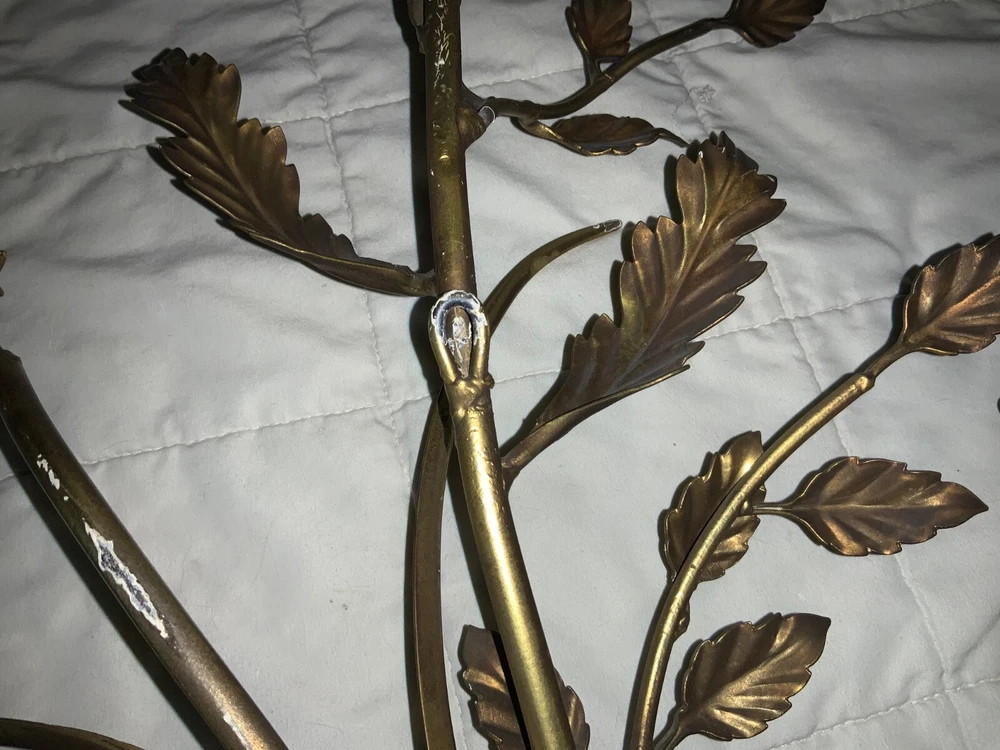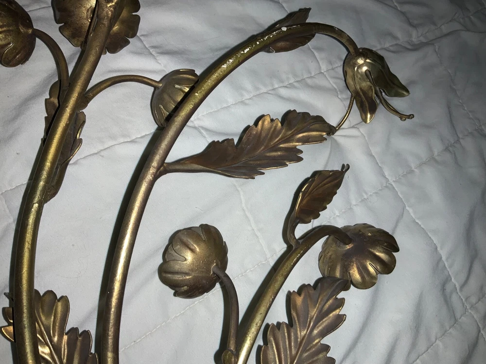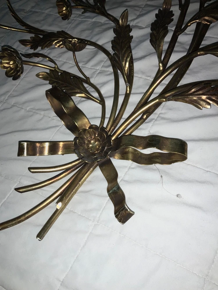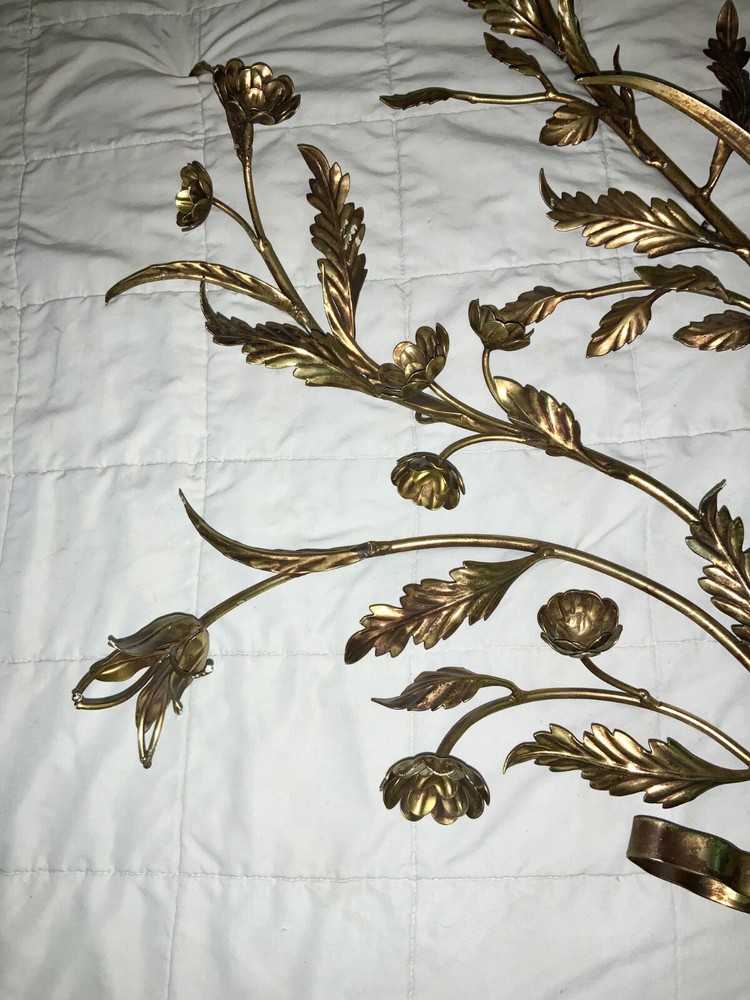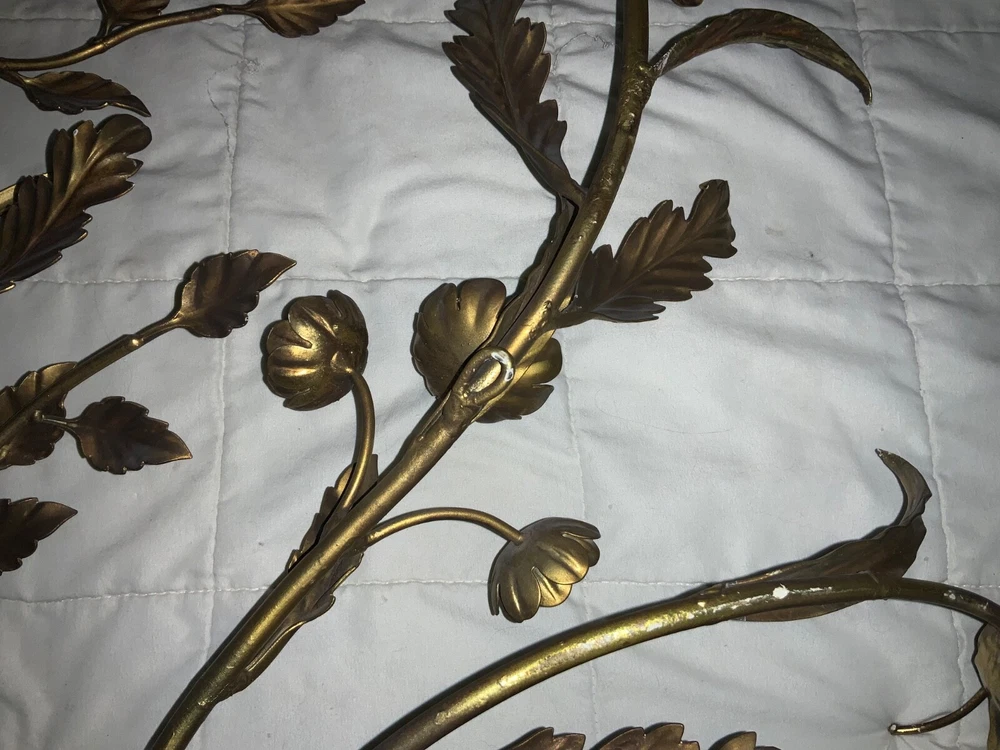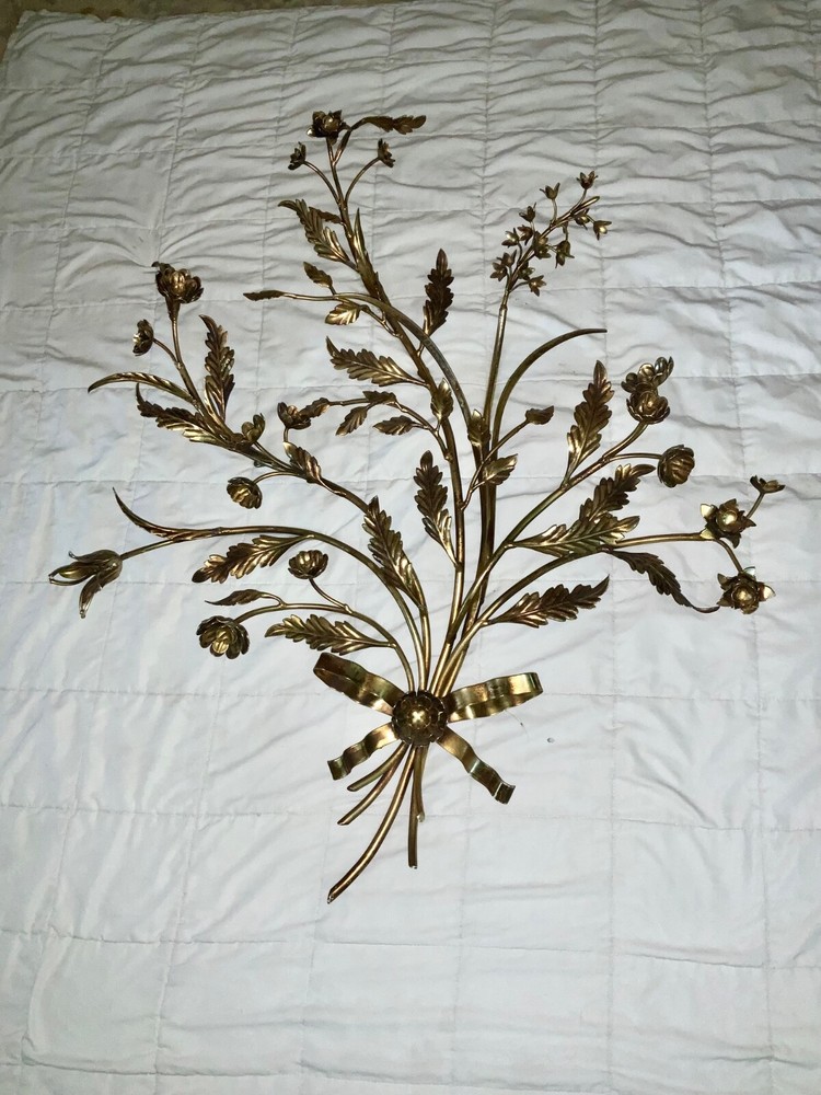 This vintage Italian Hollywood Regency Style gold gilt tole wall art measures 41 x 34 inches, making it a large and eye-catching piece for any home decor. The rich gold color and intricate design give it a luxurious and elegant look, perfect for adding a touch of old-world charm to a space. Made of tolewear metal, this post-1940 piece showcases the sophisticated style and craftsmanship of Italian design. Ideal for collectors of decorative art, this unique and original piece is sure to be a standout addition to any collection. Please see pics for dimensions and condition. Message me with any additional questions of for more photo’s. Item is heavy weights 8.8 lbs.