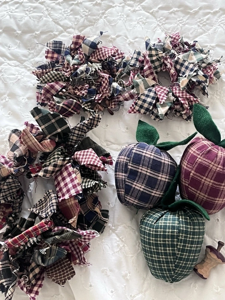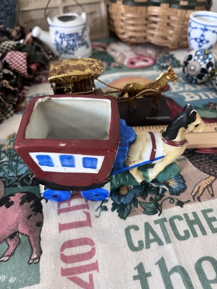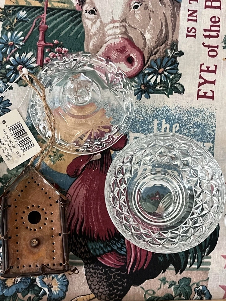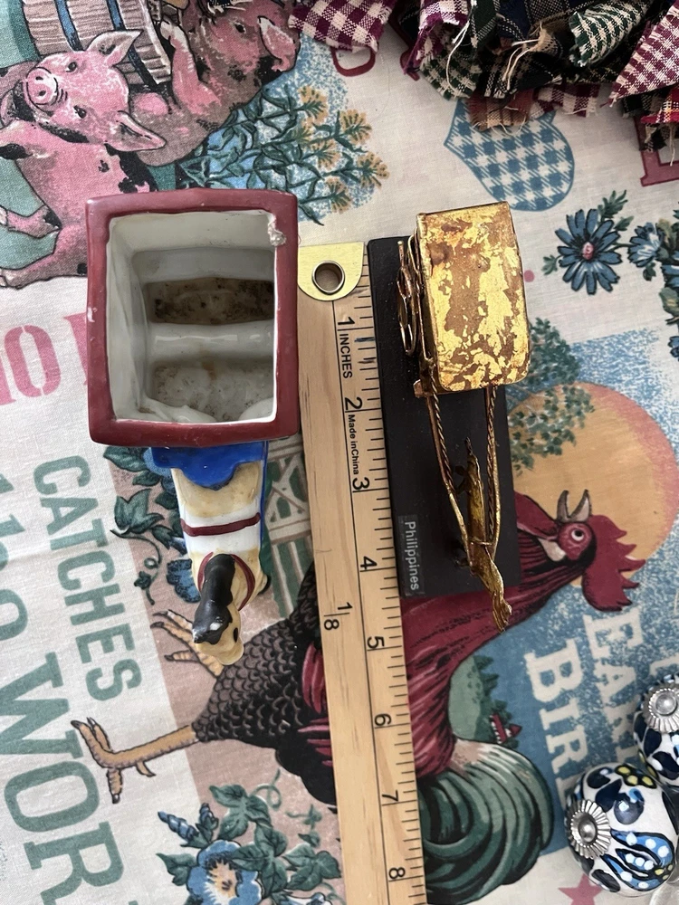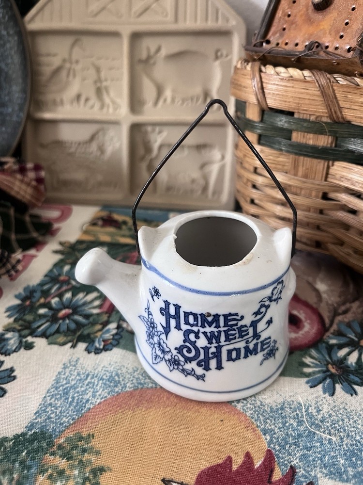 Beautiful lot! All has been well cherished changing out decor. There is the adorable little porcelain water can, the little occupied Japan planter,the candle rag wraps double A batteries Handmade heart basket with the wall hanging heart basket, the glass sugar bowl, the vintage cookie mold too cute, little buggy made of metal, two regency England brass wall plates see photos one has crackling, the blue and white glass door knobs small, and other items I may have missed.All has belonged to me like most items I sell I change out seasonal most of my home decor. Drives the hubby nuts but what’s a gal to do lol.Blow up all photos please part of the description as well. Other than mentioned no chips etc in glass.I also have another lot or two that I paired with all this. I have a gorgeous large framed primitive picture listed also that went perfect and that is how I had my dining room:) I don’t sell items that I would not want that are all damaged. Hoping to end selling soon so get while ya can. Please ask any questions happy to reply. All sales are finale. All will be packed by professional’s as well. Have a blessed day thanks. *the table cloth displayed on is not included thanks.