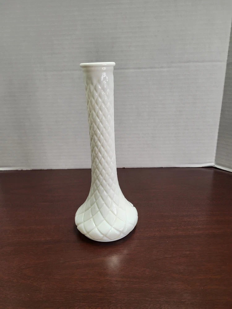Add a touch of vintage charm to your home decor with this Hoosier Glass 9" milk glass bud vase. The elegant swirl pattern and white color make it a perfect addition to any room. Made of high-quality glass, this vase is durable and sturdy. Measuring 9inches in length, this original and vintage vase is perfect for displaying your favorite flowers or as a standalone piece. With its unique model number 4092 and brand name Hoosier, this piece is a collector's item. Don't miss the chance to own a piece of history and add this vintage vase to your collection today.