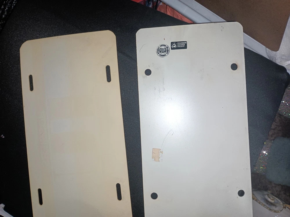 There's 2 plates in this set This vintage plastic license plate is a unique addition to any collection. The plate has a classic design and is perfect for display or as a decorative piece. The plate is made of durable plastic and has a sturdy attachment for easy hanging. This item is perfect for collectors of automobilia and transportation memorabilia. Add it to your collection today!