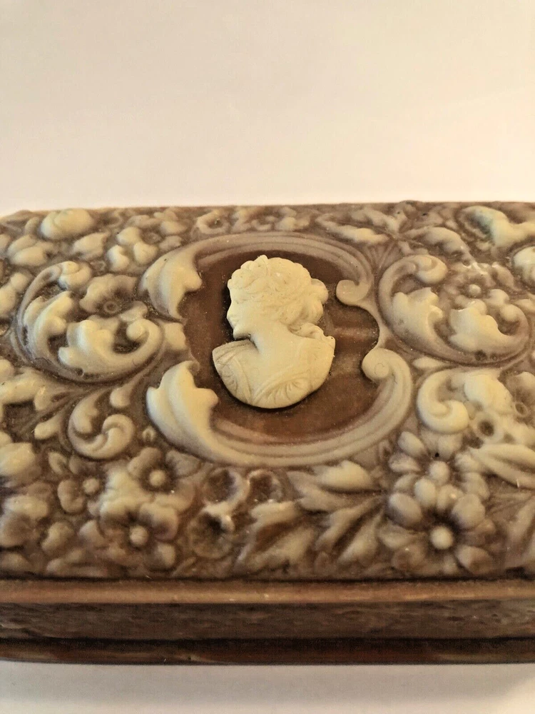 Crafted with care, this Vintage Incolay Stone Jewelry Box embodies the elegance of the Victorian era. The matte brown finish complements its classic cameo design, offering a timeless appeal for all occasions. Small yet sophisticated, this trinket box measures 5 inches in length, making it an ideal keepsake for your cherished jewelry or mementos.Proudly made in the United States, the box is a part of the exclusive Keepsake Boxes collection, renowned for its quality and style. It arrives neatly boxed, ensuring it remains pristine over time. With its durable stone construction, this piece is not just a container but a testament to the craftsmanship of bygone days.