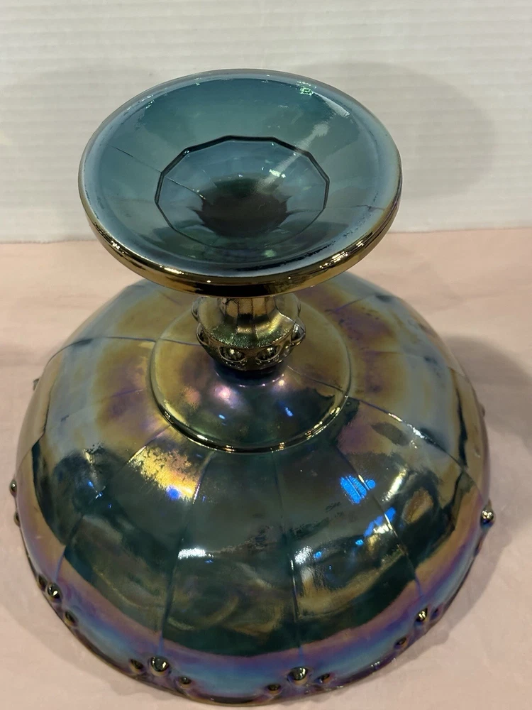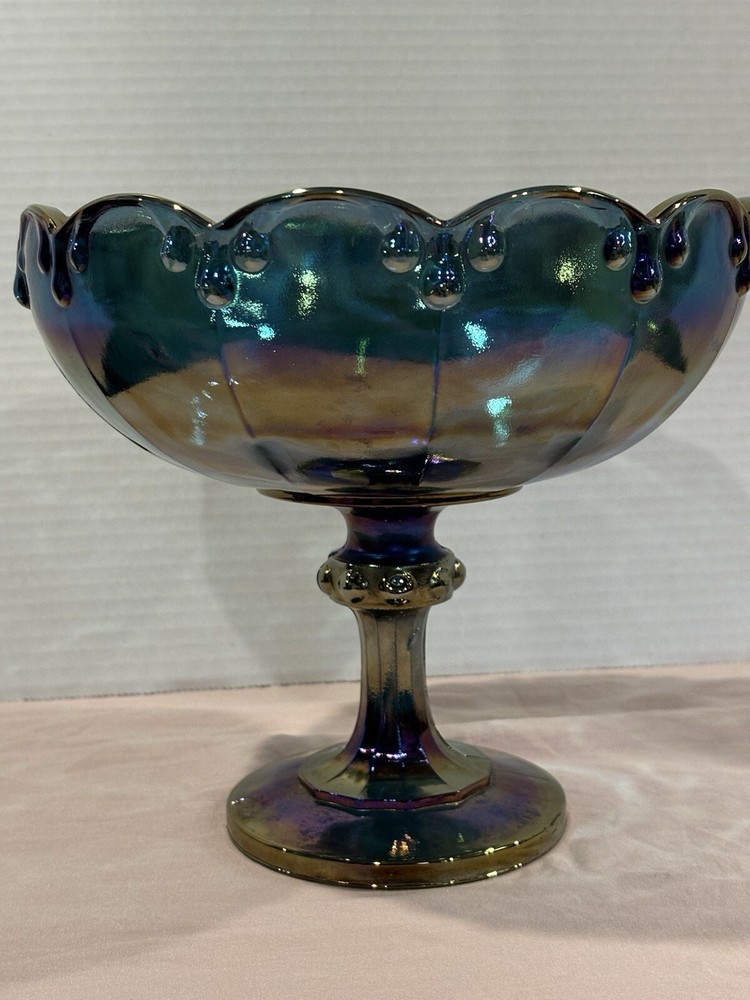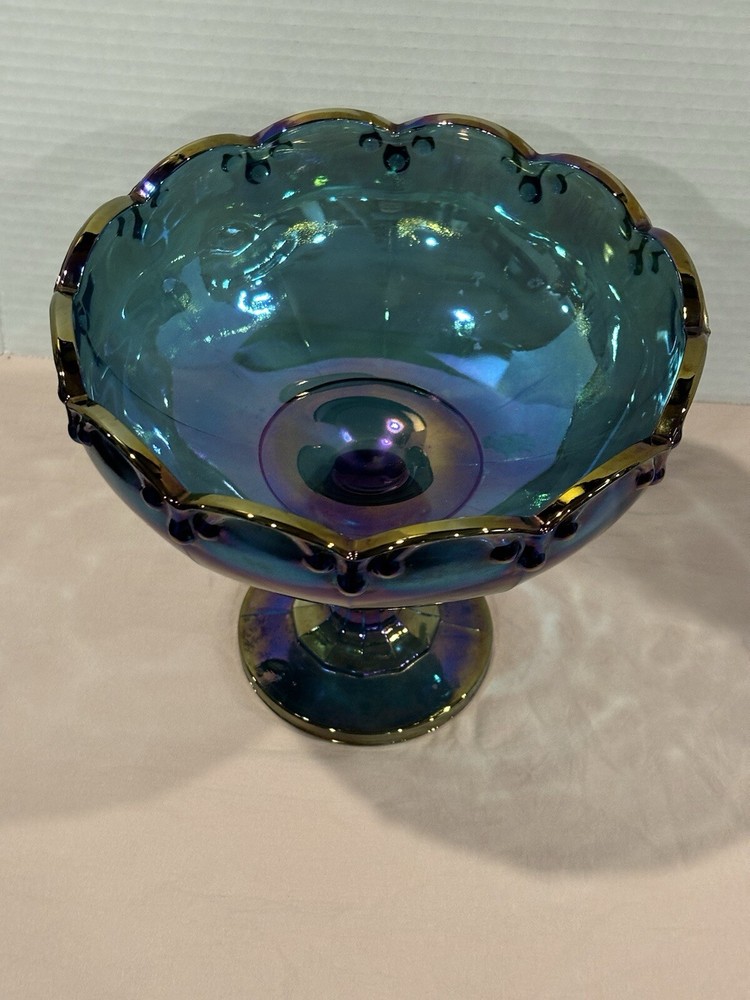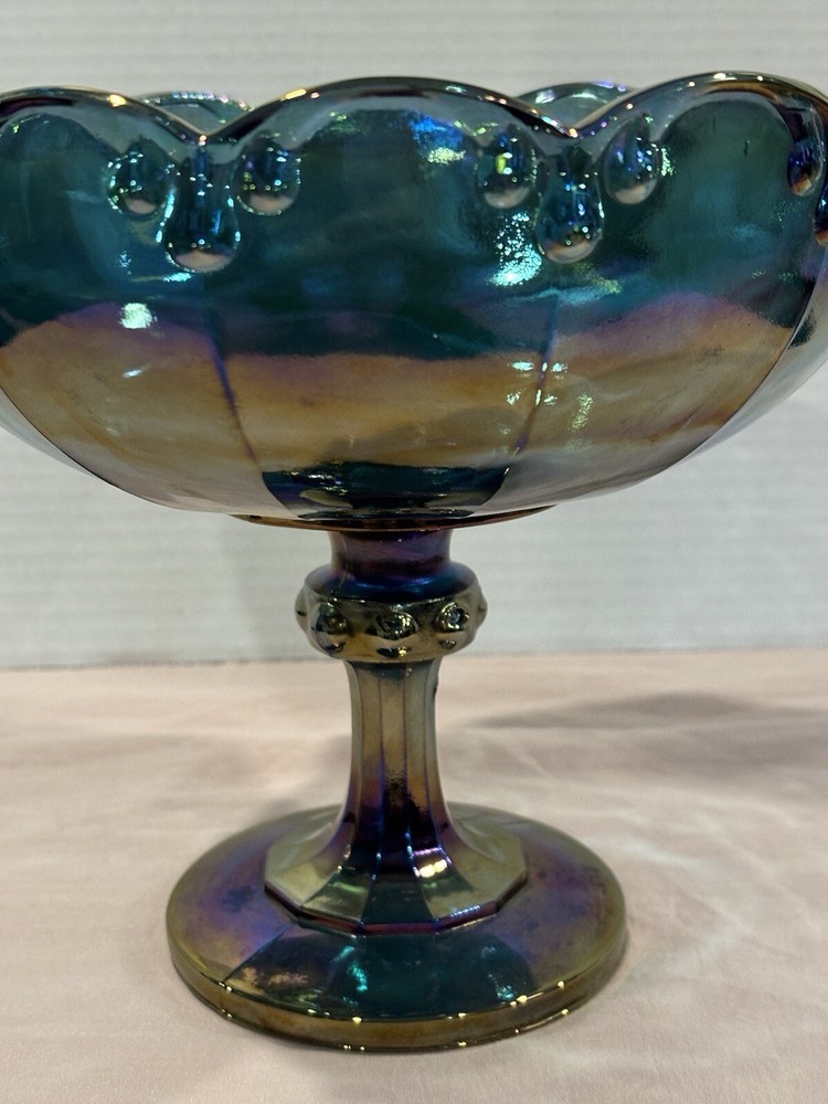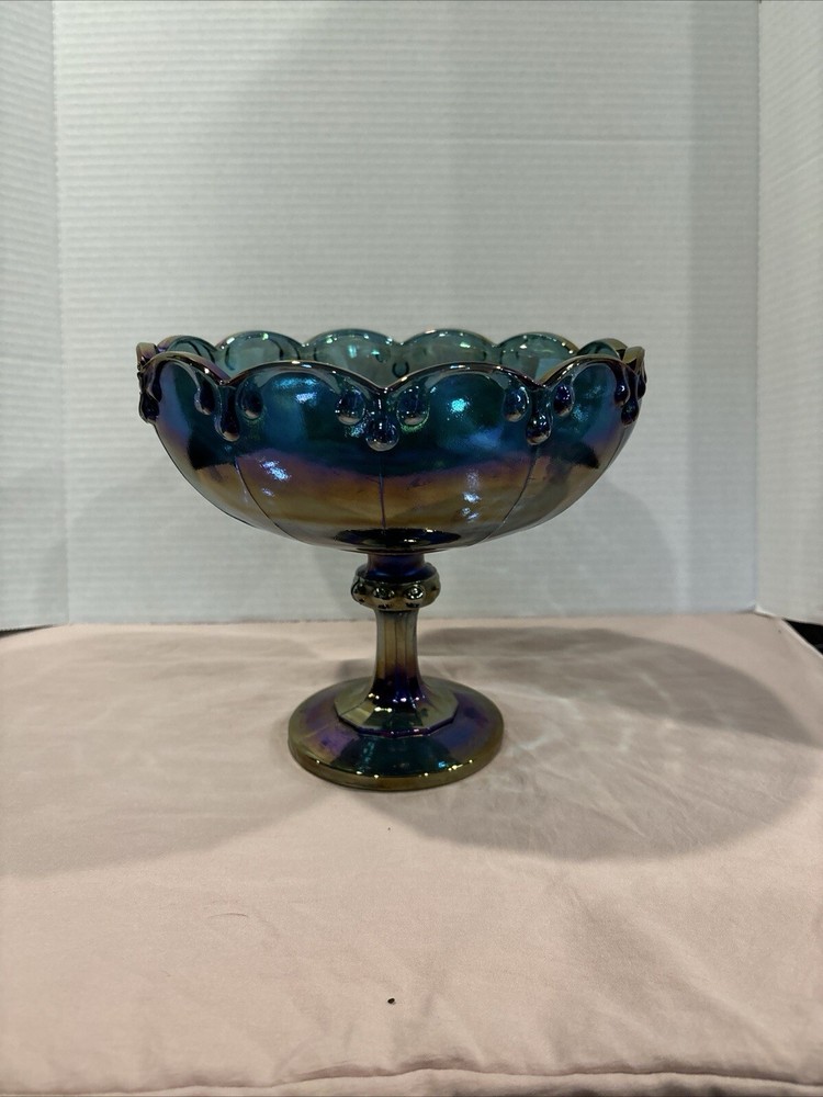 This is a vintage Indiana blue iridescent carnival glass footed compote featuring a Garland pattern. The fruit bowl has a glossy finish and is 7.5 inches in height with a diameter of 8 inches. It is a decorative piece with a contemporary style, perfect for all occasions. Made by Indiana Glass in the mid-20th century, this original carnival glass item is a souvenir that showcases the heritage of Indiana glassmaking.