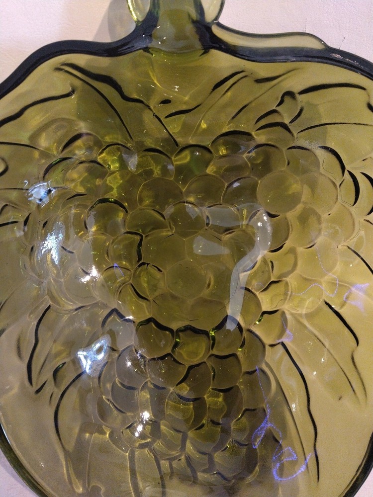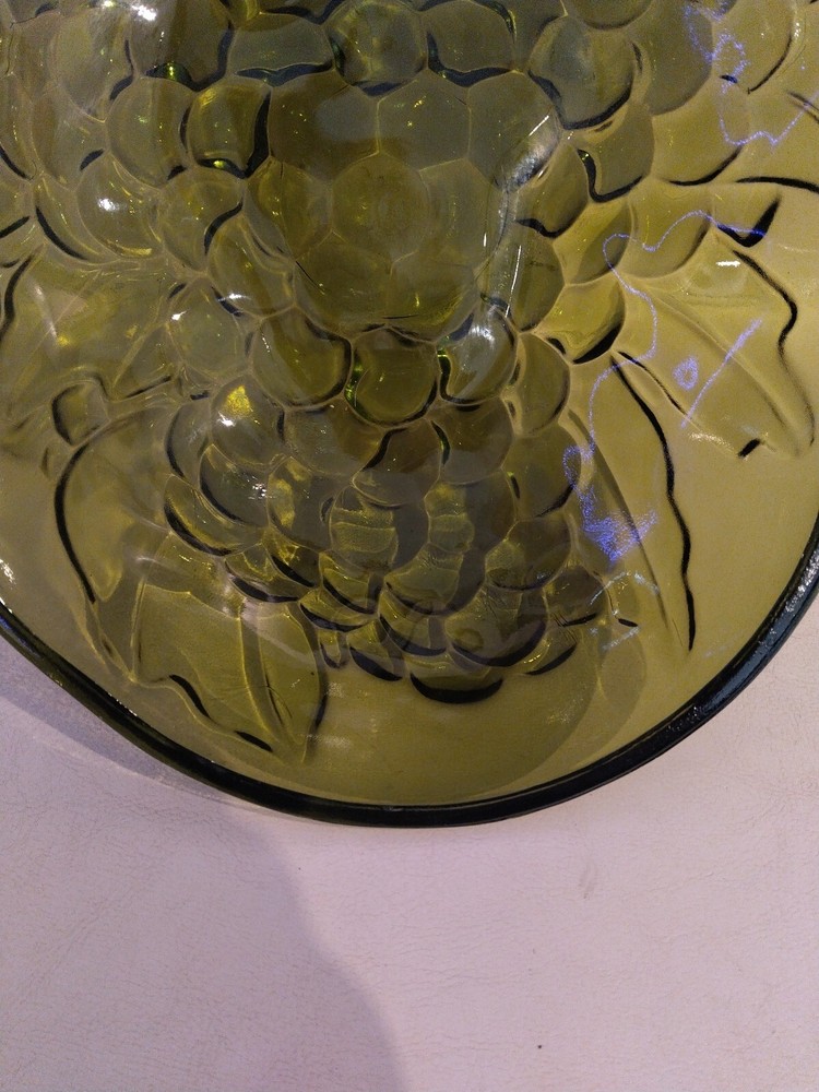 This vintage bowl from Indiana Glass features an abstract shape, with an avocado green glossy finish and an embossed grapes design. The bowl is made of fused glass and measures 13 inches in length, 9 1/2 inches in width, and 3 1/2 inches in depth. It is an antique mid-century modern piece, perfect for all occasions and as a decorative centerpiece. The bowl is an original, licensed reproduction from the Century product line and is hand wash only. This item is a great addition to any collection of decorative cookware, dinnerware, and serveware. One small manufacturer defect in bowl. No cracks, excellent condition. Please see photos. All offers considered. Will combine shipping on multiple items.